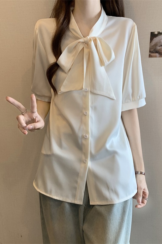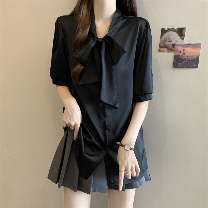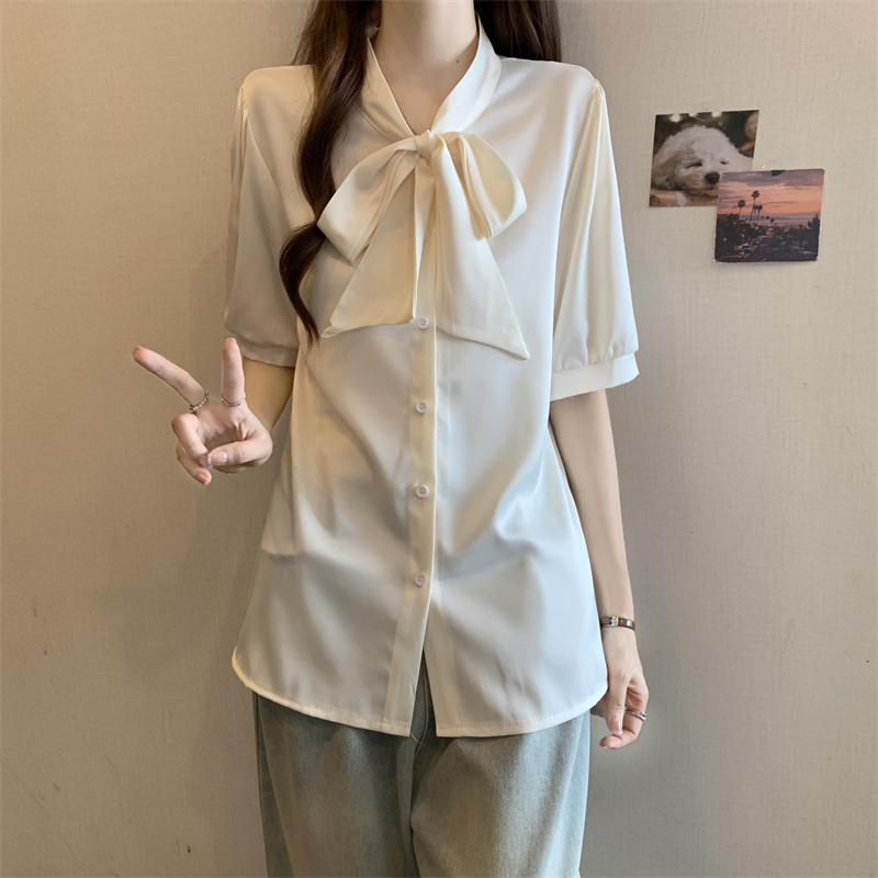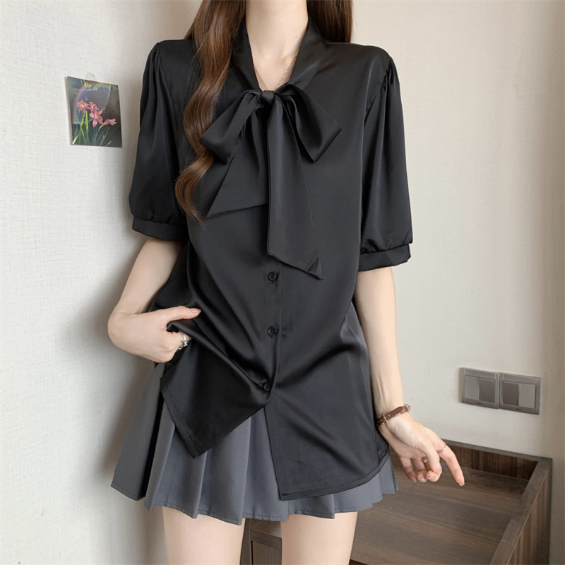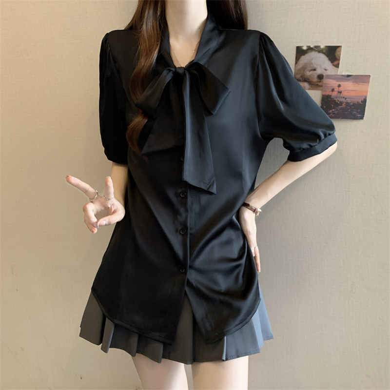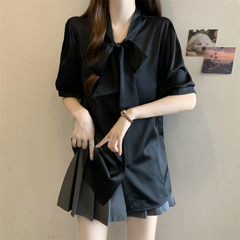 빅 사이즈 나비 매듭 여성 셔츠 여름 지방 mm 고급 센스 반팔 새틴 셔츠 쉬폰 톱