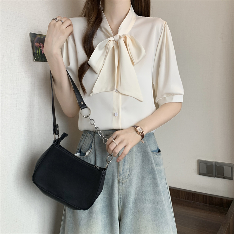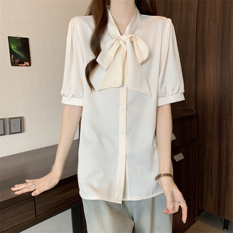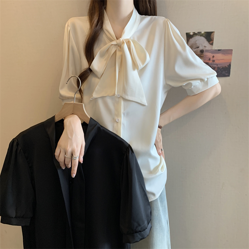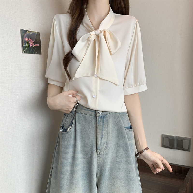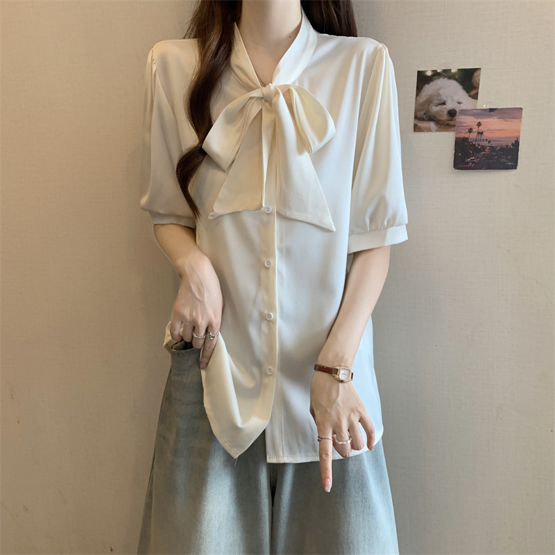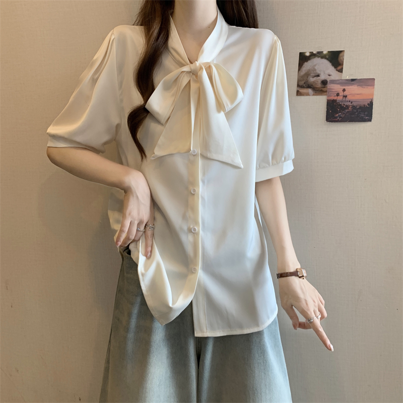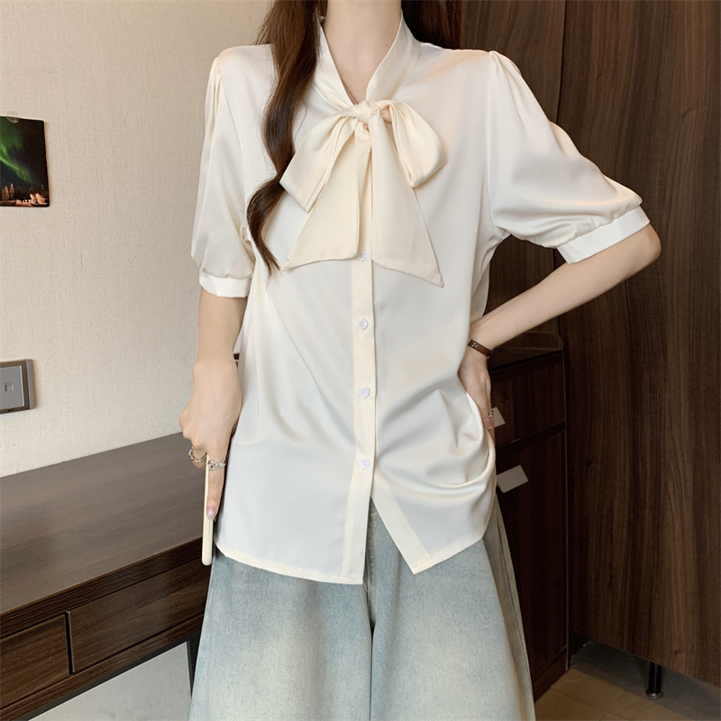 빅 사이즈 나비 매듭 여성 셔츠 여름 지방 mm 고급 센스 반팔 새틴 셔츠 쉬폰 톱