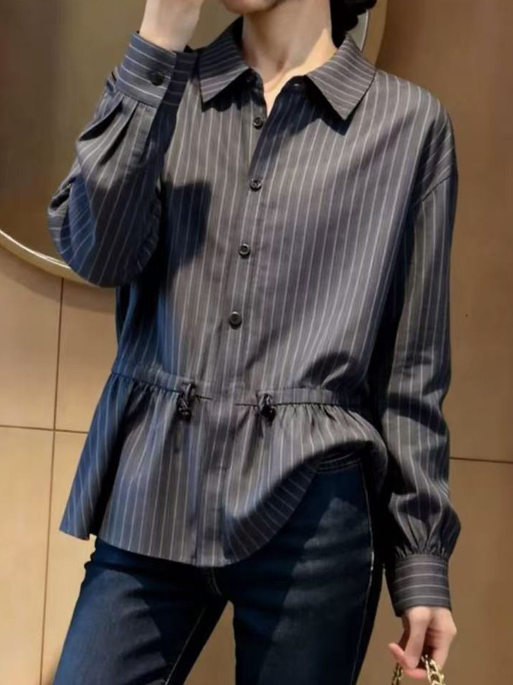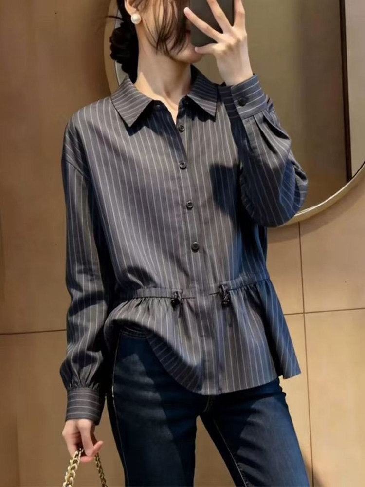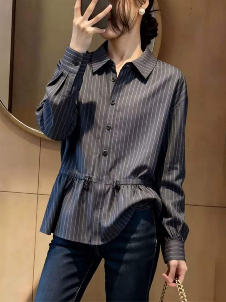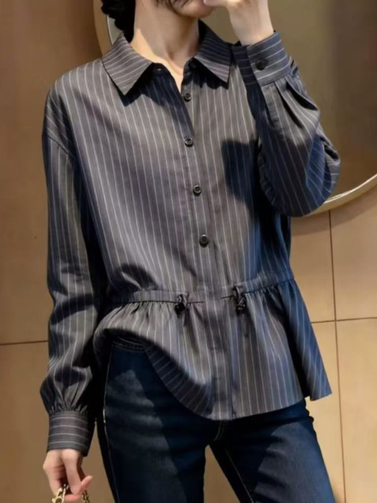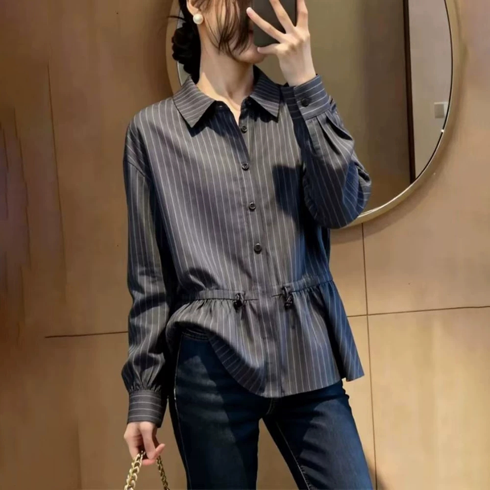 한 부서 디자인 센스 면 린넨 펌프 로프 허리 수축 스트라이프 여성 셔츠 봄 미니멀리즘 다용도 품격 다용도 루즈핏 맨위