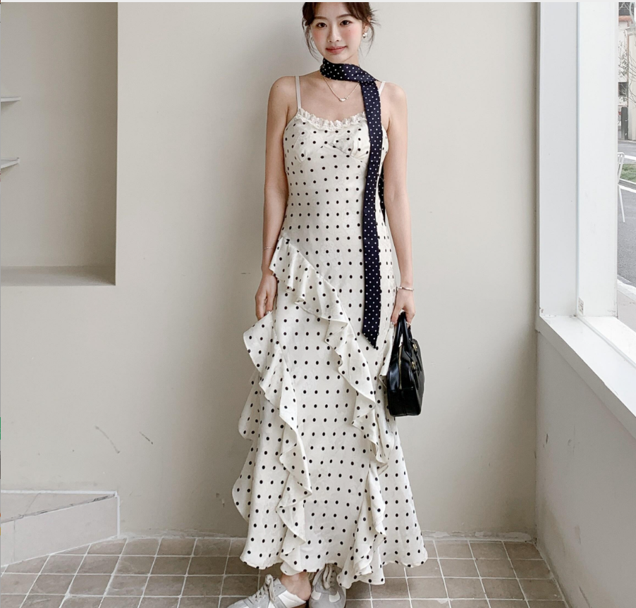 실사 빅 사이즈 프랑스식 차 휴식 부드러운 품격 V넥 여성 드레스 허리 수축 슬림해 보이는 디자인 센스 해변 롱 스커트