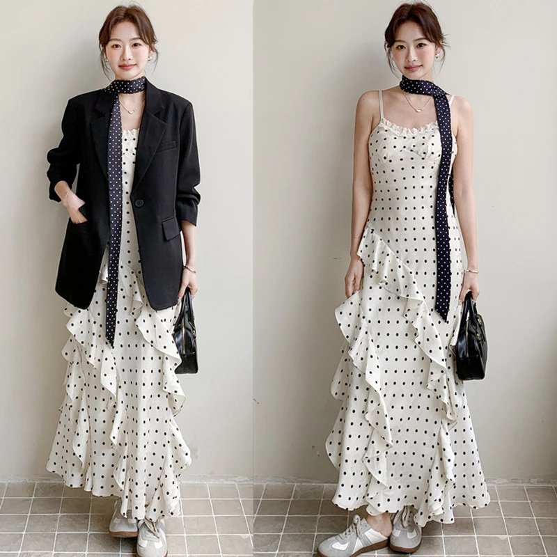 빅 사이즈 여성 의류 도트 무늬 점프 슈트 치마 세트 여성 여름 슬림해 보이는 출퇴근 고급 센스 블랙 니트 재킷 투피스 세트