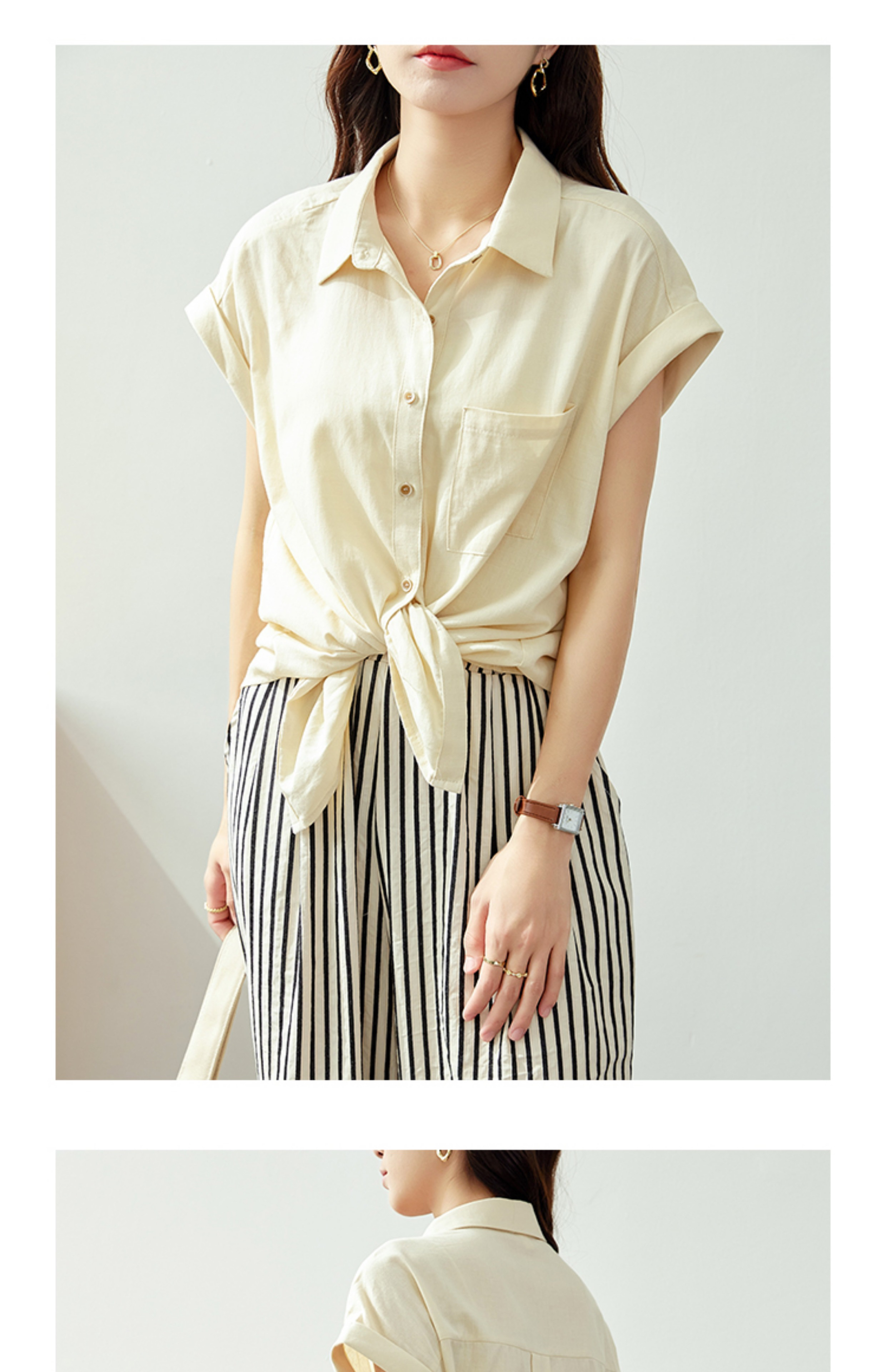 프랑스식 살구 색상 면 린넨 반팔 여성 셔츠 여름 얇은 스타일 작은 키 루즈핏 셔츠 아마 출퇴근 폴로 칼라 맨위