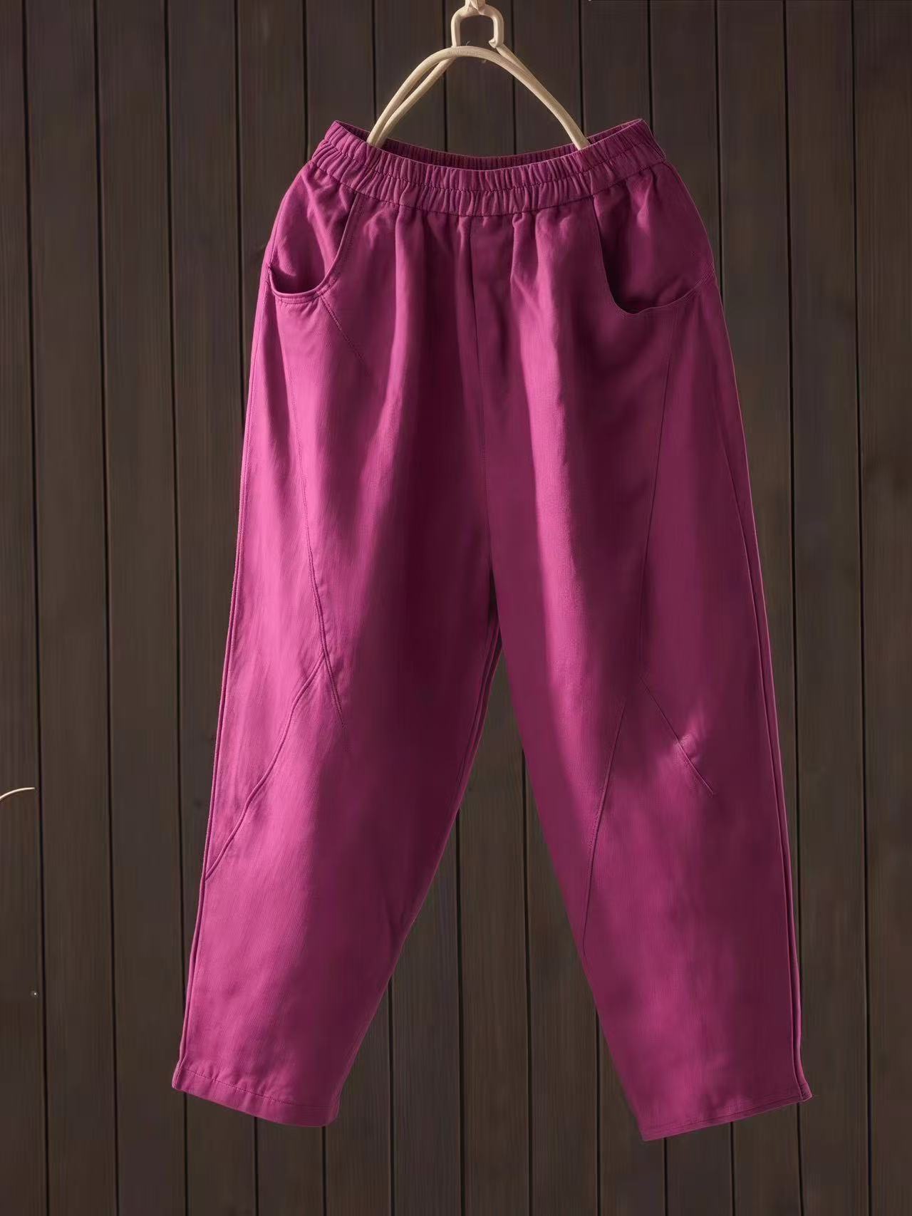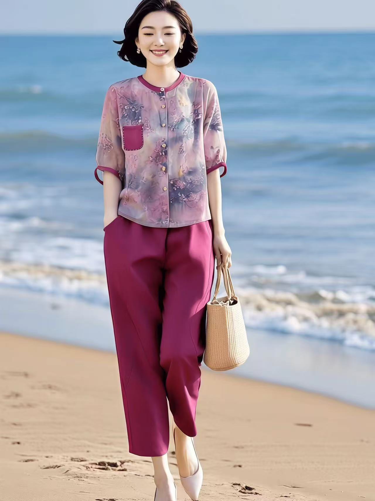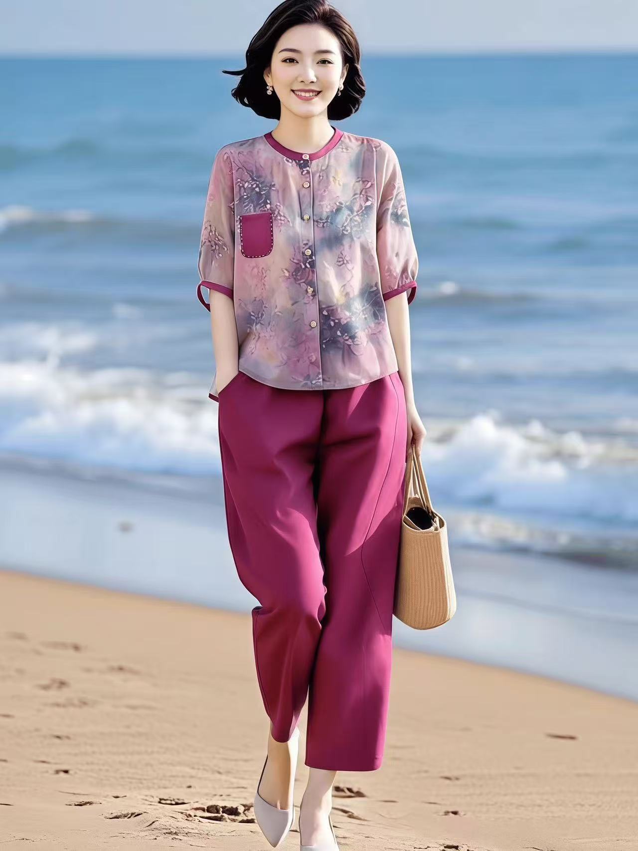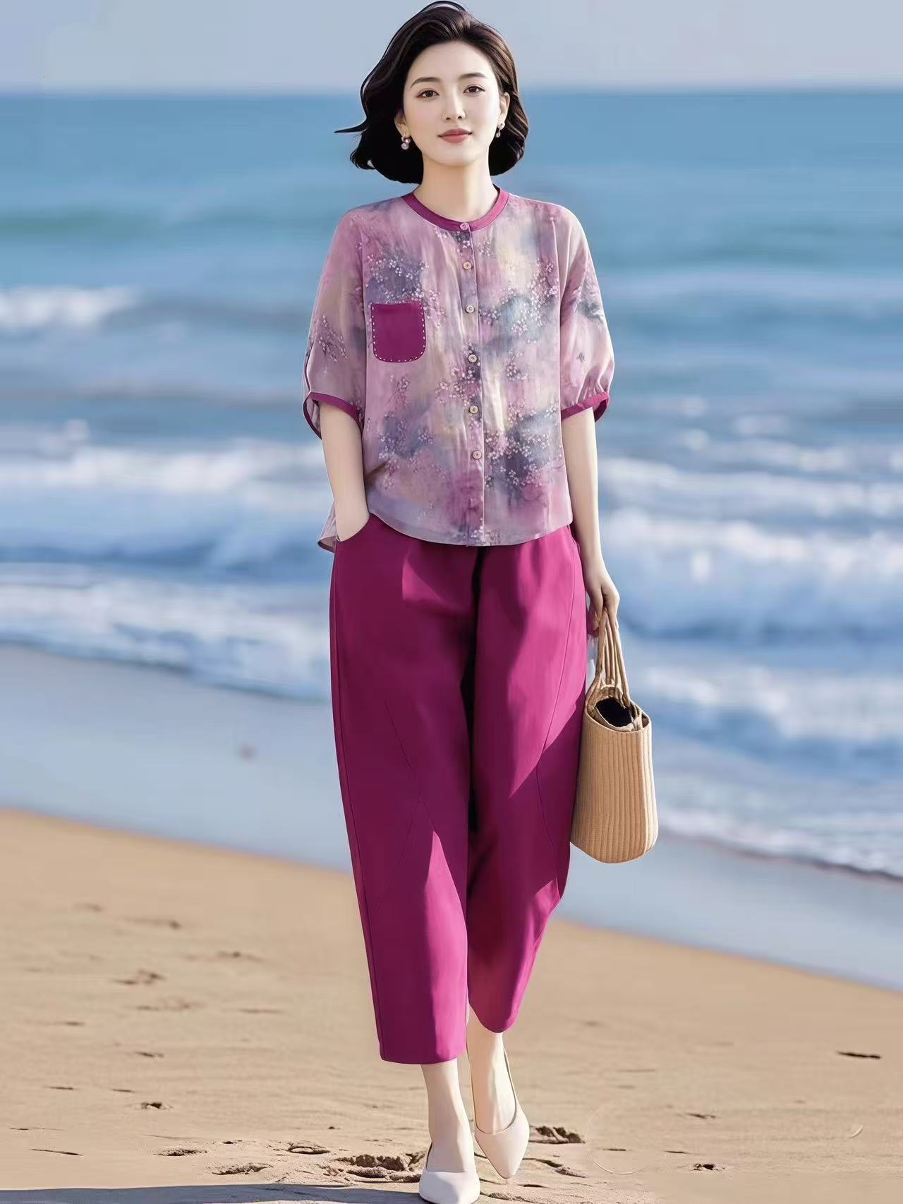 여름 색상 라스베리 빨간색 프린트 셔츠 허리밴드 하렘 바지 세트