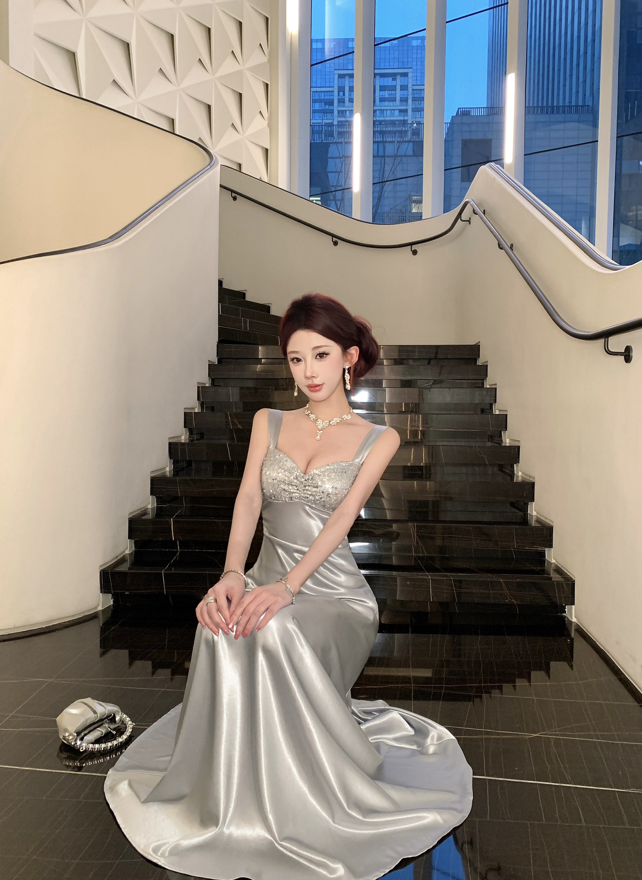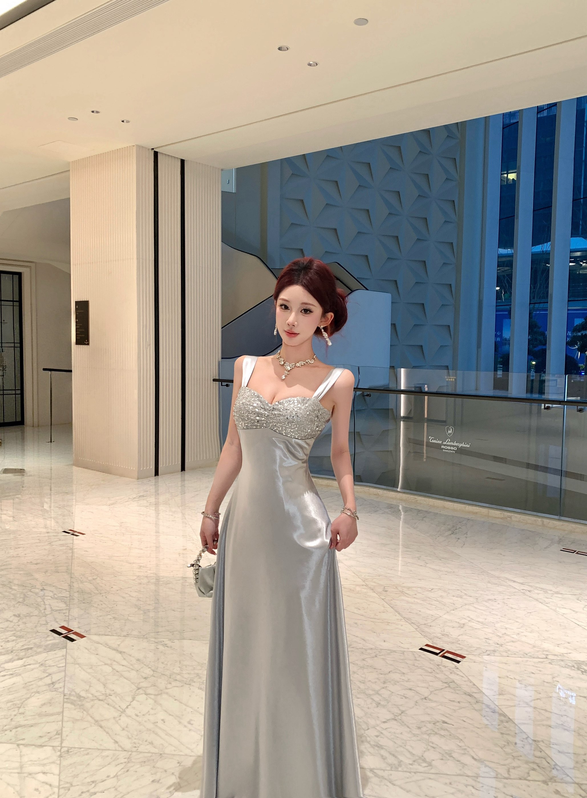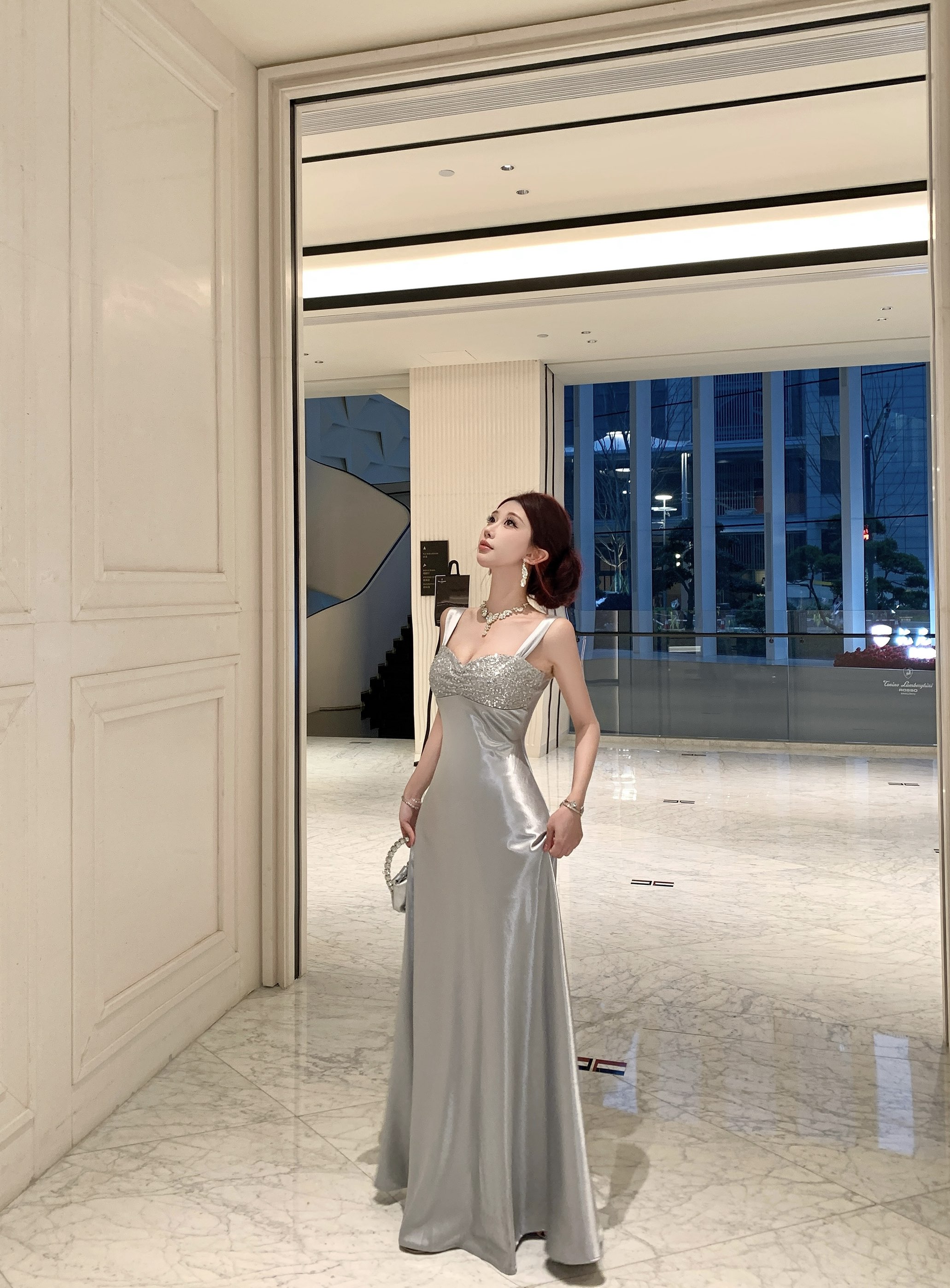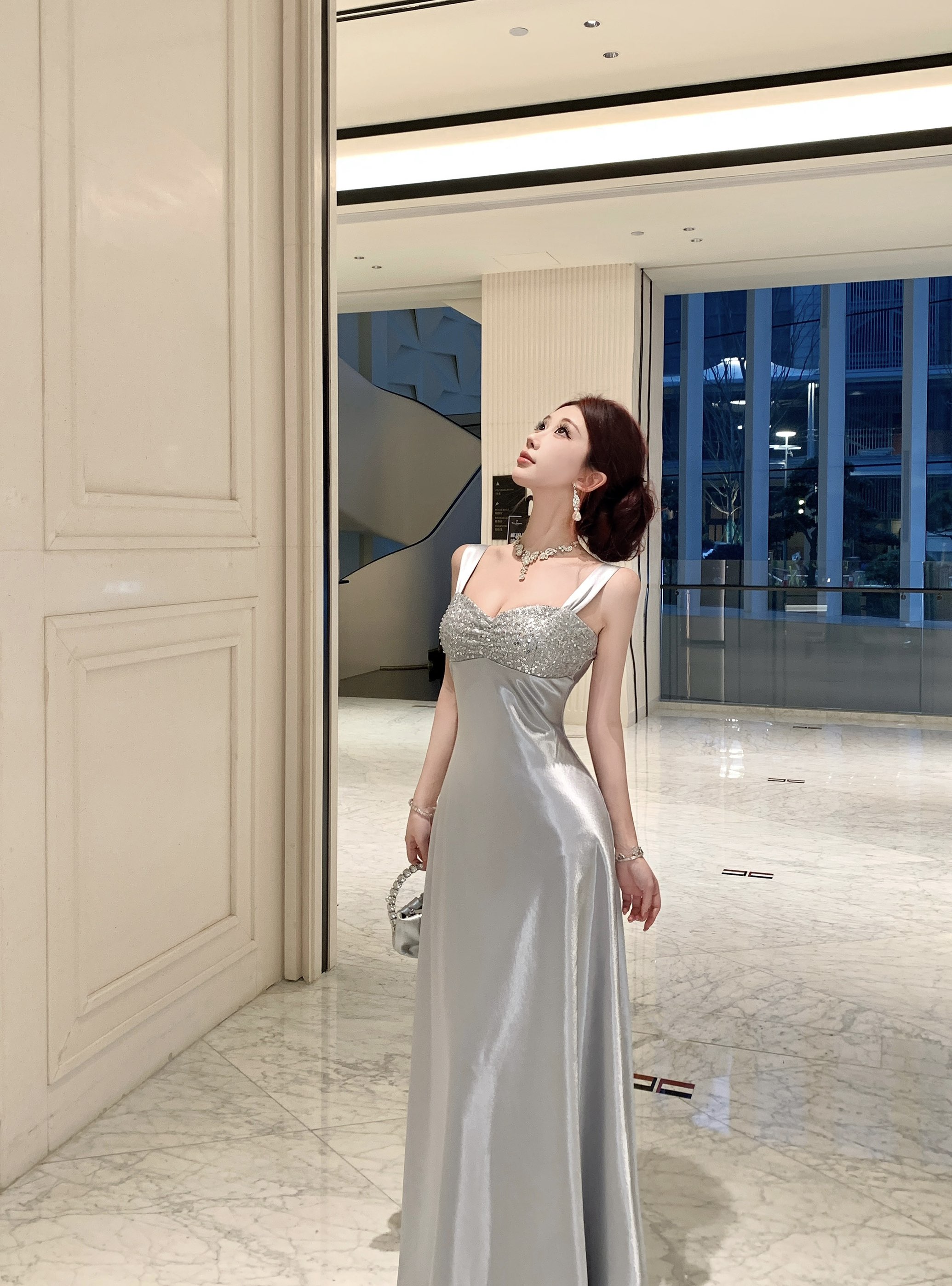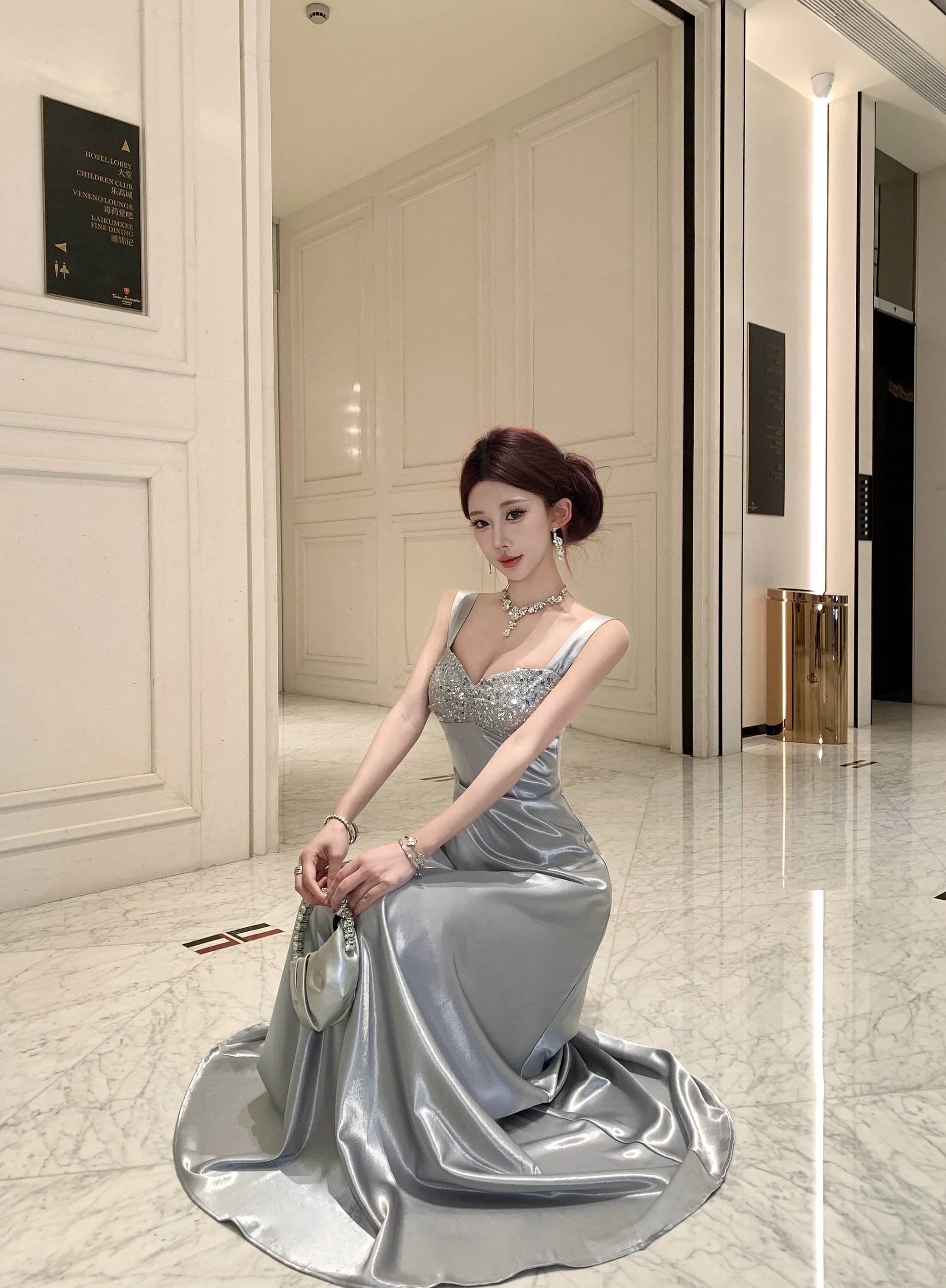 실사 정가 고급 센스 슬립 스팽글 패치워크 이브닝 드레스