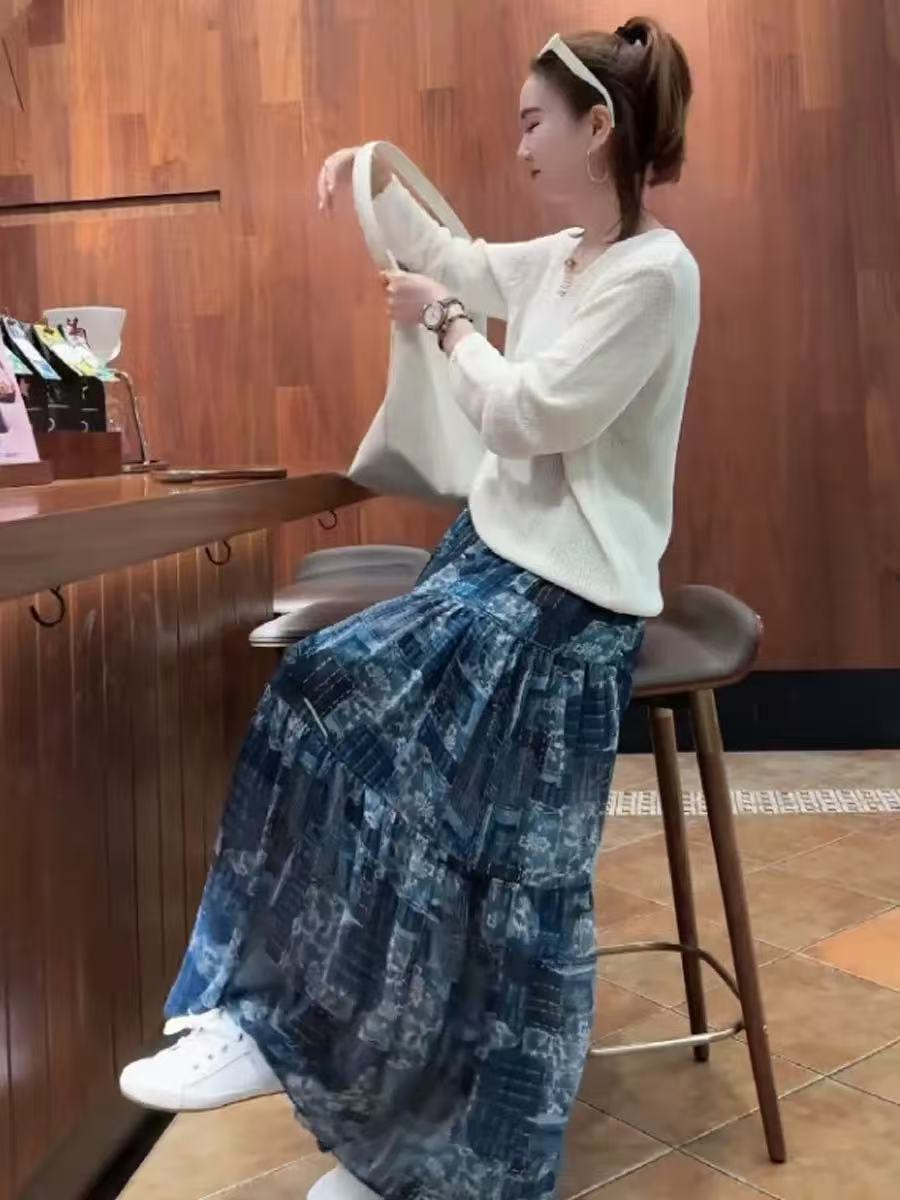 2026 고급 센스 여름 새로운 차가운 니트 스웨터 맨위 우아한 휴가 반신 롱 스커트 외국 가스 두 조각 여성 세트