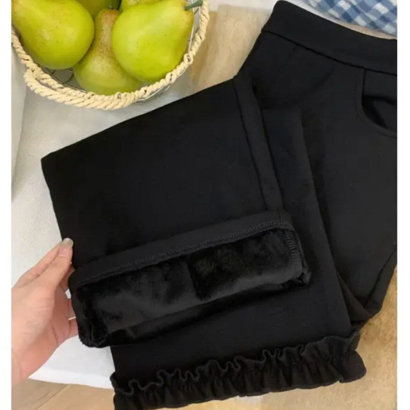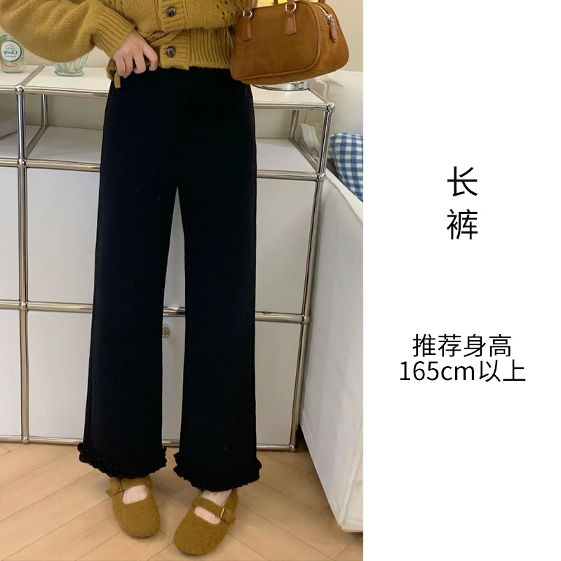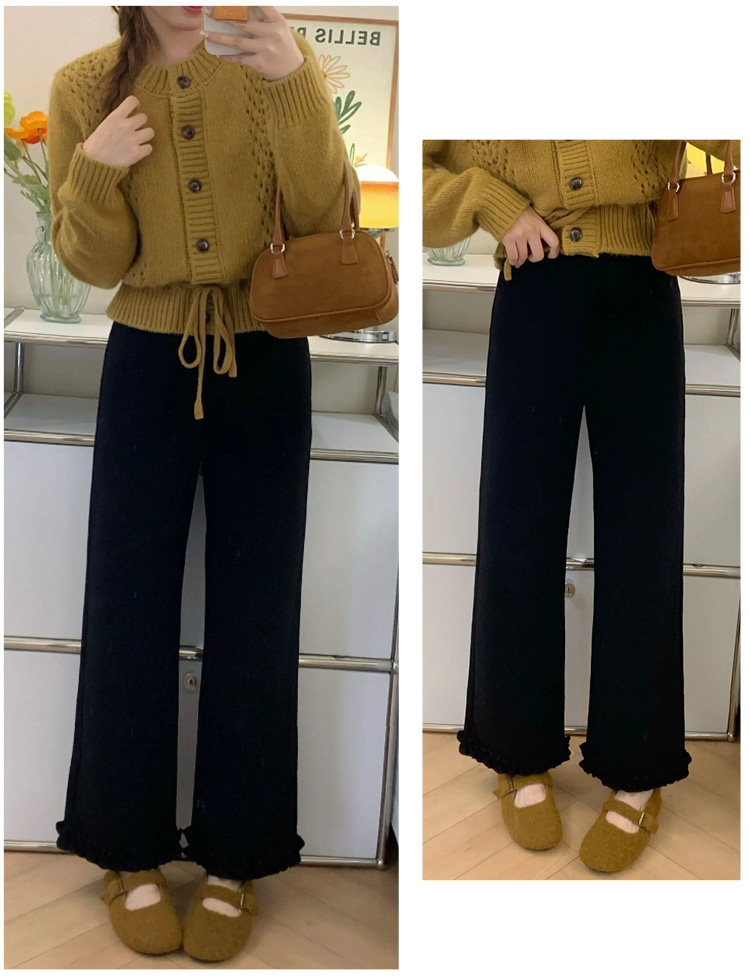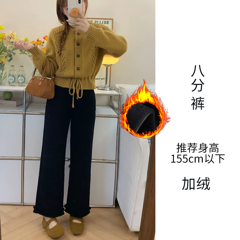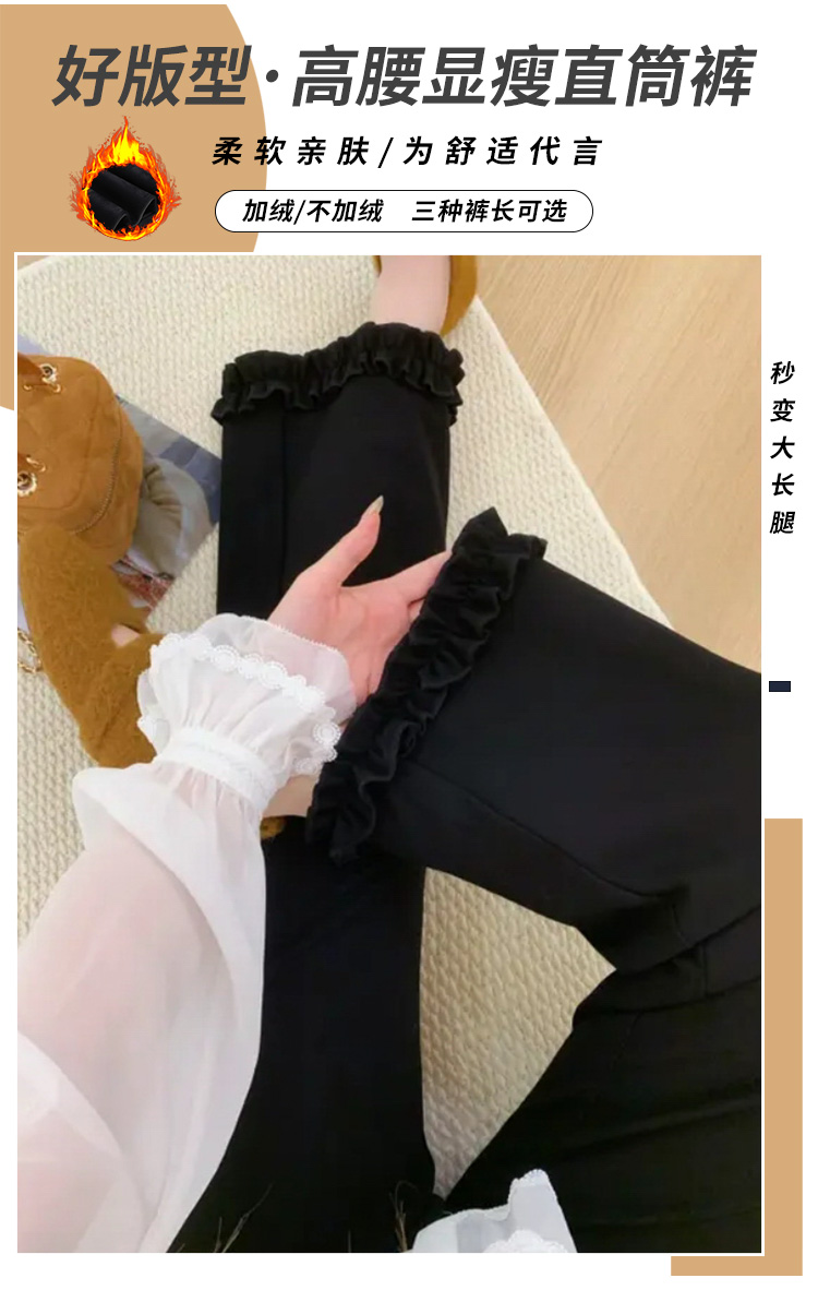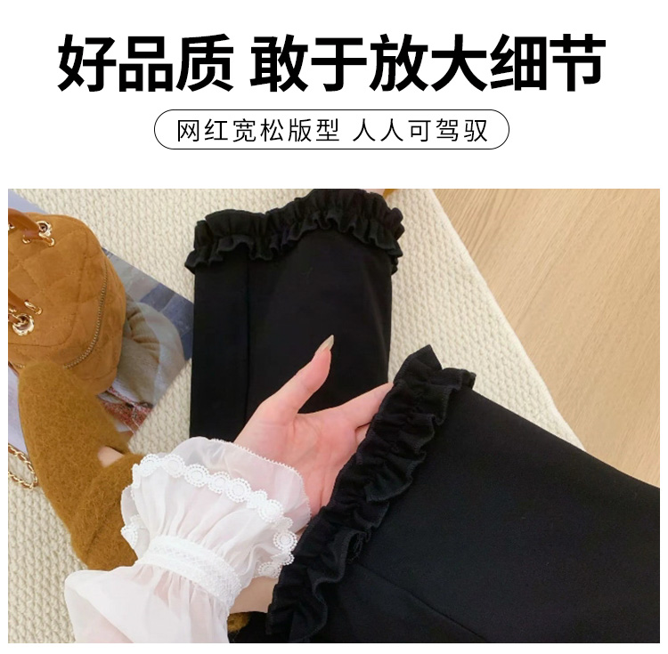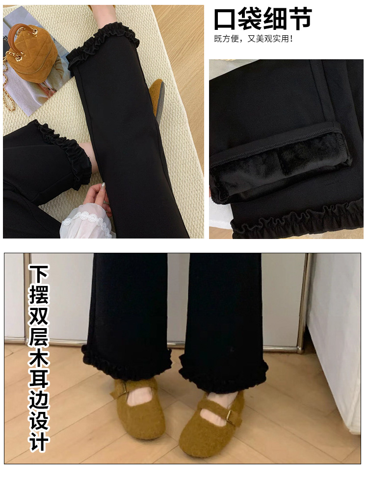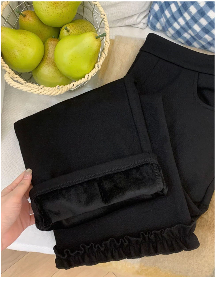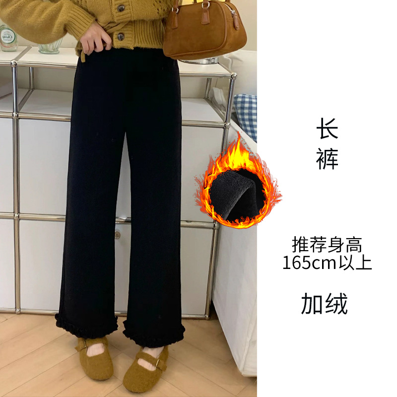 검정색 프릴 캐주얼 바지 여성 가을 겨울 털이 있고 두꺼운 작은 키 와이드 레그 팬츠 하이웨이스트 루즈핏 벽오동 바지