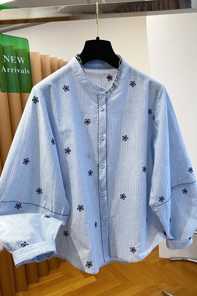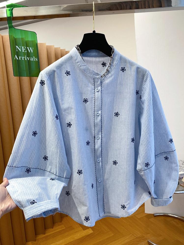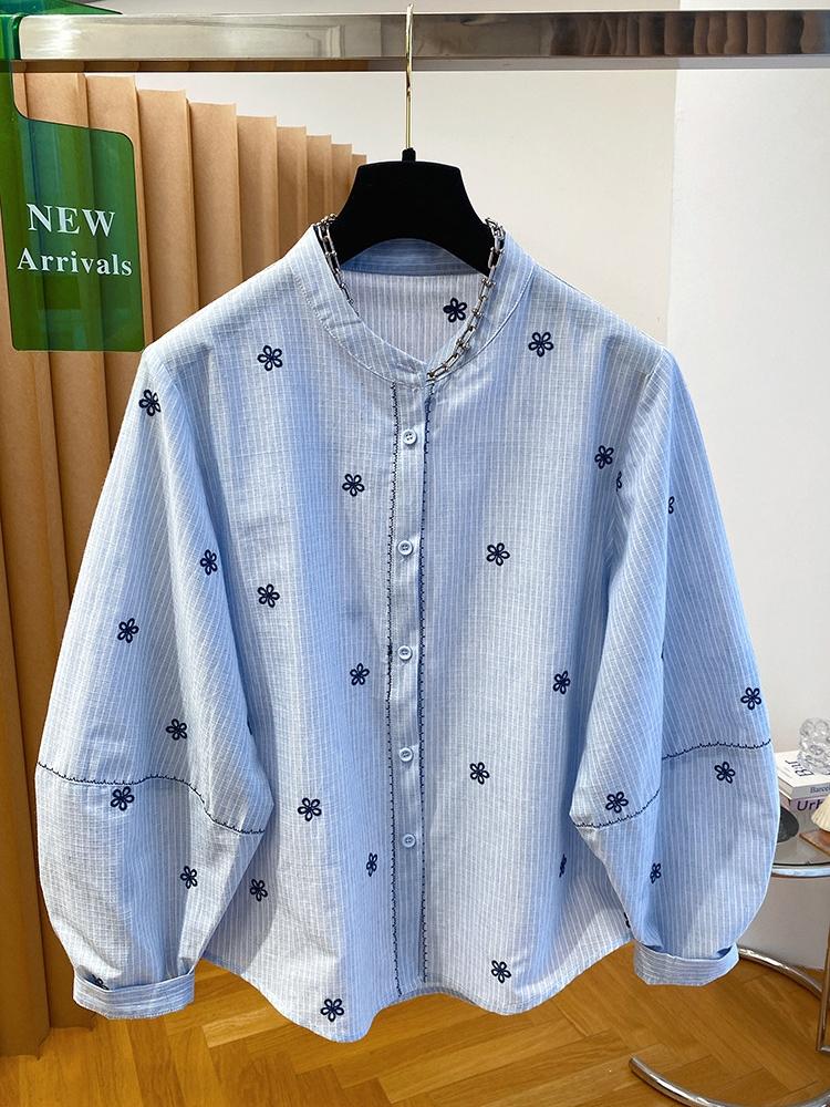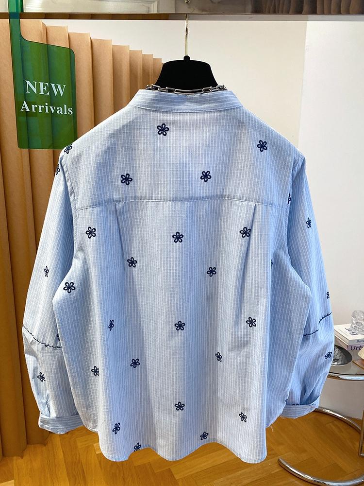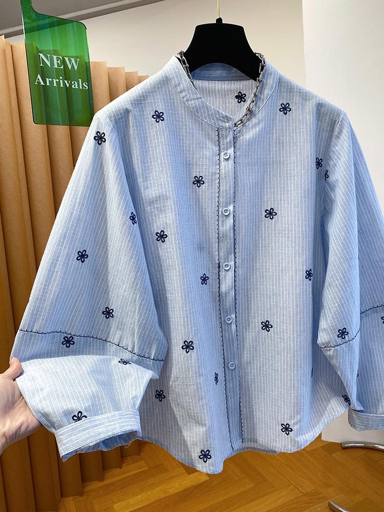 한 부서 파란색 스트라이프 셔츠 여성 긴 소매 2026 새로운 이른 봄 루즈핏 외국 가스 슈퍼 잘 생긴 꽃무늬 자수 맨위