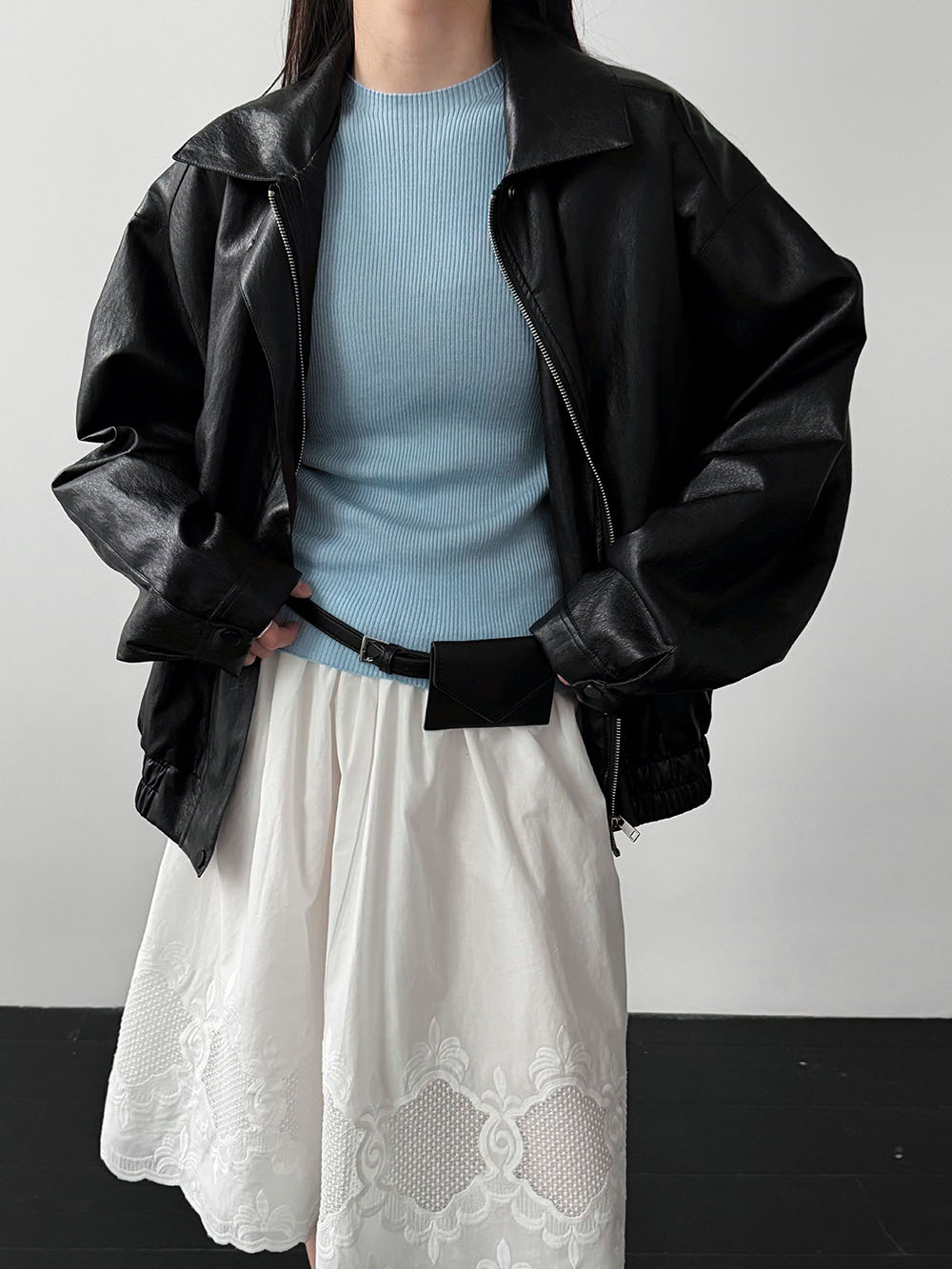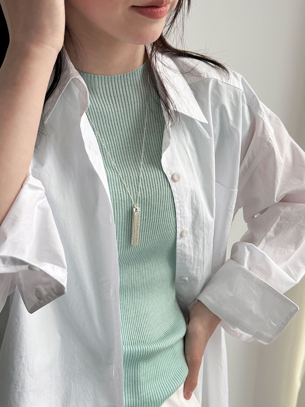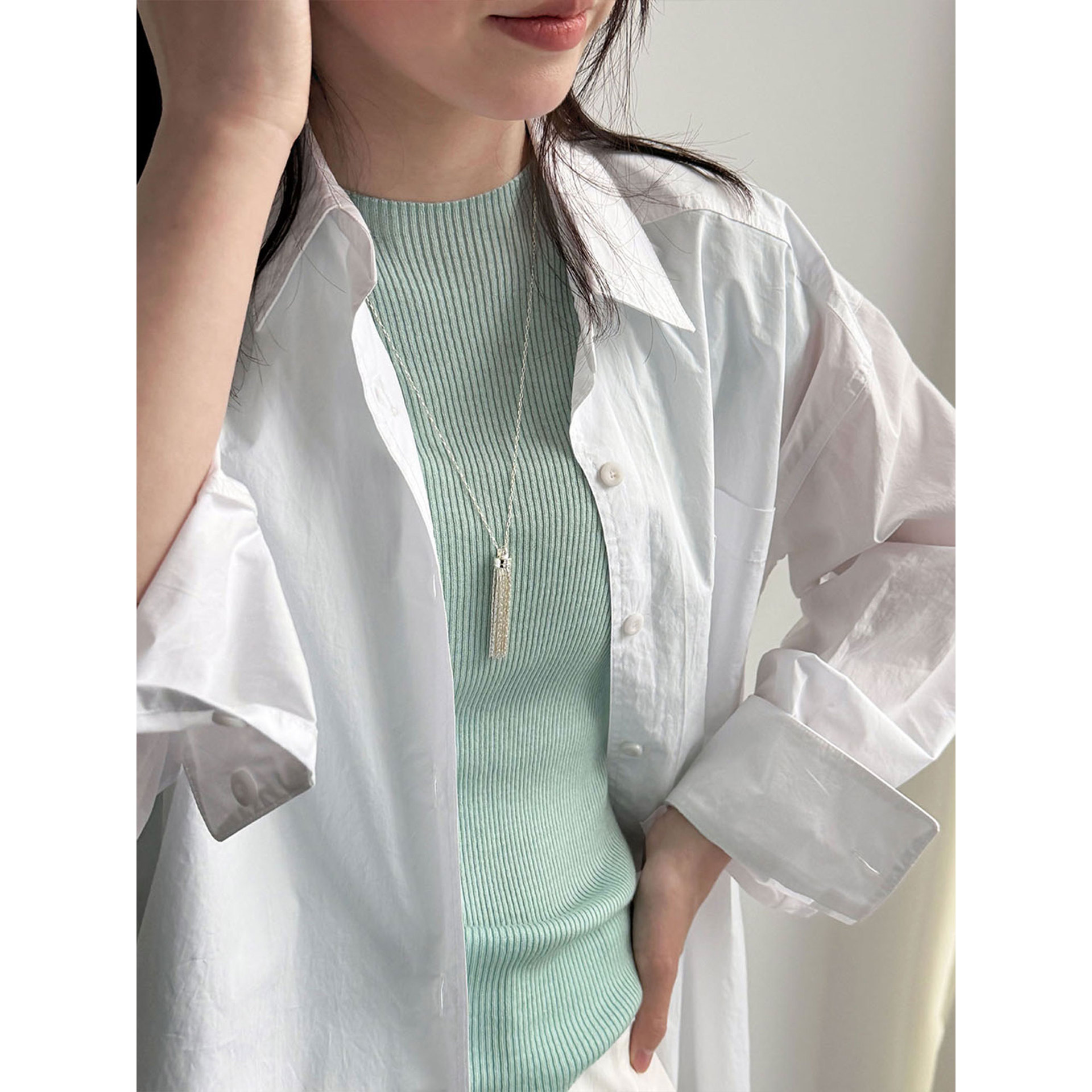미니멀리즘 다용도 긍정적 인 어깨 이중층 볼륨 측면 라운드 넥 티셔츠 26 봄 새로운 단추 디자인 센스 긴팔
