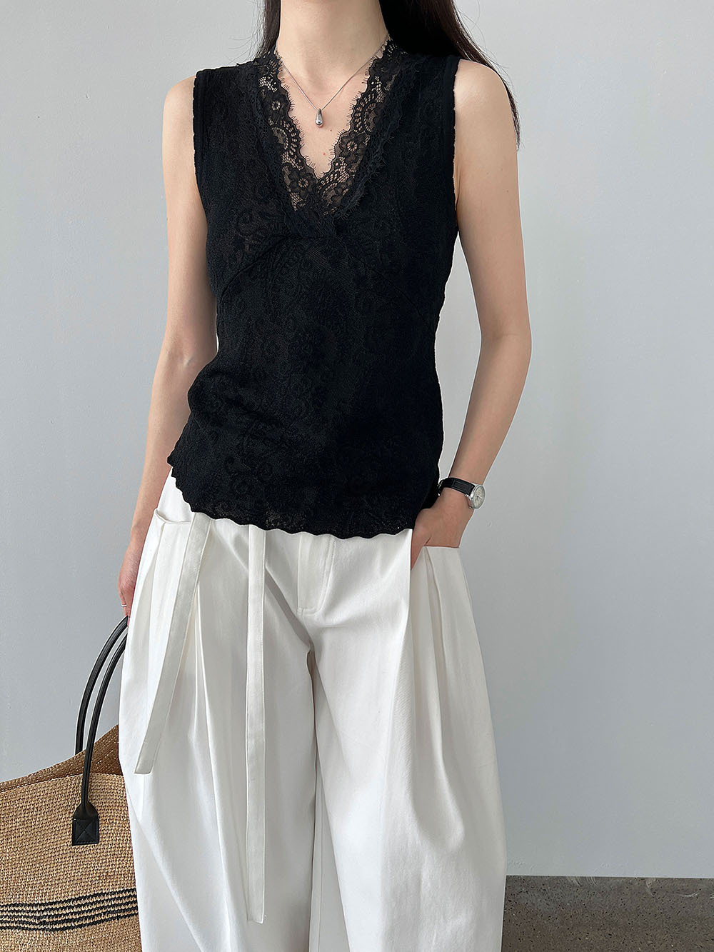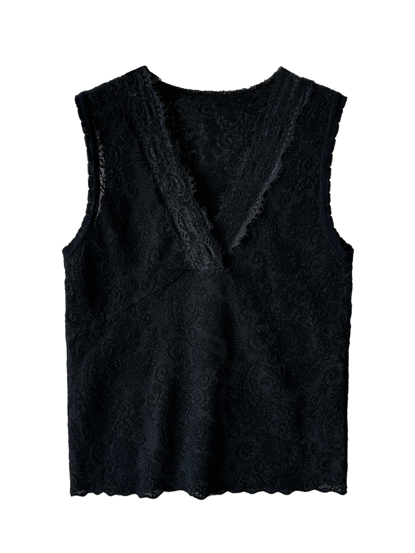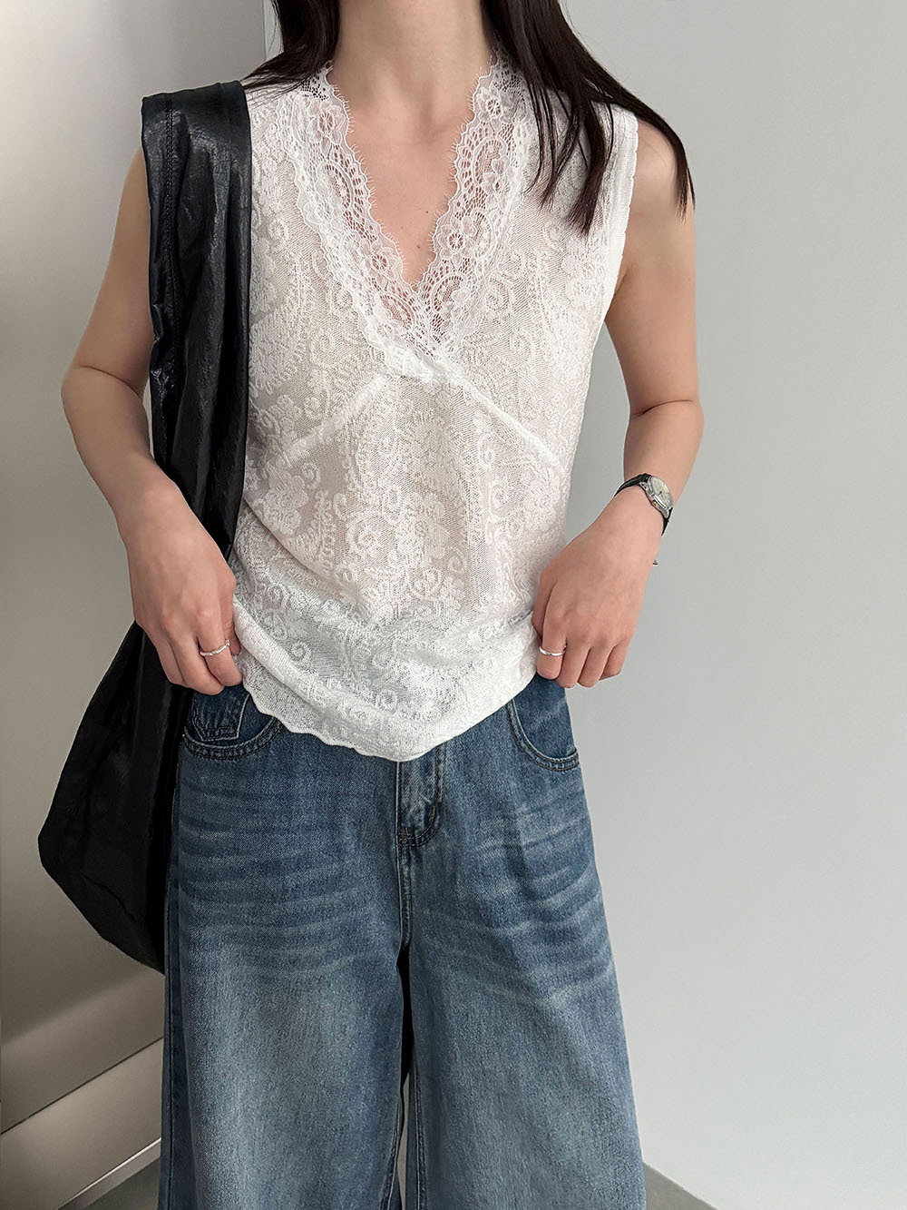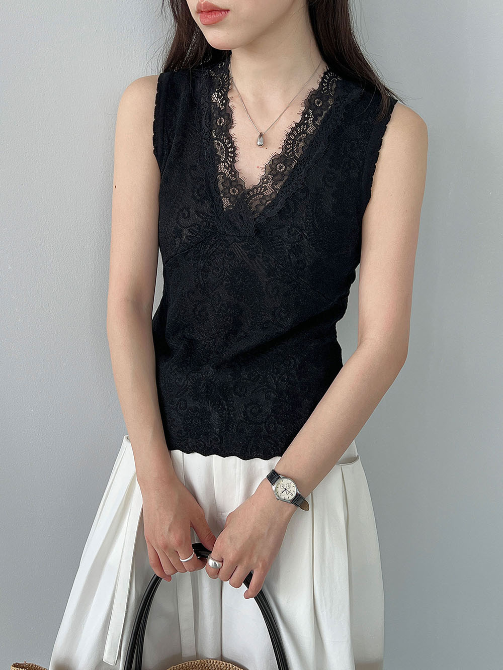 주간 실크 V넥 민소매 레이스 레이스 만나는 조끼 여성 26 봄 새로운 자카드 인사이드 잡아라. 의류