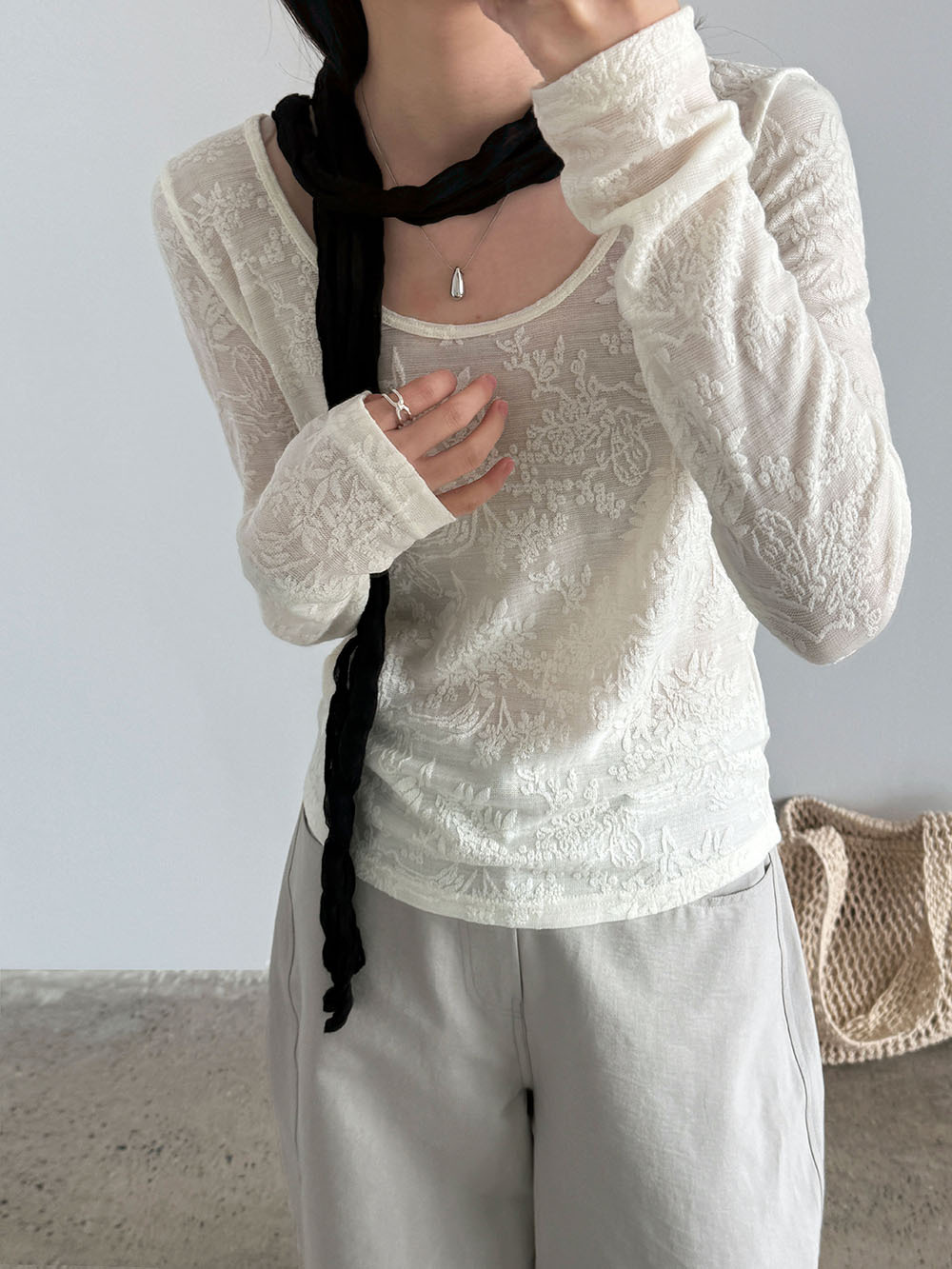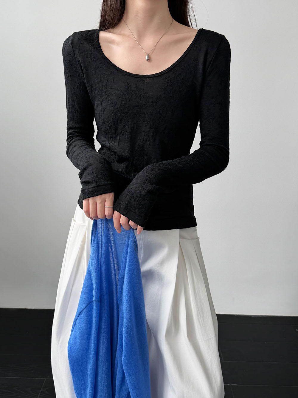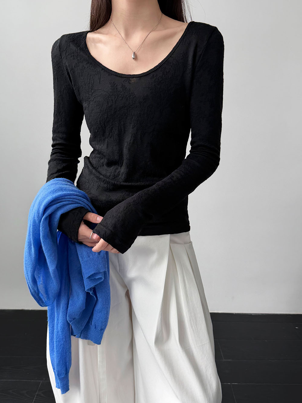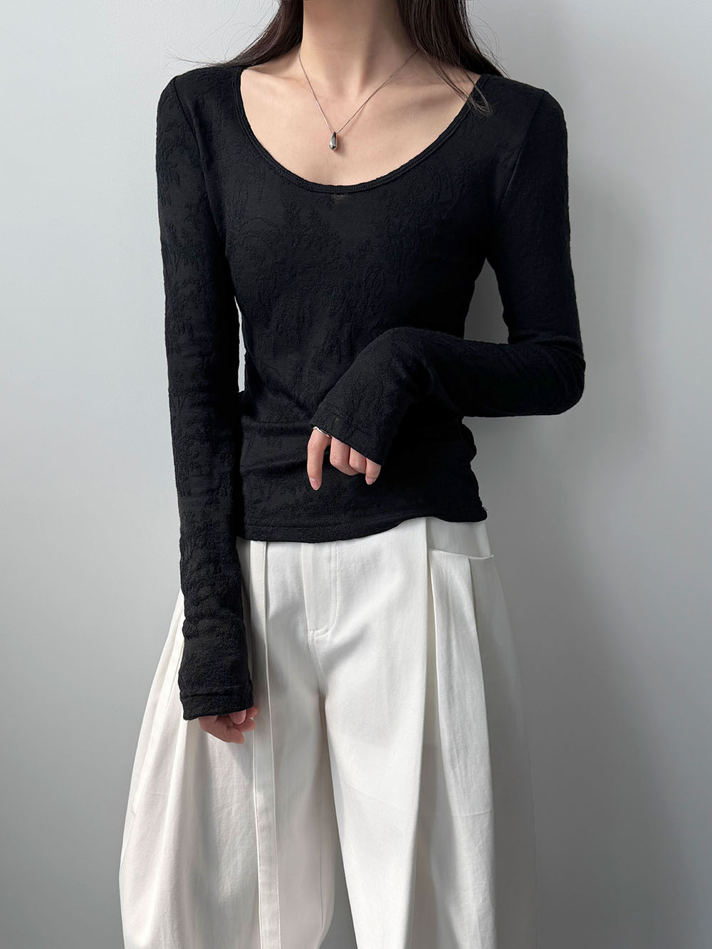 부드러운 무거운 작업 자카드 대 u 칼라 마이크로 ~을 통해 질감 센스 기본 셔츠 여성 봄 새로운 품격 맨위 티셔츠