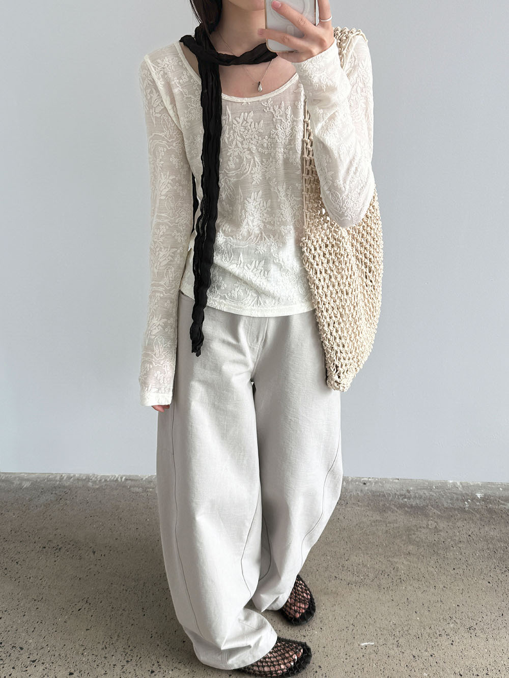 캐주얼 루즈핏 홀로우 아웃 세트 여성 여름 디자인 센스 라운드 넥 티셔츠 하이웨이스트 반바지