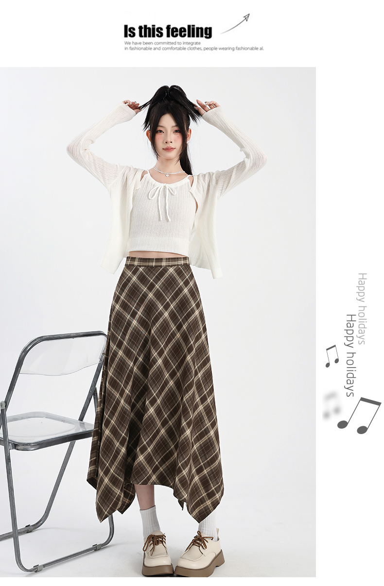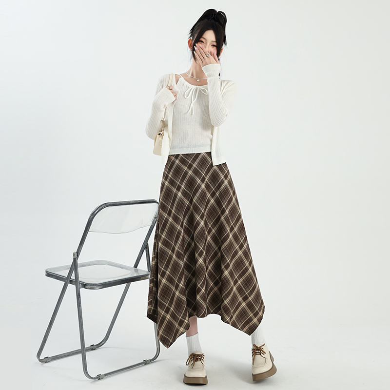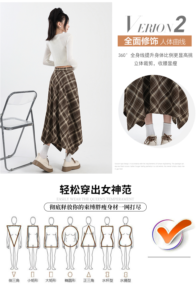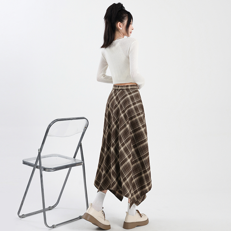 레트로 체크무늬 불규칙 밑단 반신 스커트 빅 사이즈 여성 의류 하이웨이스트 슬림해 보이는 커피 색상 체크무늬 큰 진자 치마