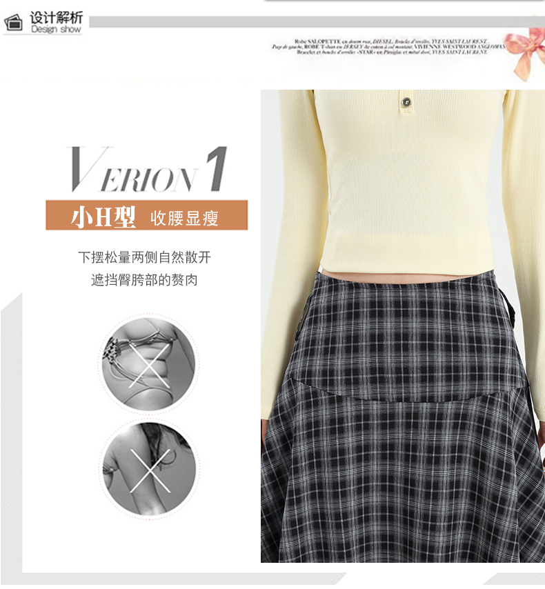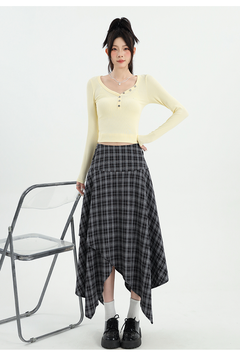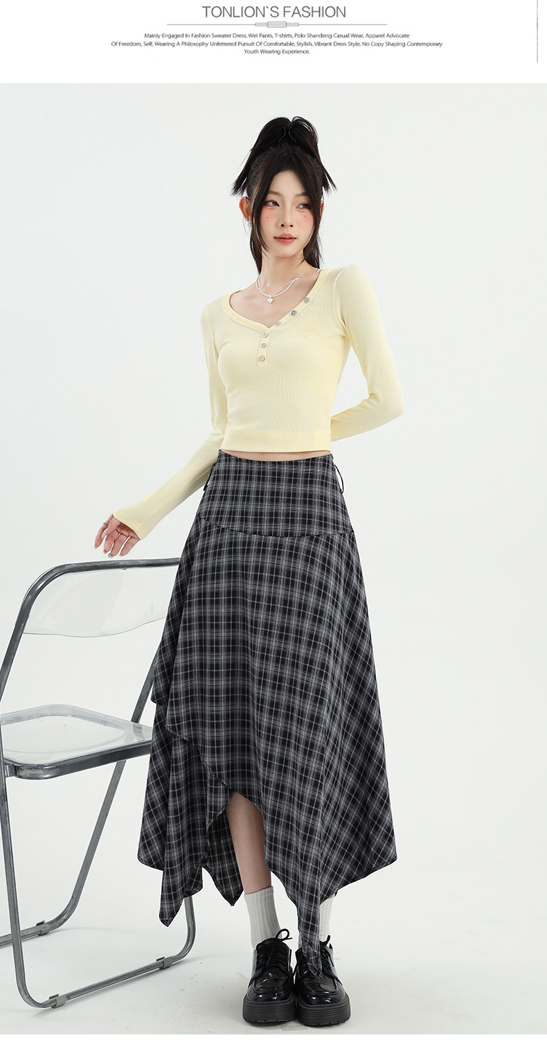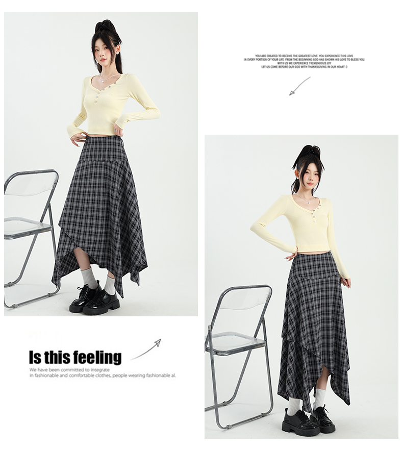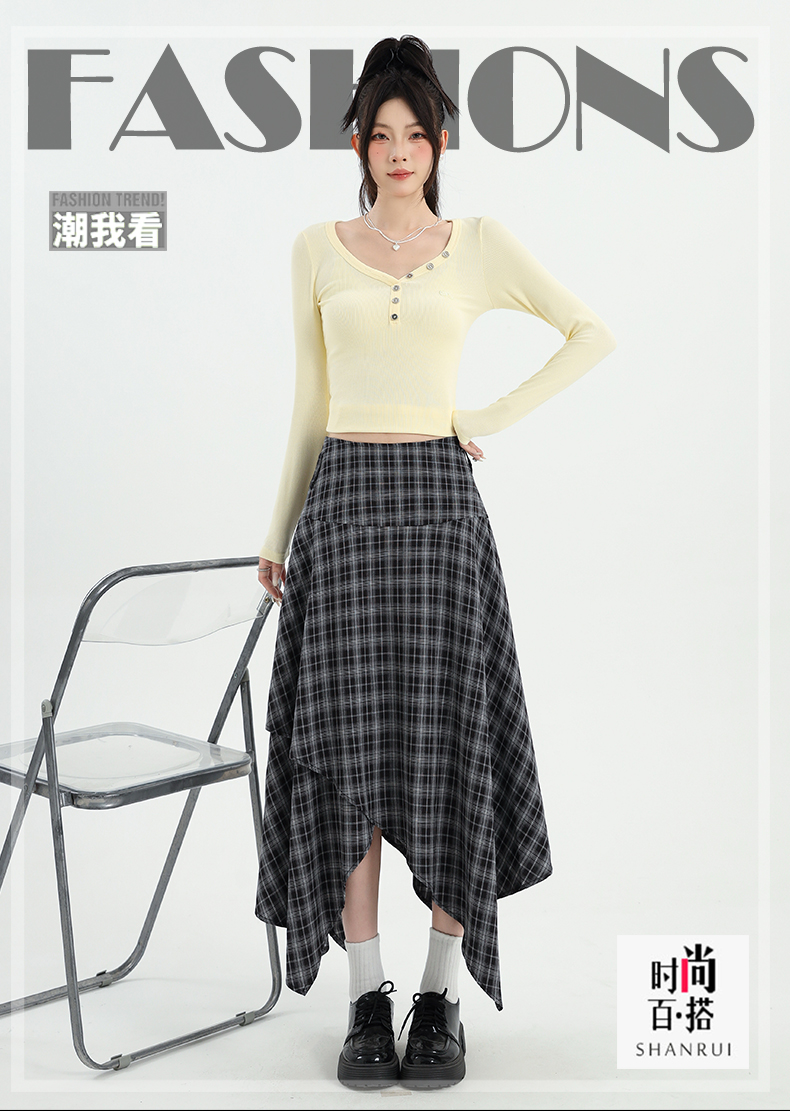 레트로 체크무늬 불규칙 밑단 반신 스커트 빅 사이즈 여성 의류 하이웨이스트 슬림해 보이는 체크무늬 한 마디 큰 진자 치마