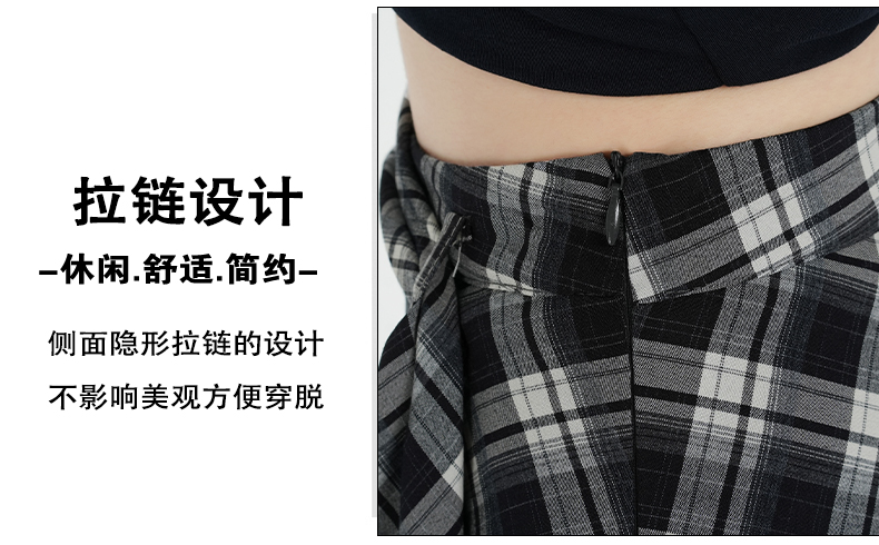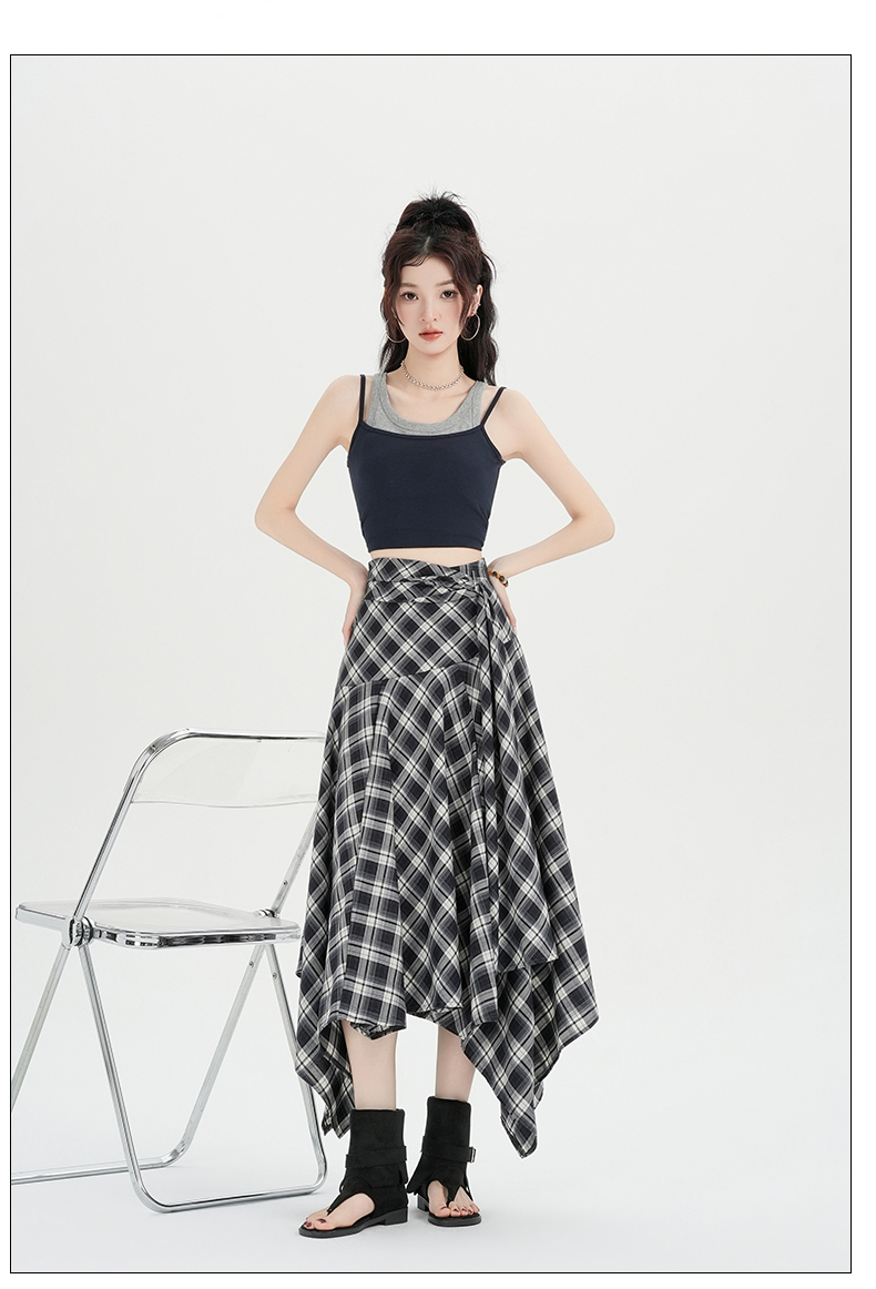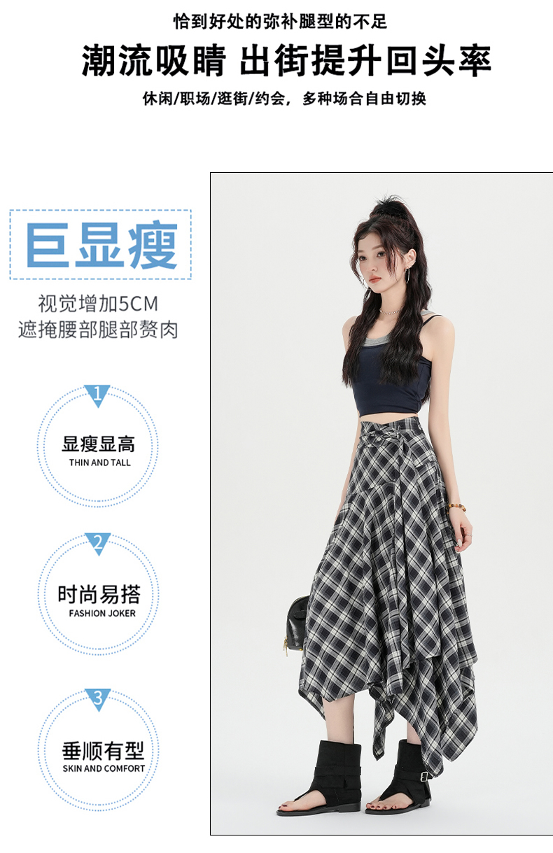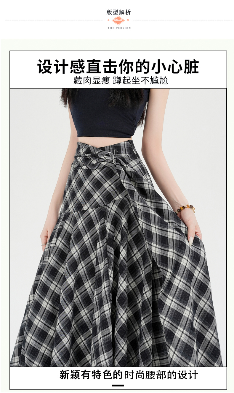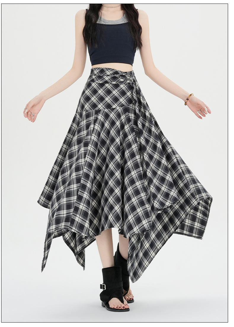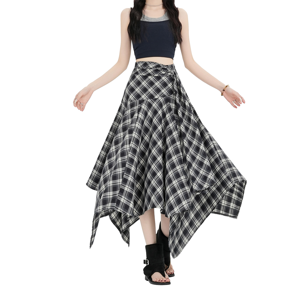 레트로 체크무늬 불규칙 밑단 반신 스커트 빅 사이즈 여성 의류 하이웨이스트 슬림해 보이는 체크무늬 한 마디 큰 진자 치마