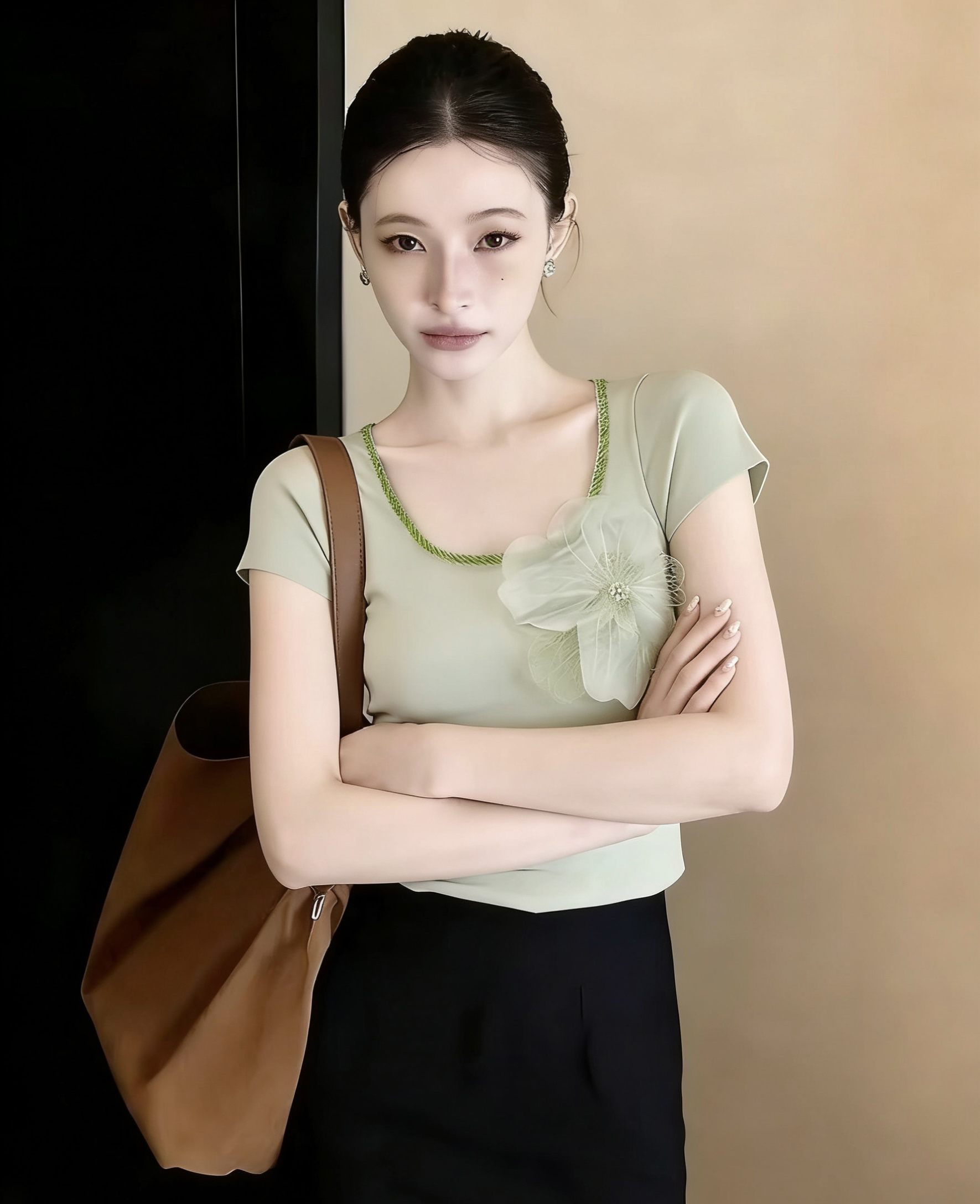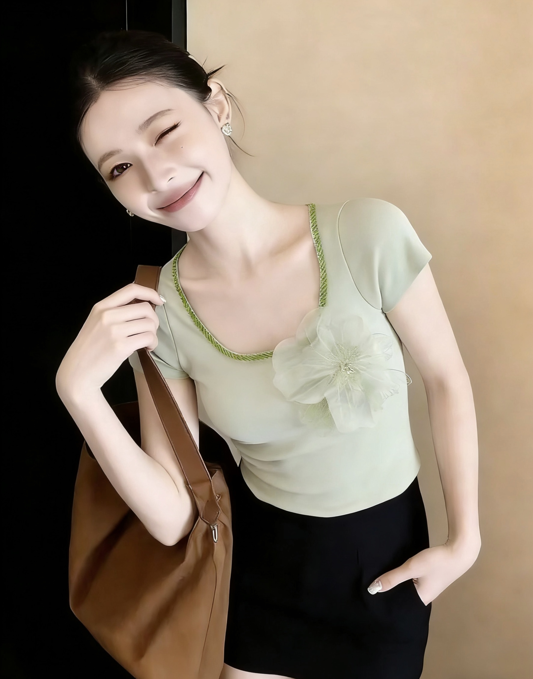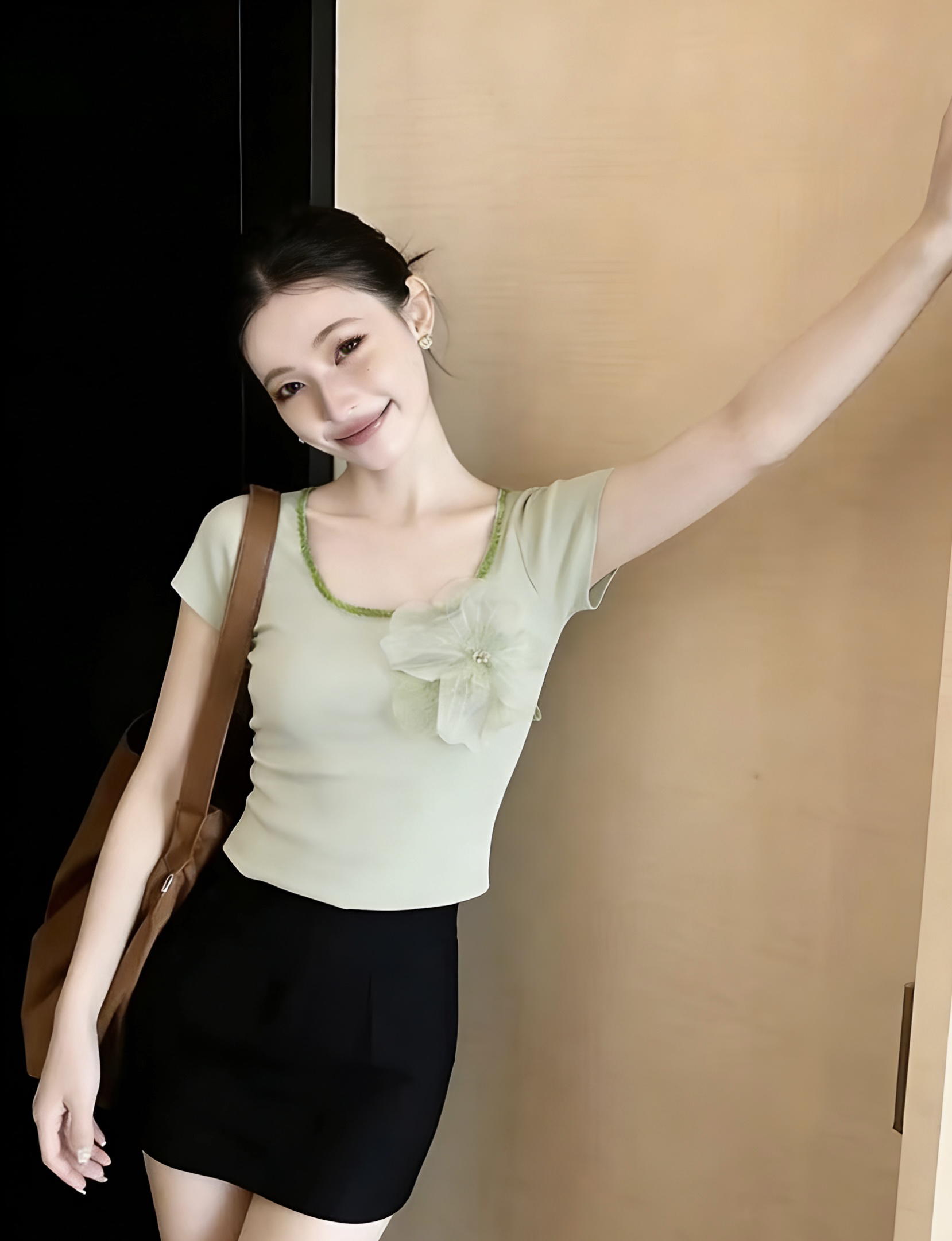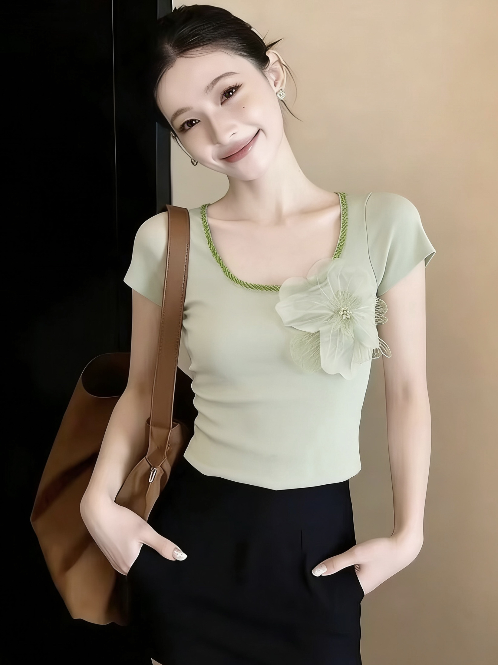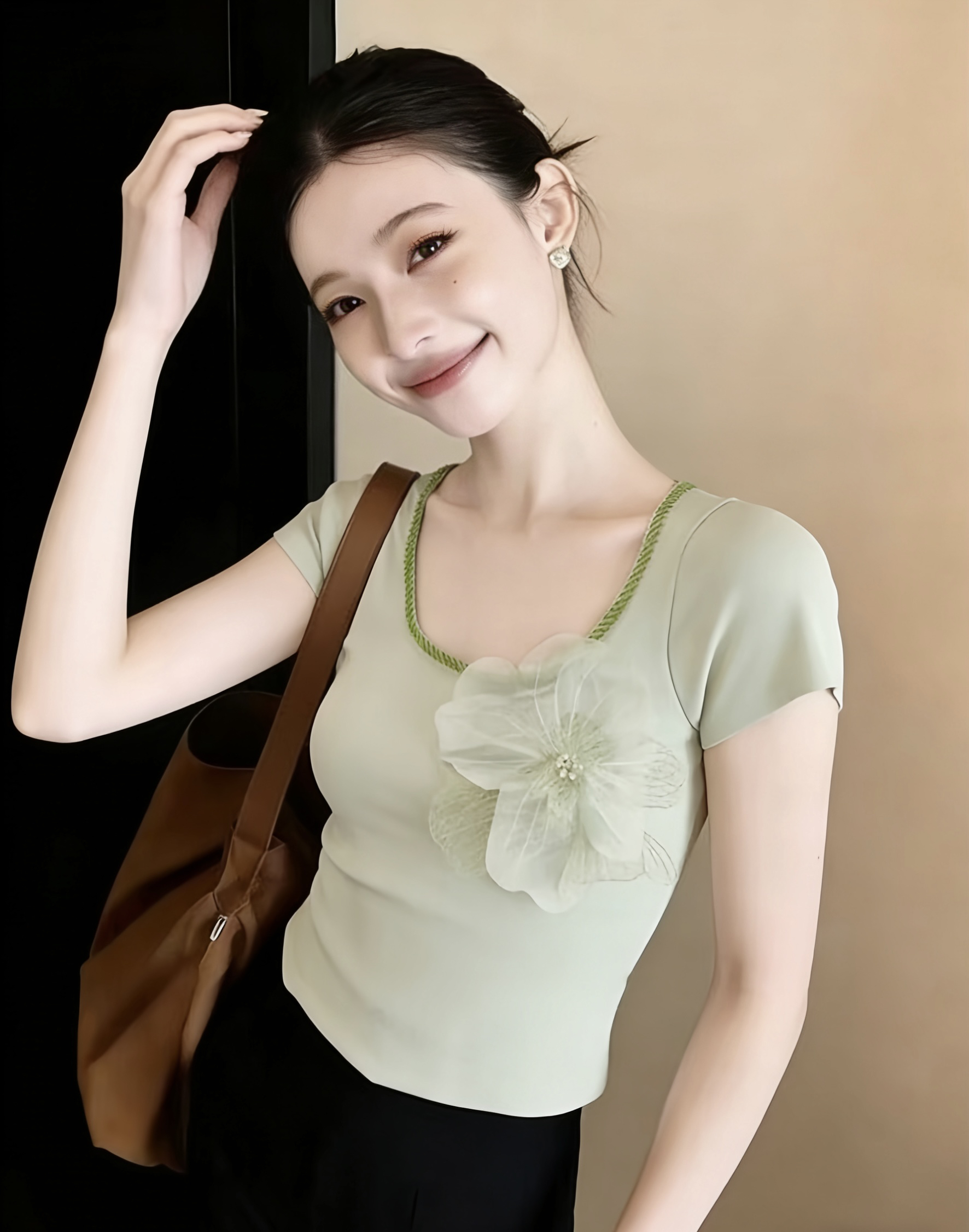 3 차원 꽃 핫픽스 반팔 티셔츠 여성 여름 2026 새로운 한국 스타일 품격 연령 감소 몸매 가꾸기 니트 맨위