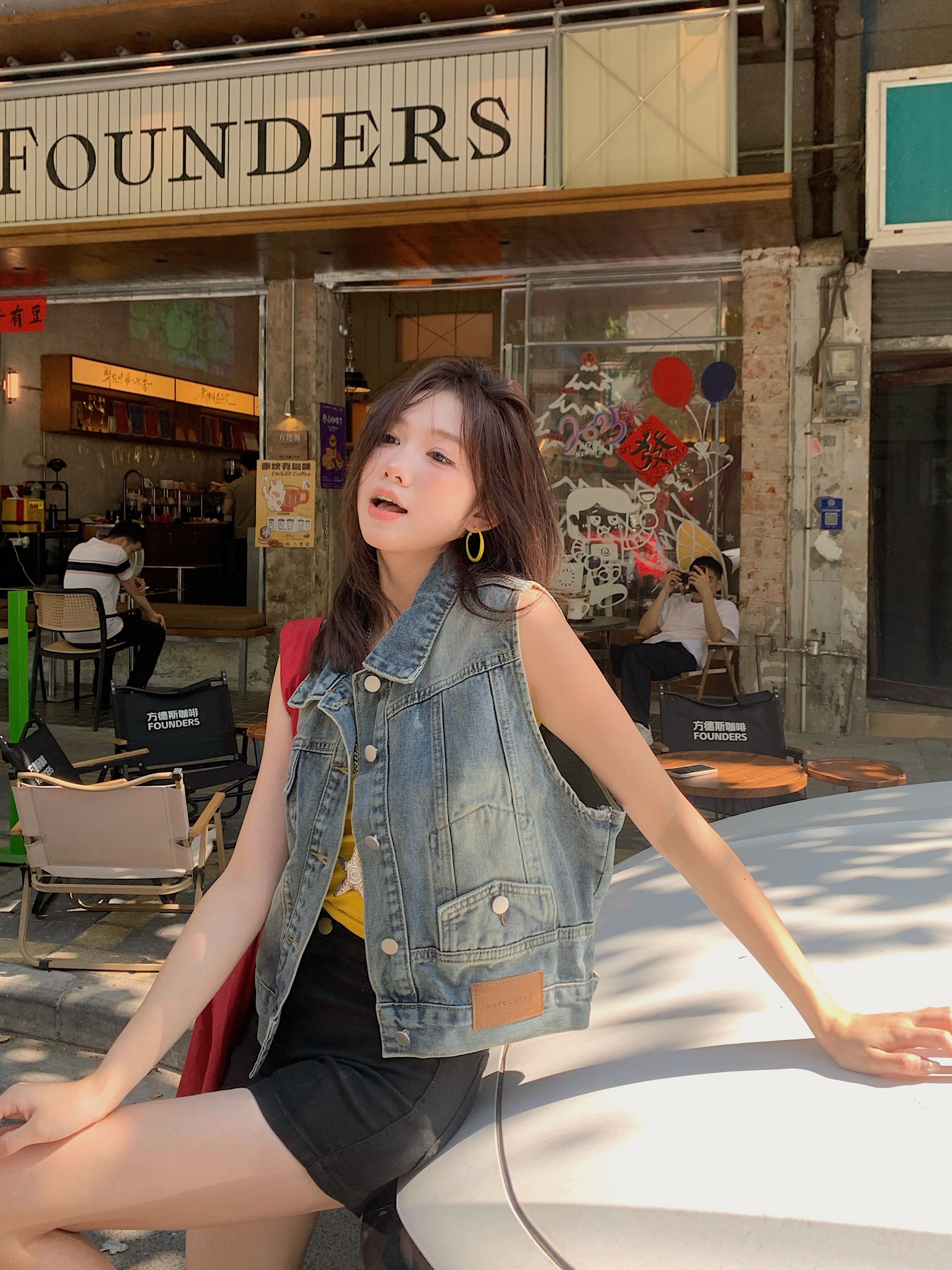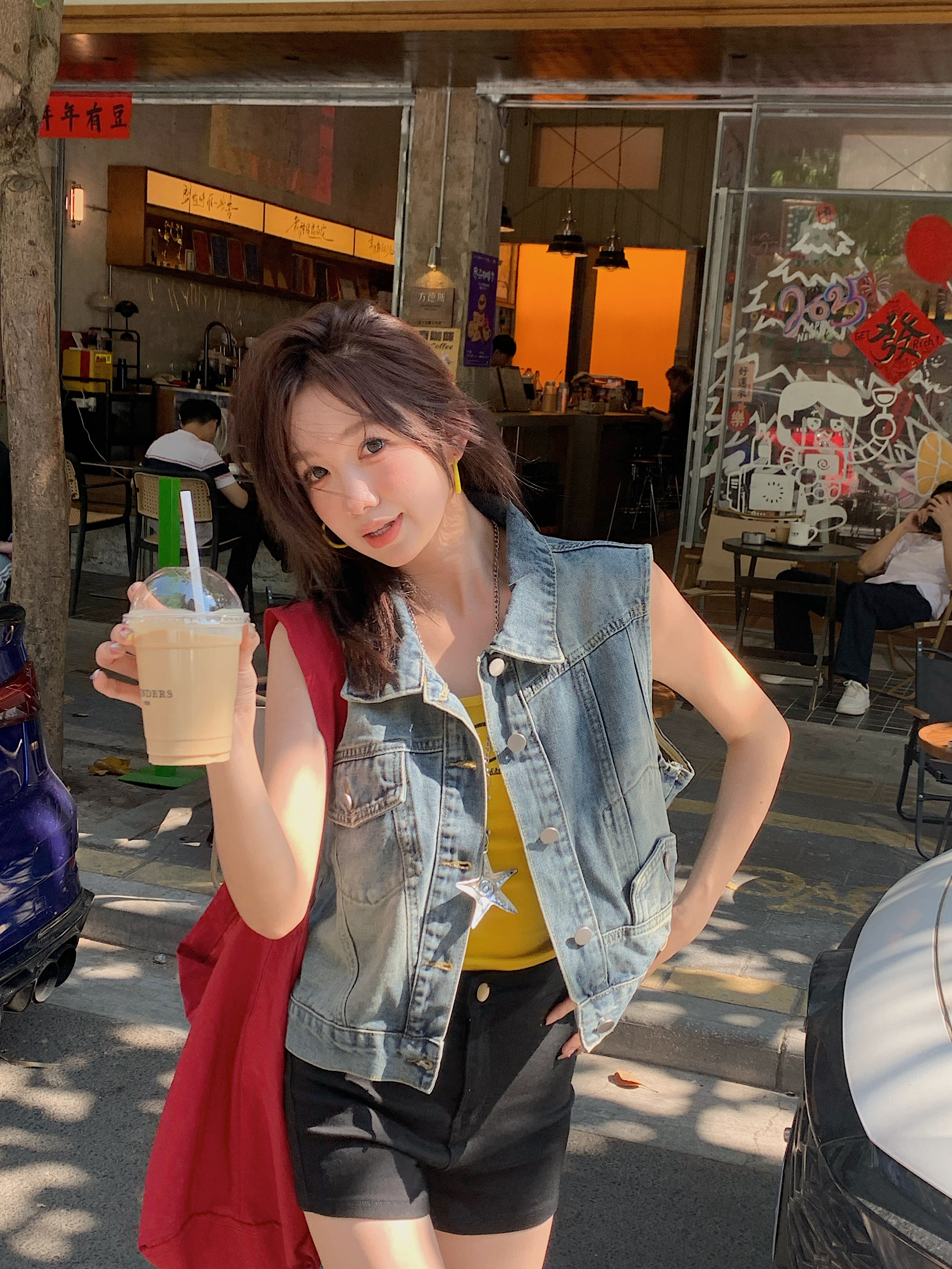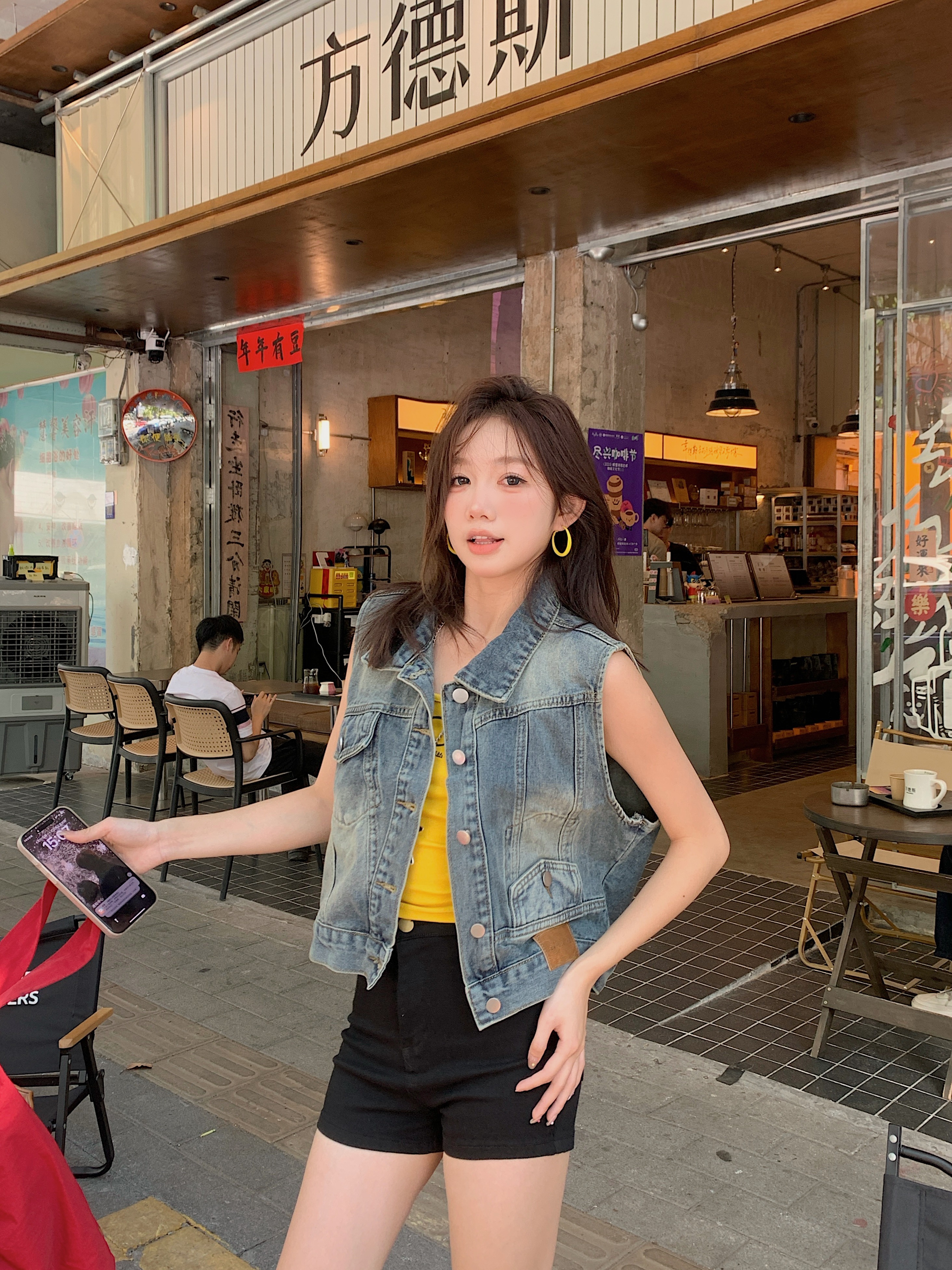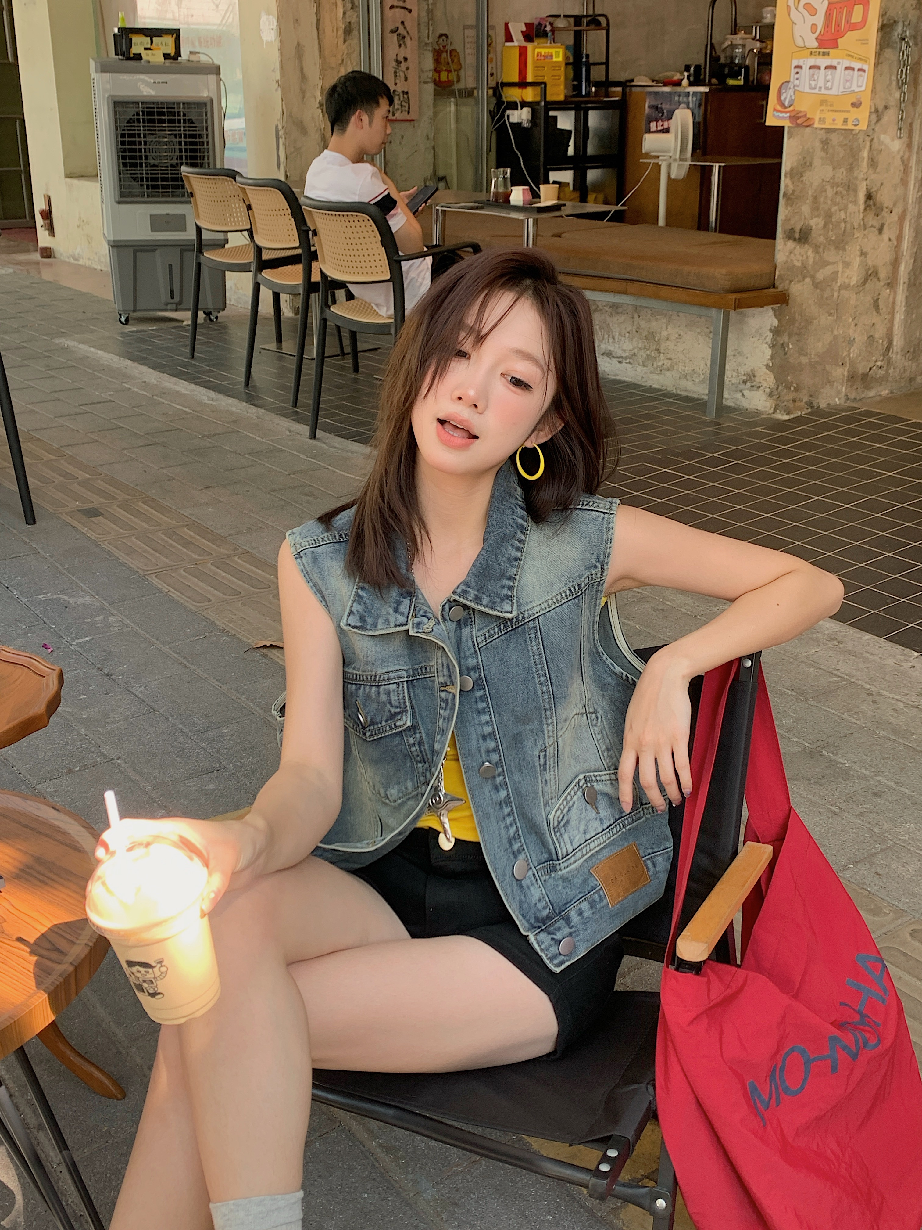 실사 레트로 한국 스타일 루즈핏 어깨 반팔 데님 반소매 재킷