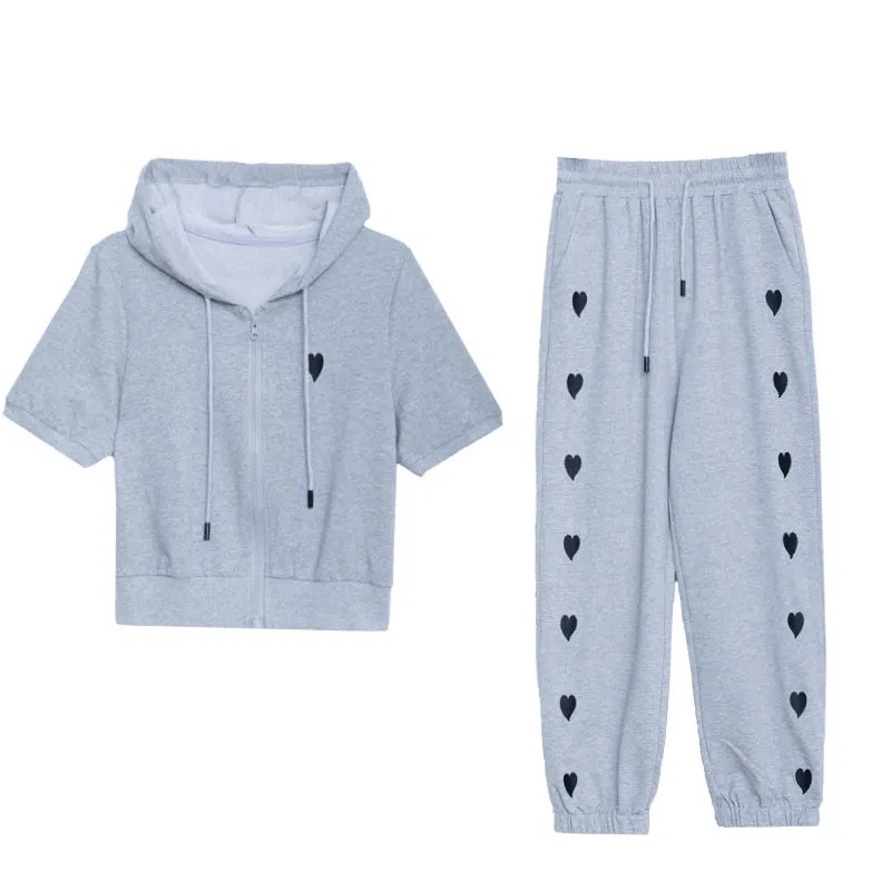 2026 새로운 패션 루즈핏 반팔 후드 티 스웨터 스포츠 슈트 여성 여름 외국 가스 연령 감소 캐주얼 세트