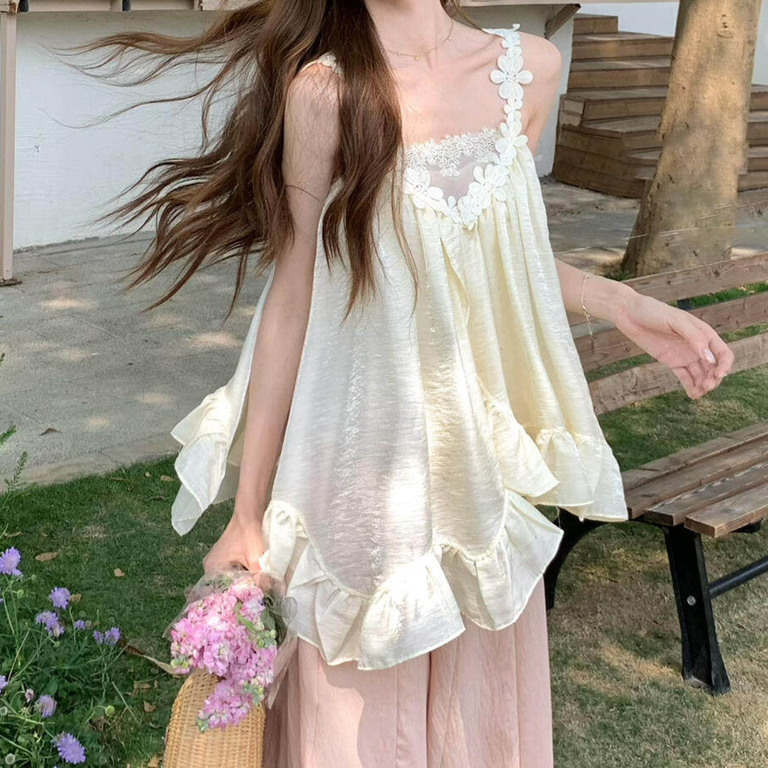 슈퍼 요정 꽃무늬 프릴 캐미솔 2026 여름 섹션 휴가 바람 인형 셔츠 슬림해 보이는 오프숄더 민소매 맨위 여성