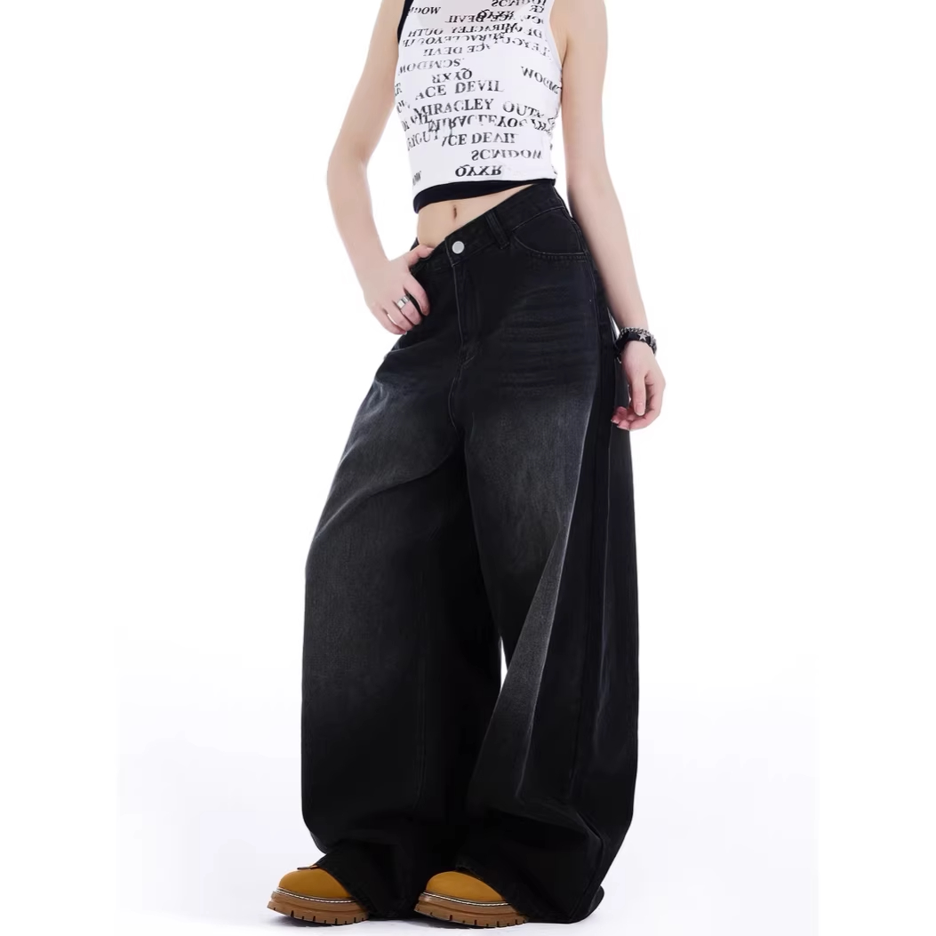 레트로 아메리칸 빛 아시아 인 알파벳 프린트 검정색 루즈핏 워크웨어 청바지 스트레이트 넓은 다리 바닥 청소 데님 롱 바지