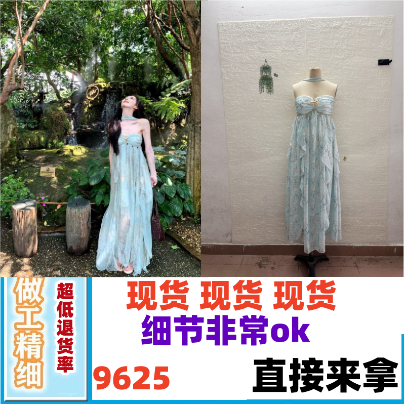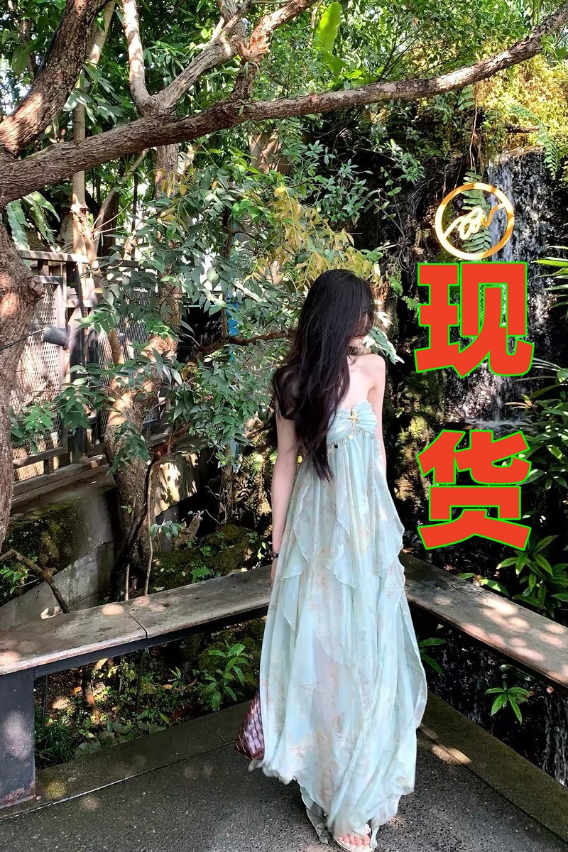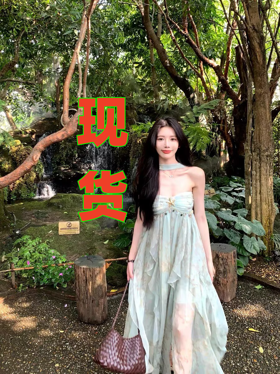 실사 2026 여름 새로운 루즈핏 롱 스커트 쉬폰 수묵화 프린트 디자인 센스 멜빵 중간 길이 드레스