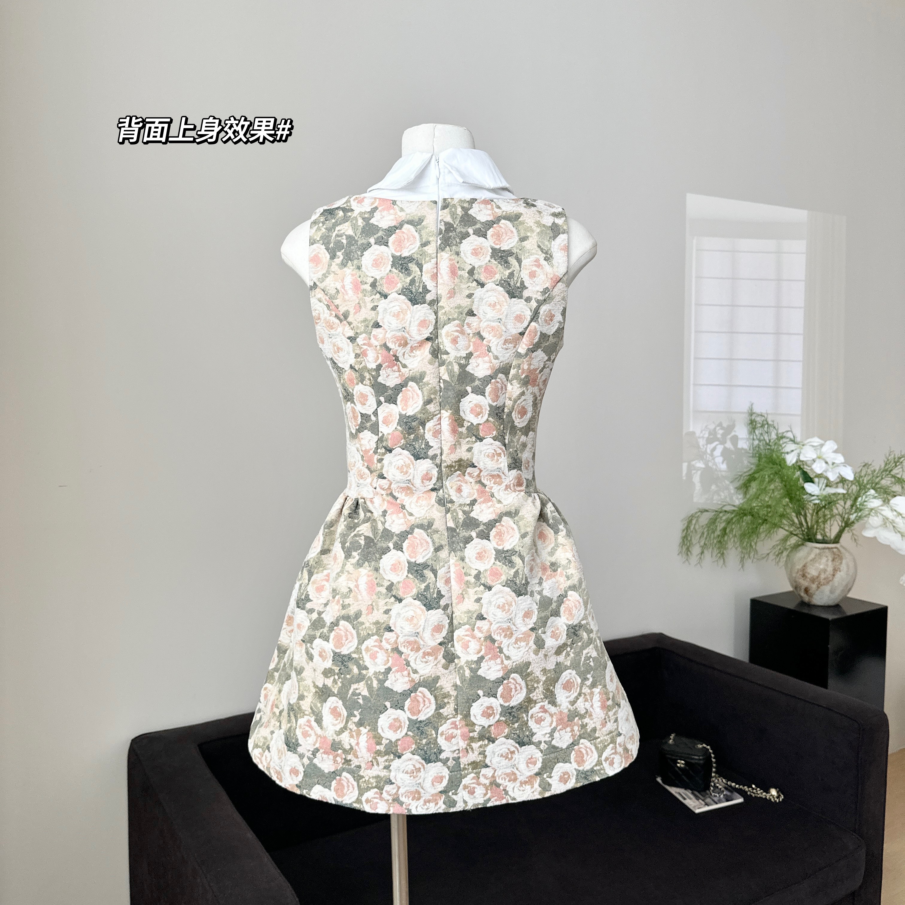 장미 유화 셔츠 칼라 민소매 여성 드레스 봄 여름 천 금빛 바람 퍼프 몸매 가꾸기 허리 수축 조끼 스커트