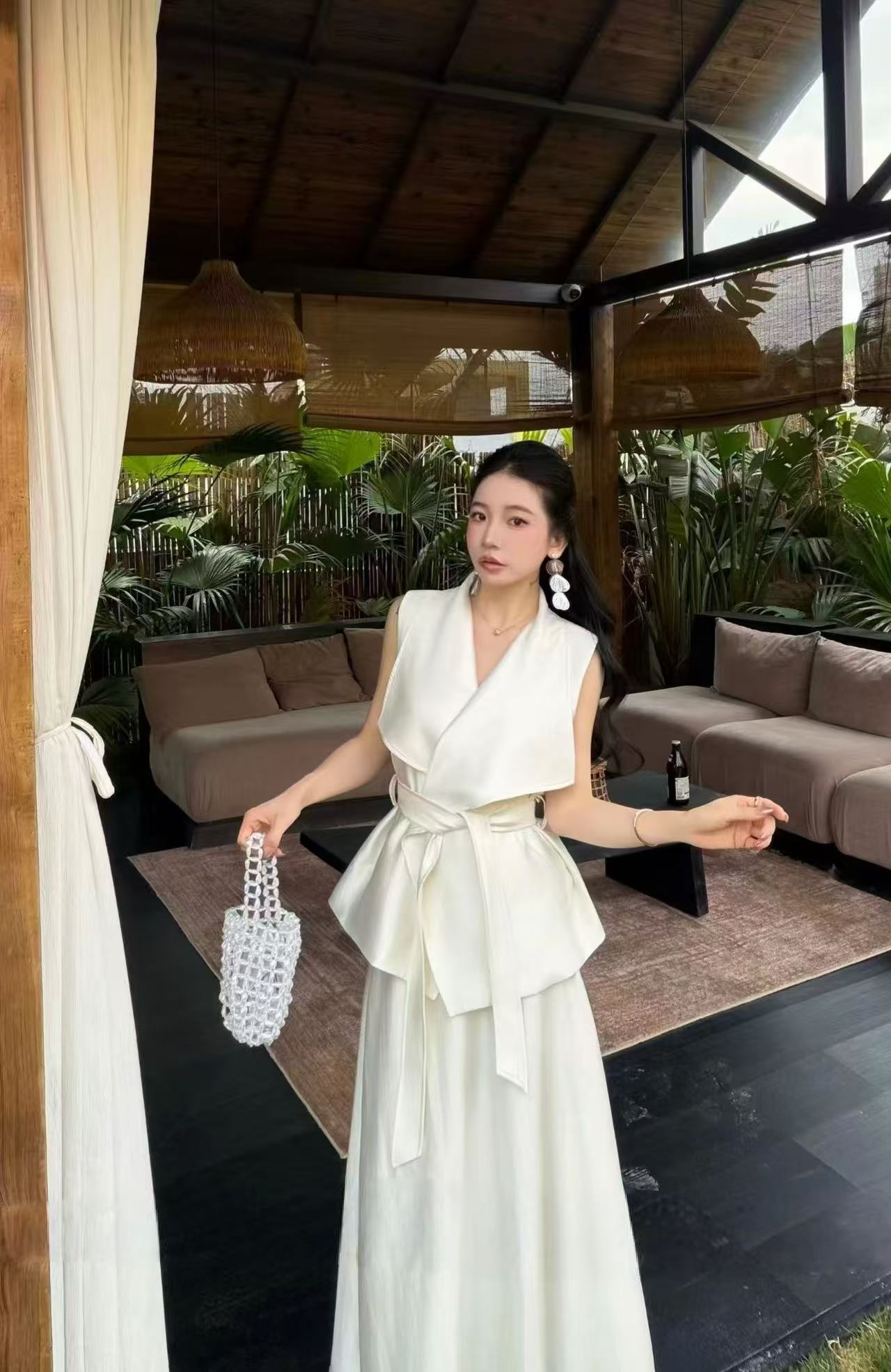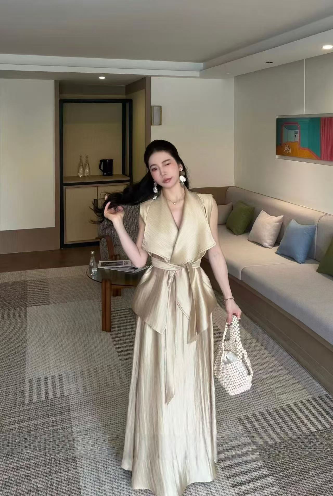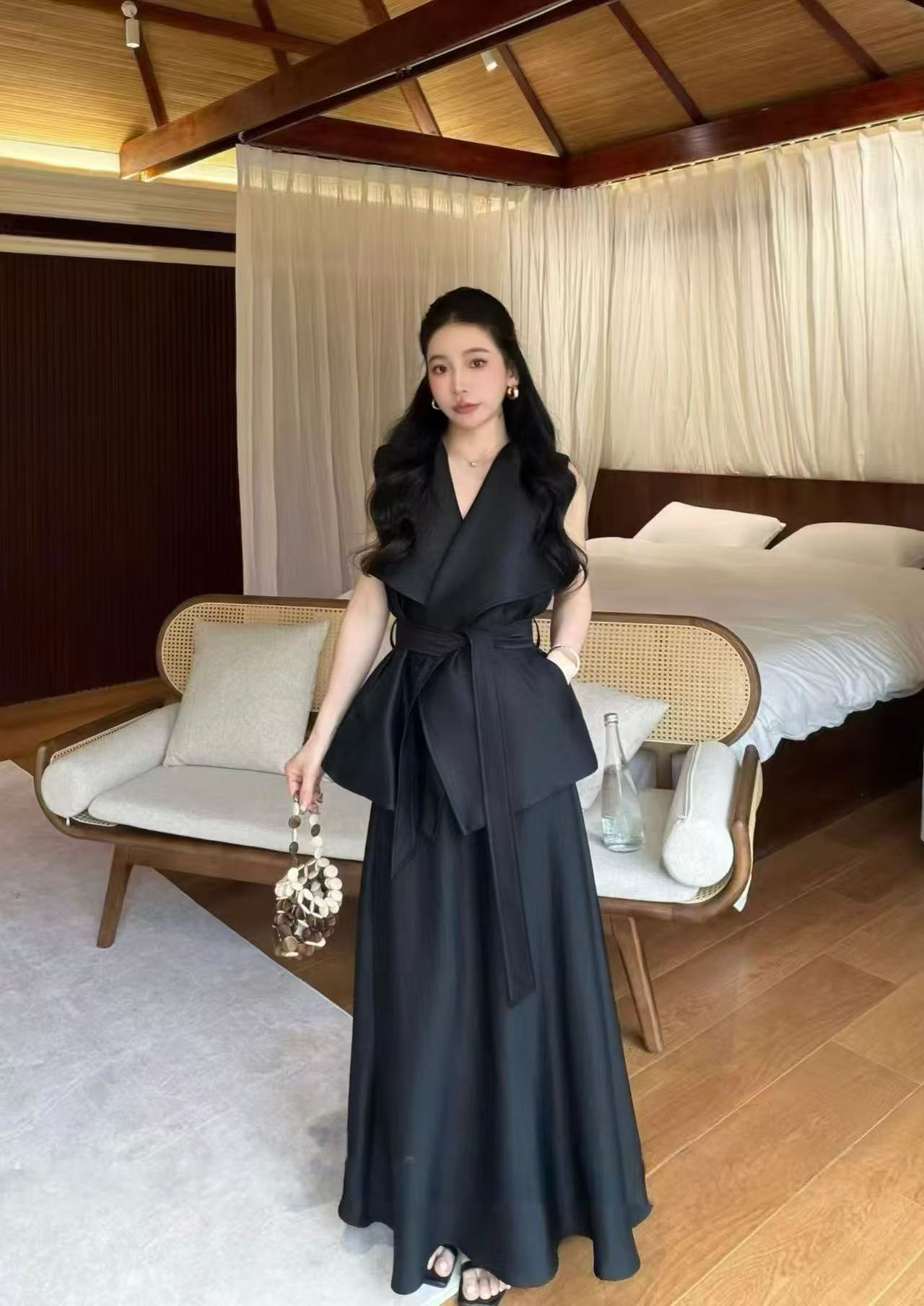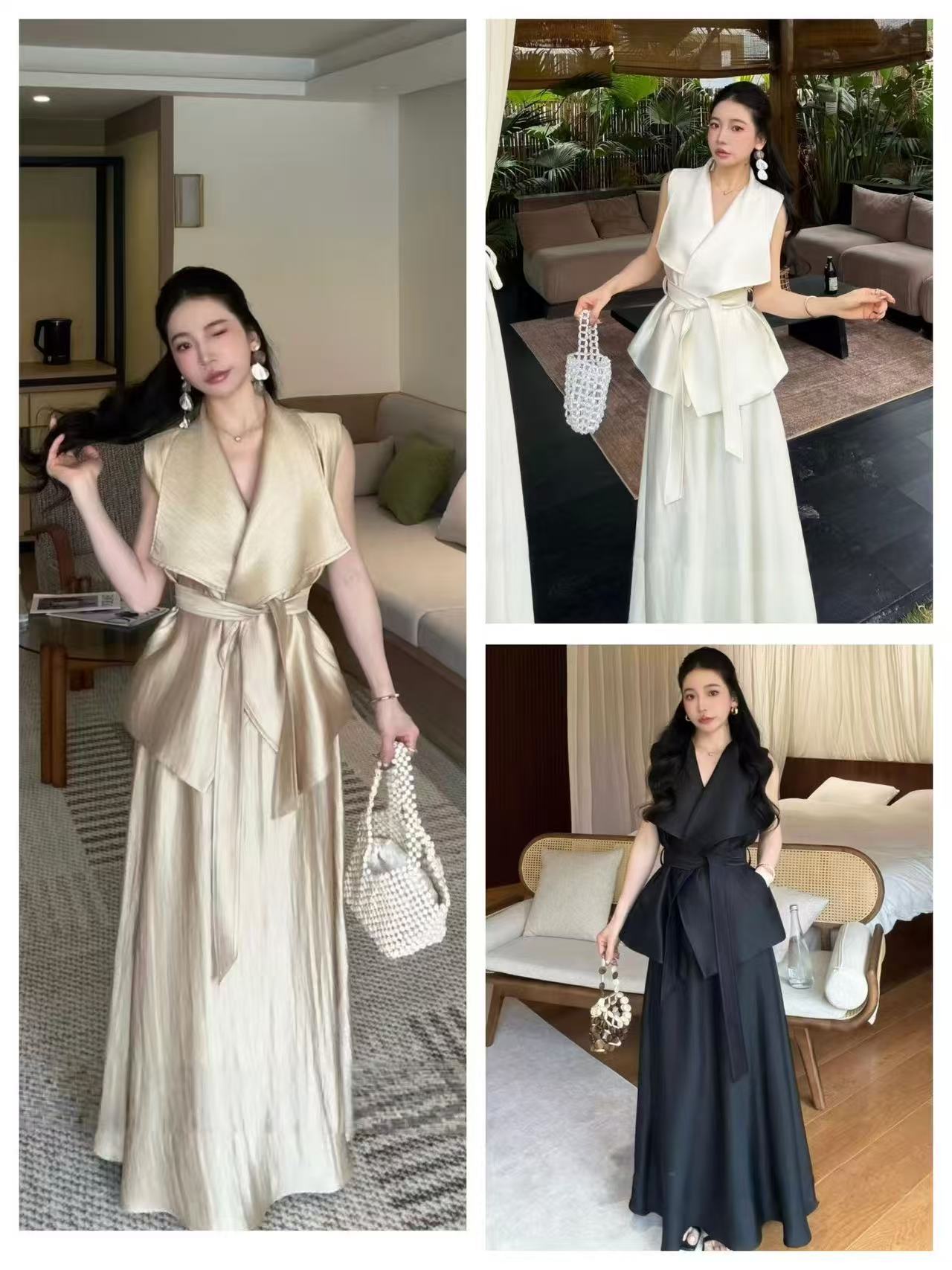 새로운 고급 센스 민소매 빅 칼라 맨위 하이웨이스트 슬림해 보이는 반신 롱 스커트 벨트 3 세트