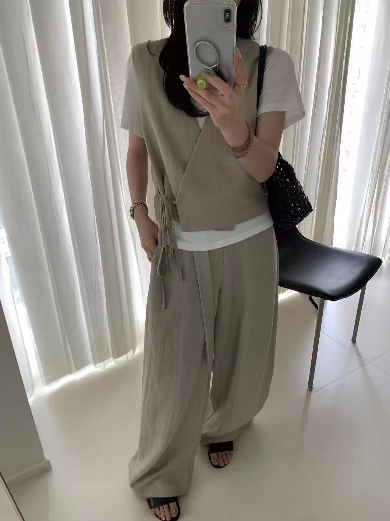 새로운 루즈핏 슬림해 보이는 품격 느긋한 바람 V넥 스트랩 맨위 허리밴드 와이드 레그 팬츠 세트