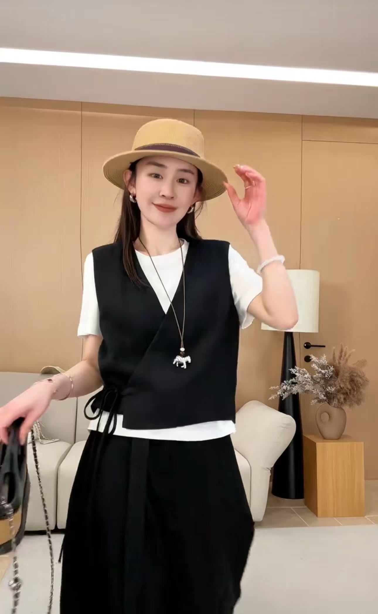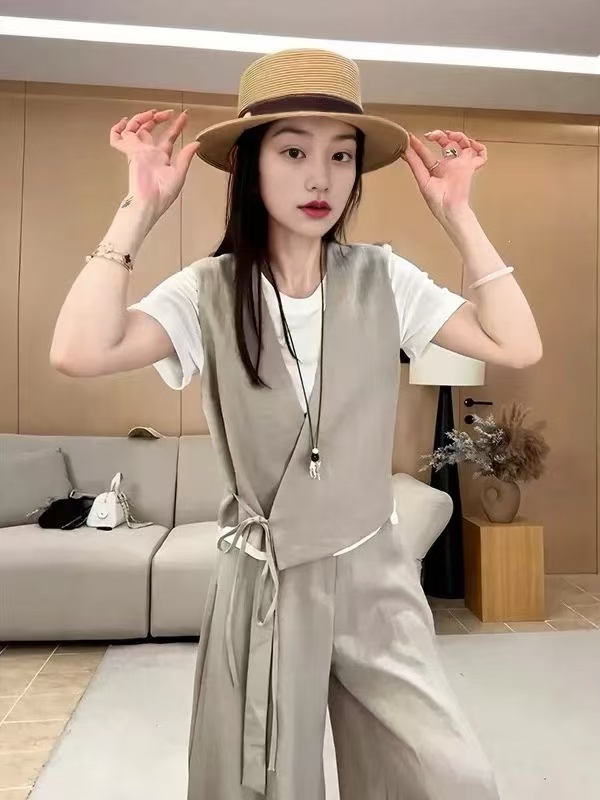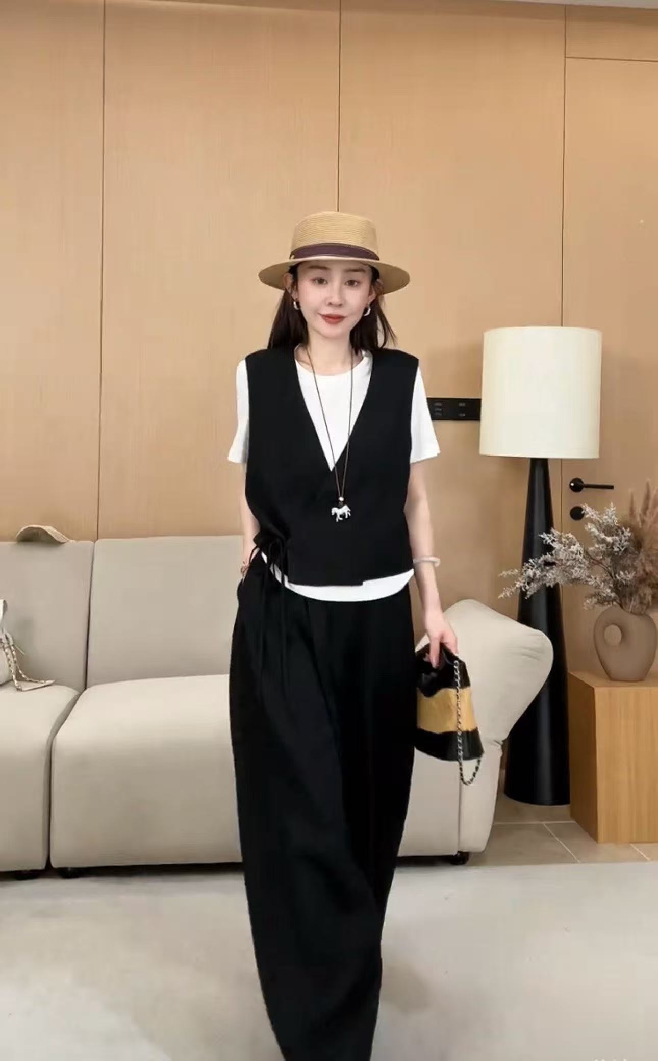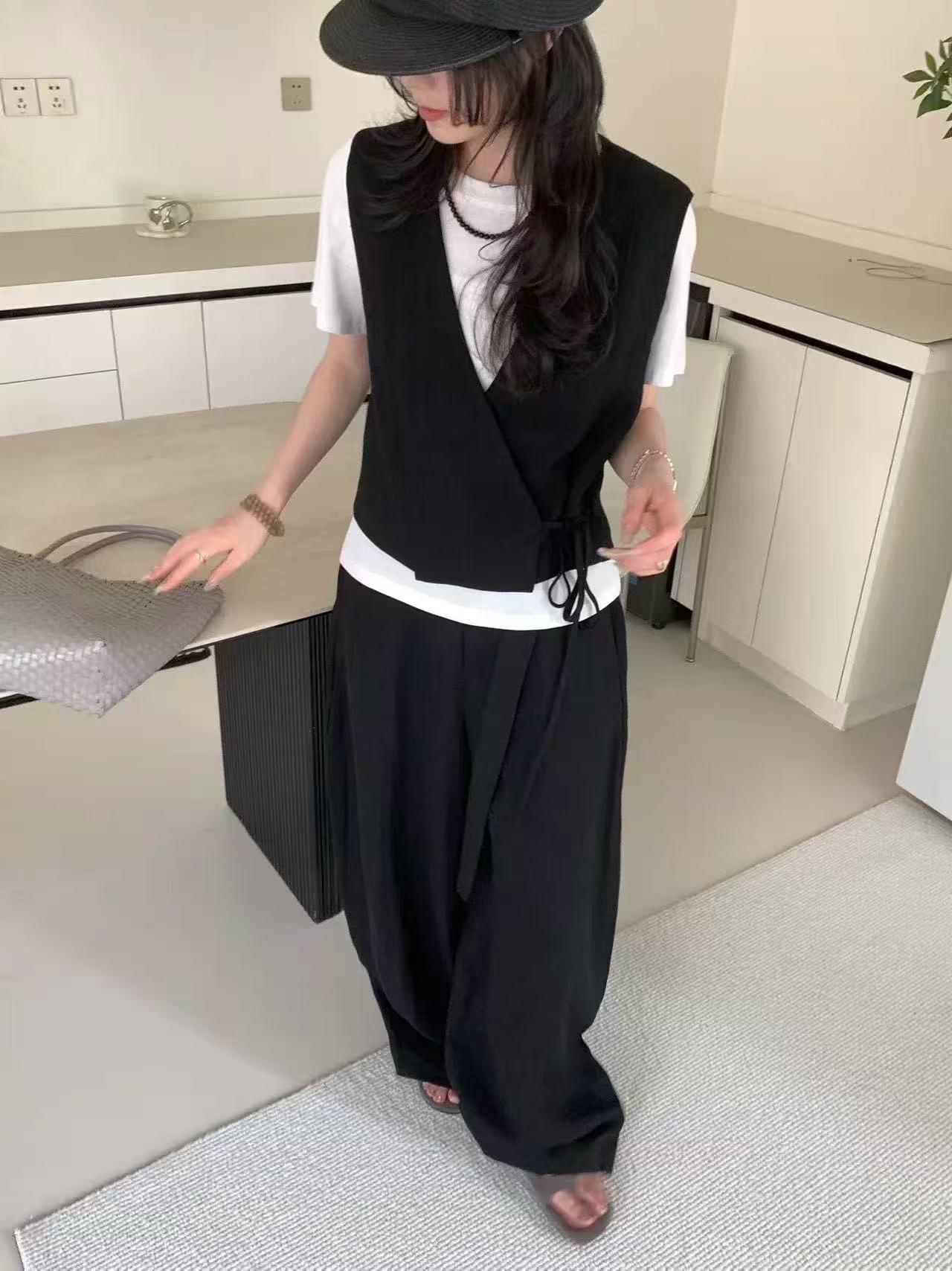 새로운 한국 스타일 패션 품격 다용도 슬림해 보이는 민소매 패치워크 베스트 허리밴드 와이드 레그 팬츠 투피스 세트