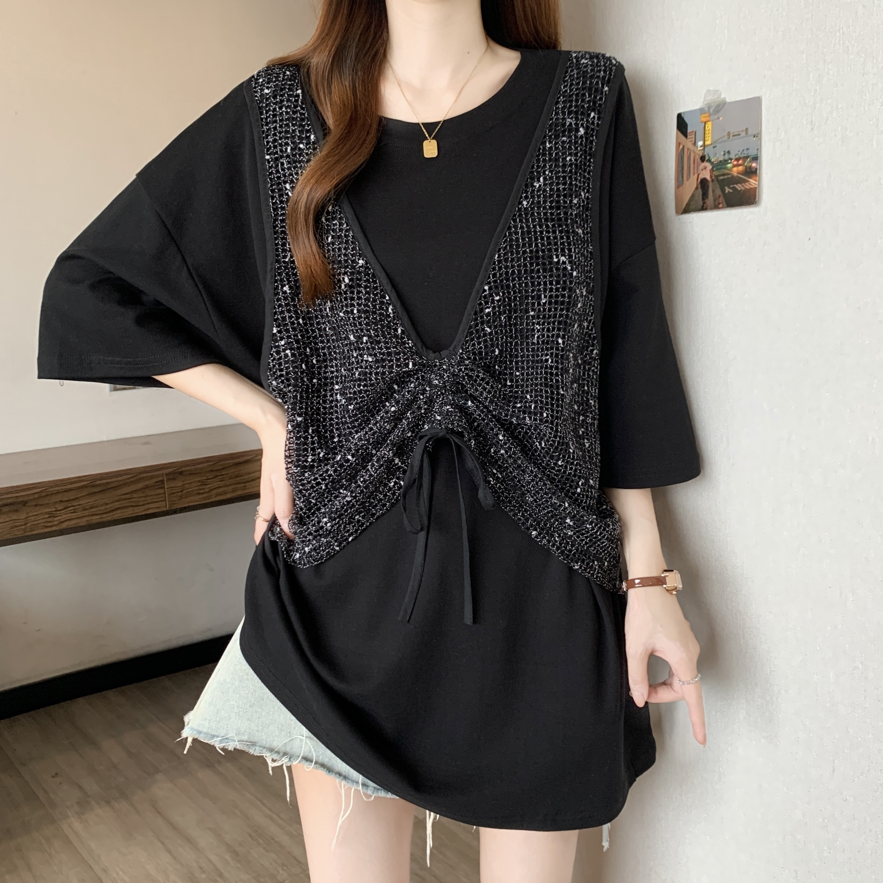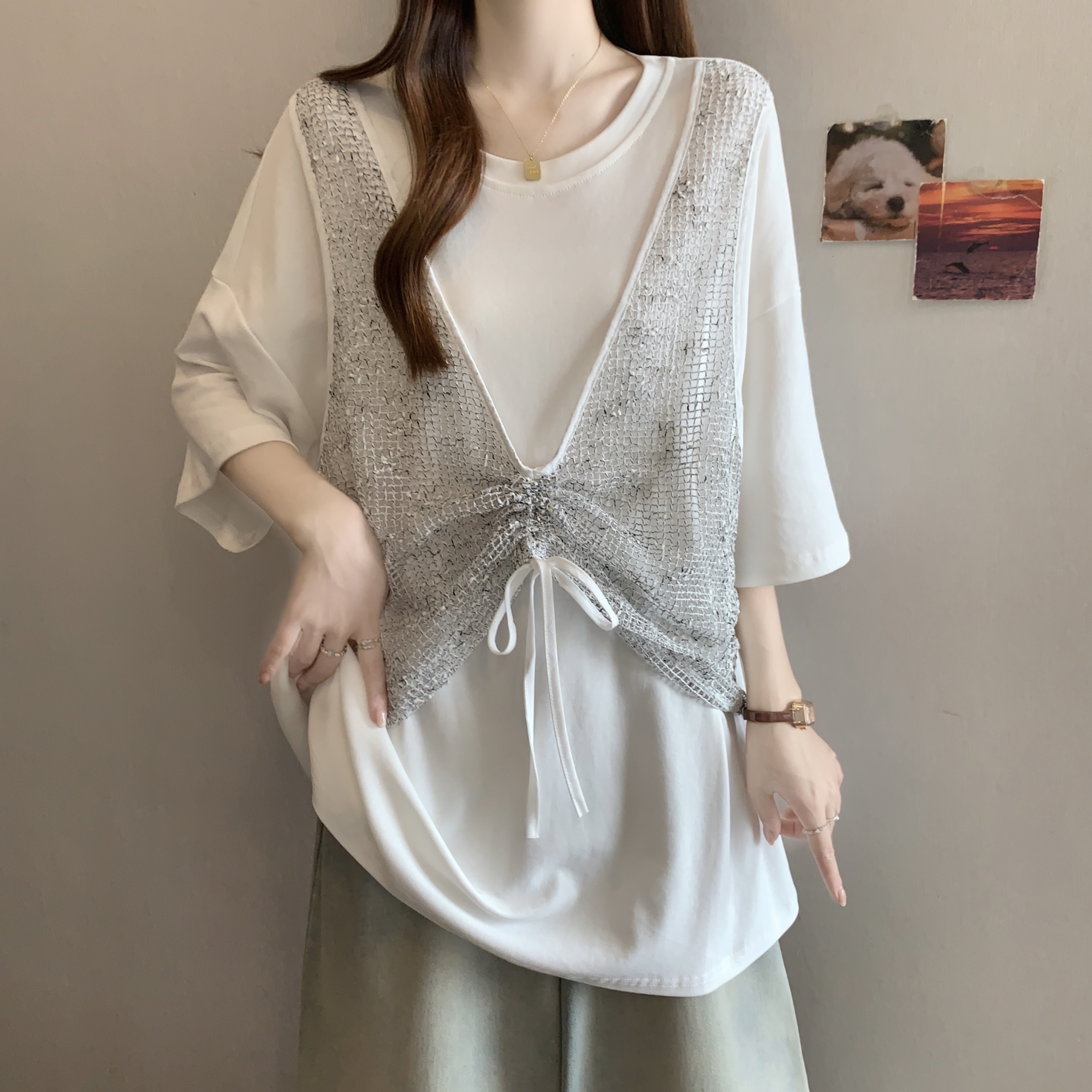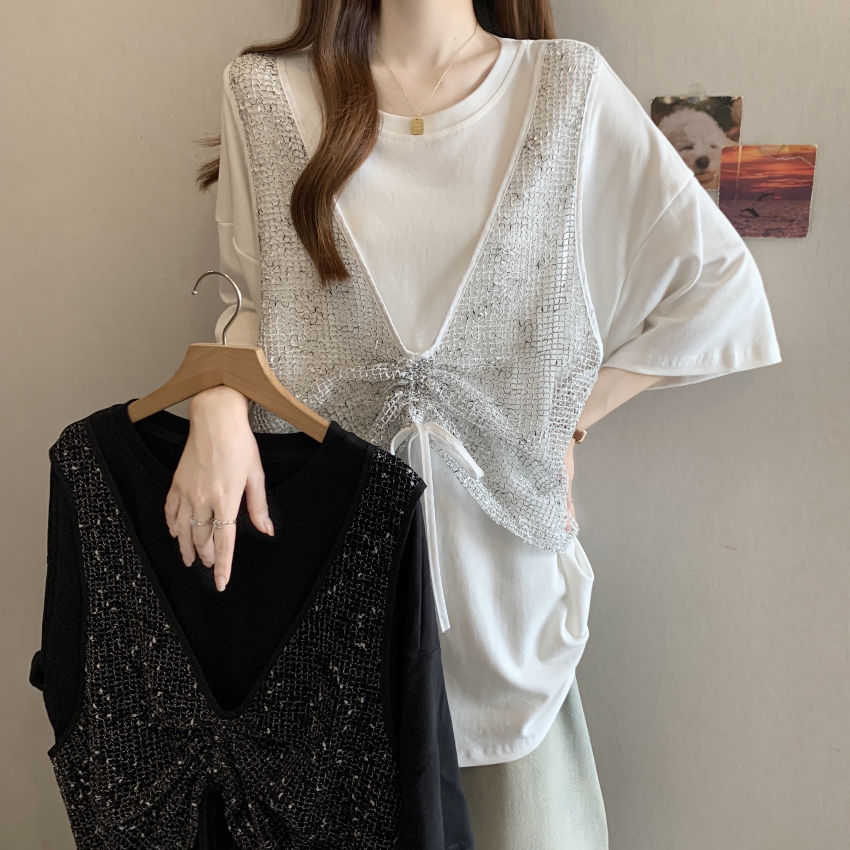 실사 빅 사이즈 새로운 디자인 센스 지방 mm 캐주얼 루즈핏 망사 패치워크 페이크 레이어드 슬림해 보이는 다용도 티셔츠 여성
