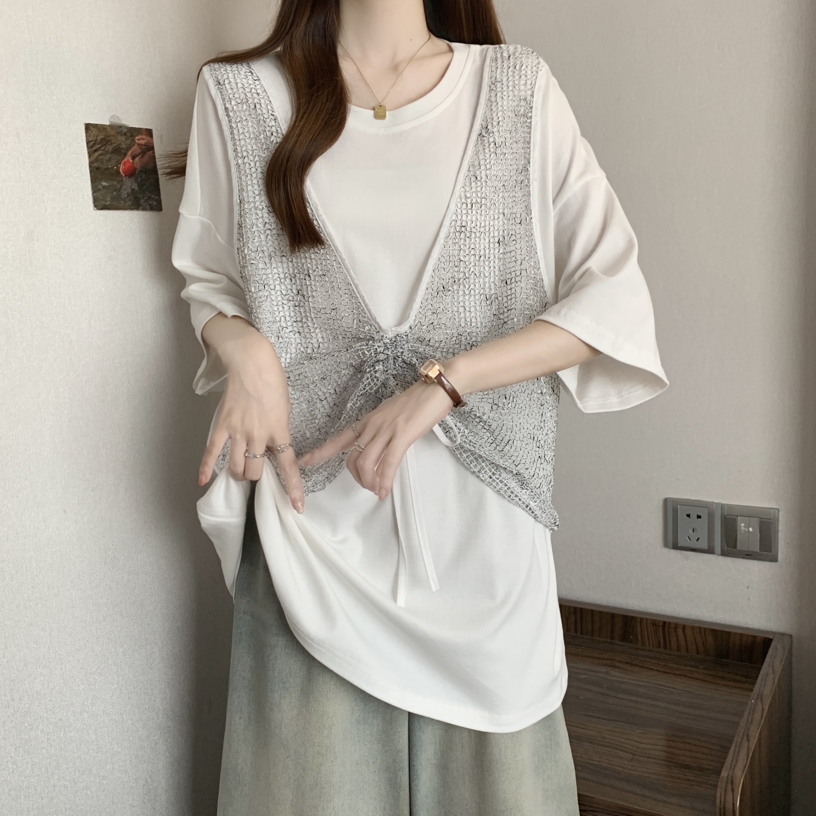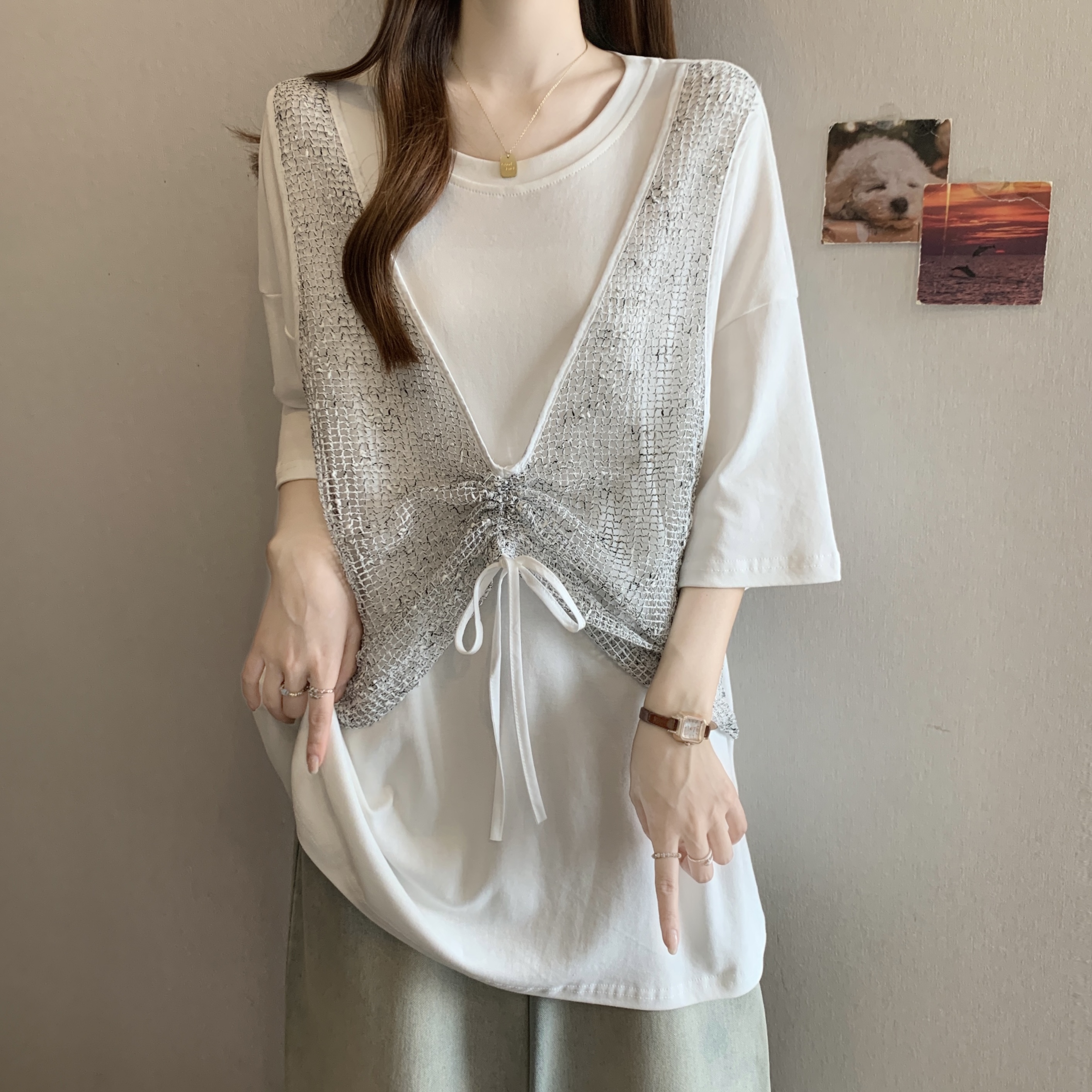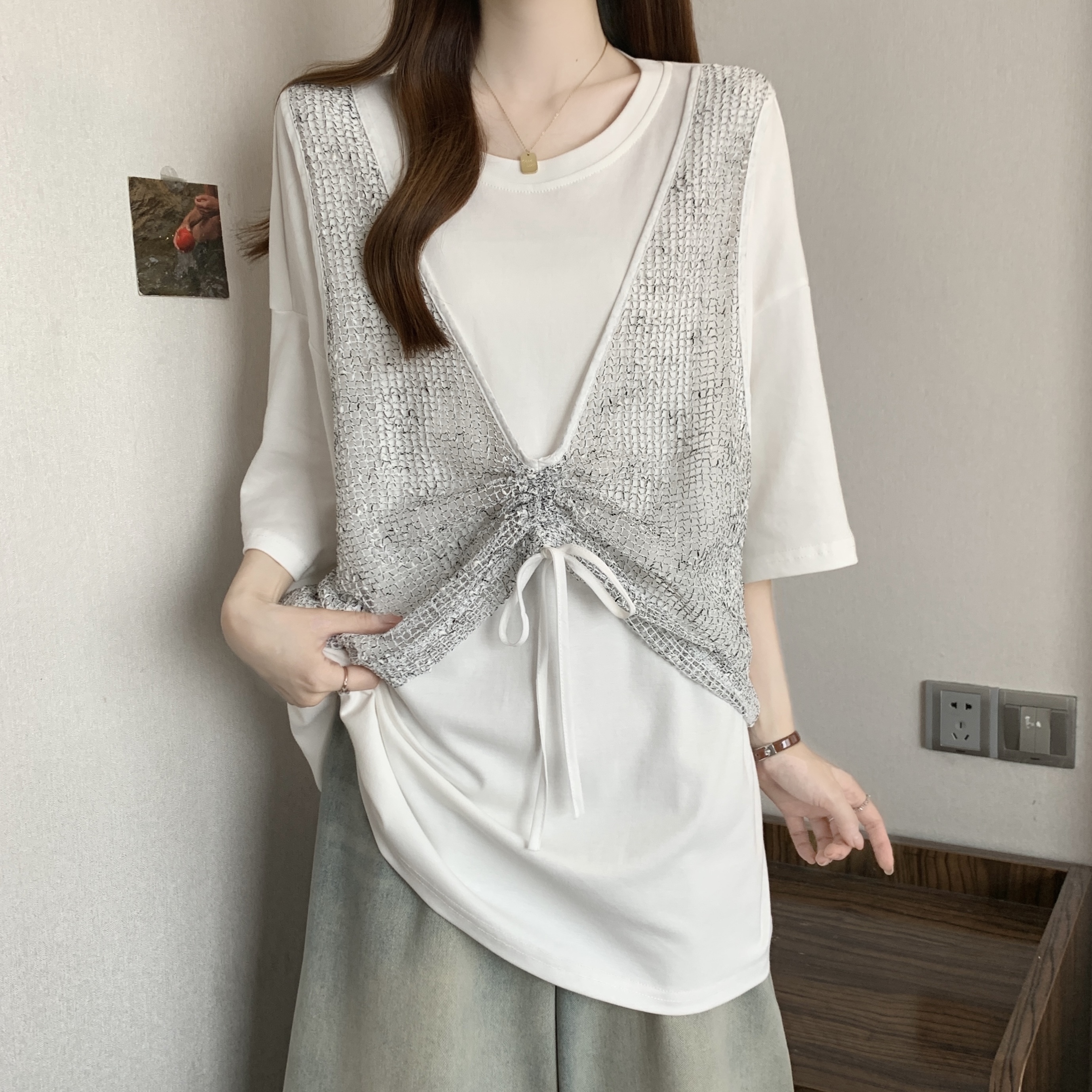 실사 빅 사이즈 새로운 디자인 센스 지방 mm 캐주얼 루즈핏 망사 패치워크 페이크 레이어드 슬림해 보이는 다용도 티셔츠 여성