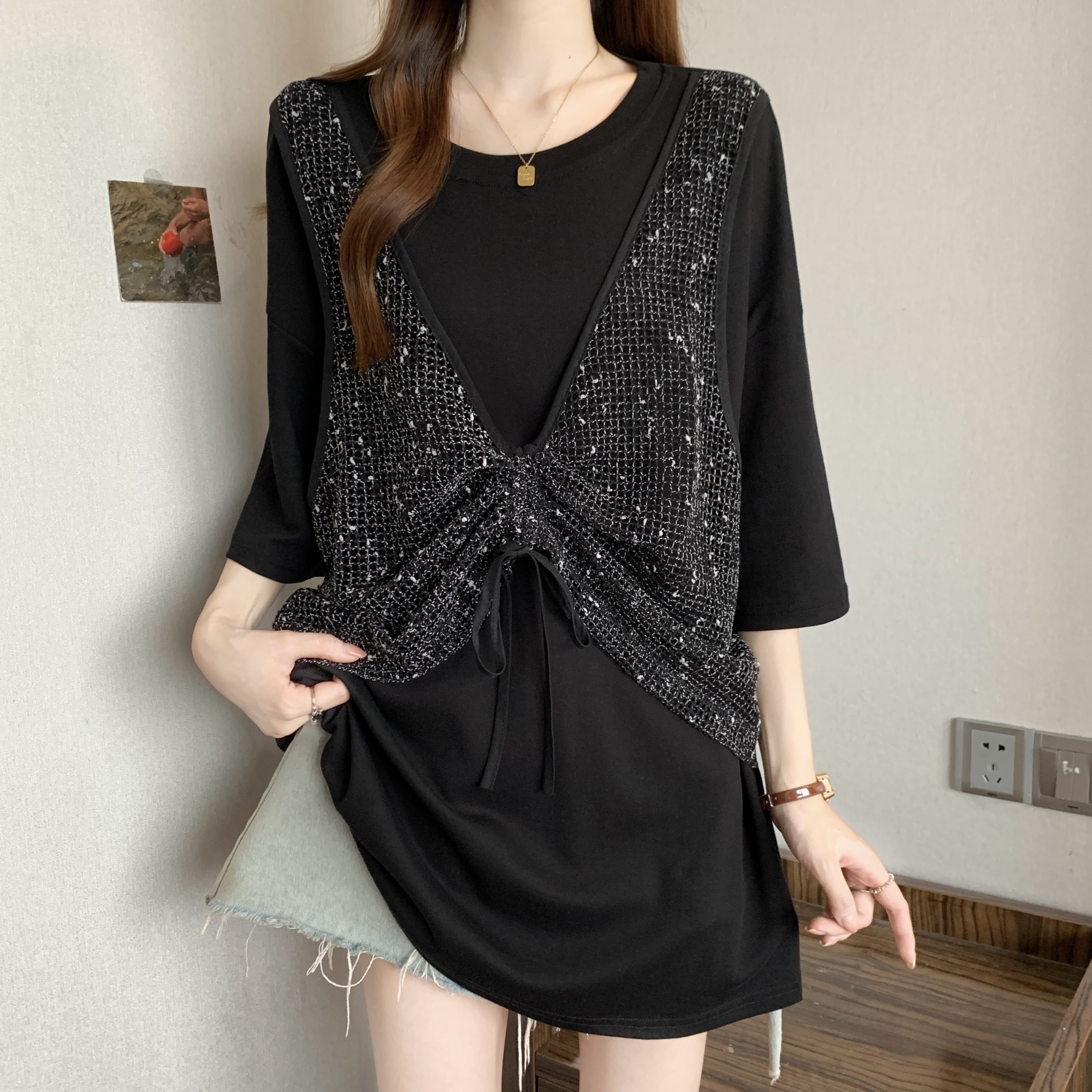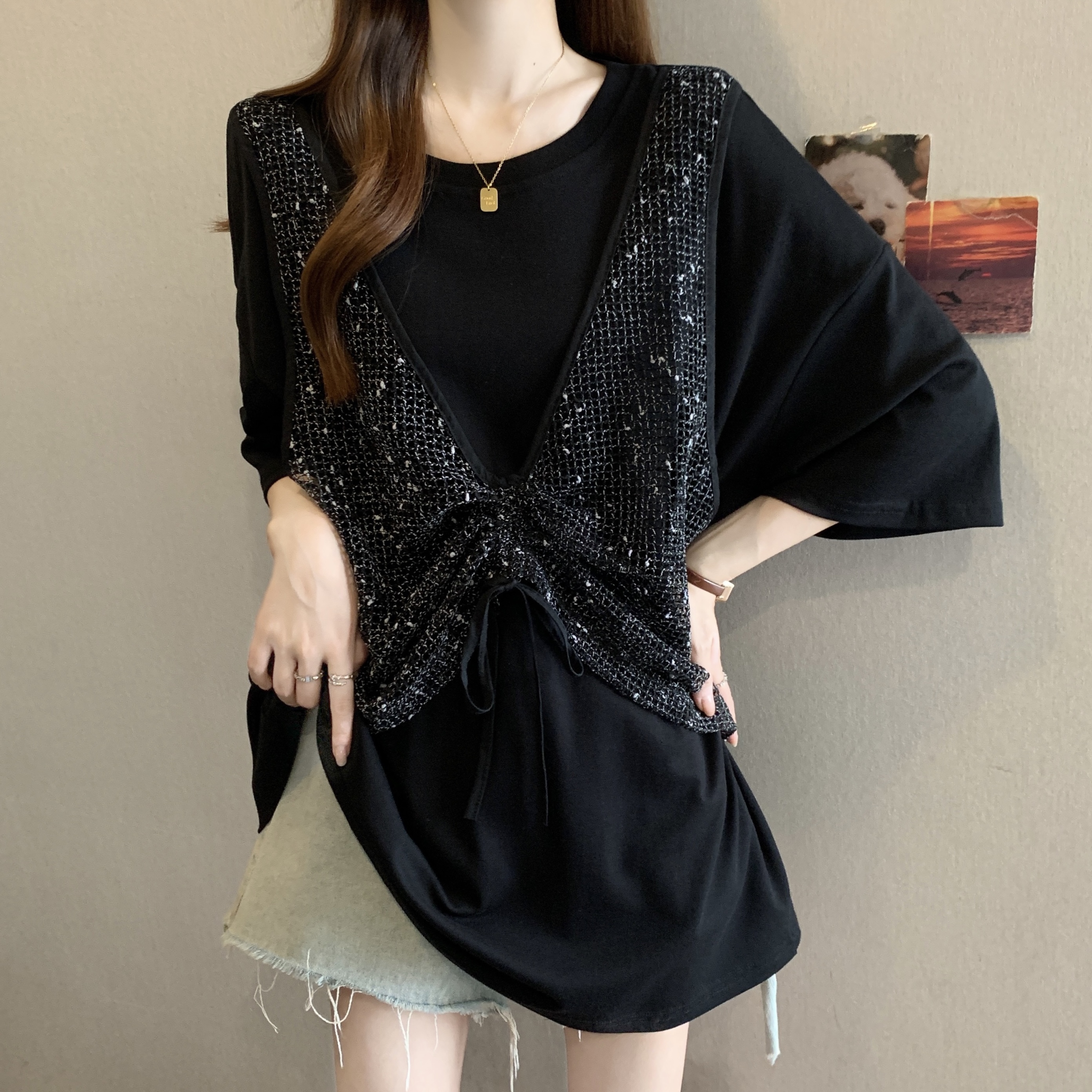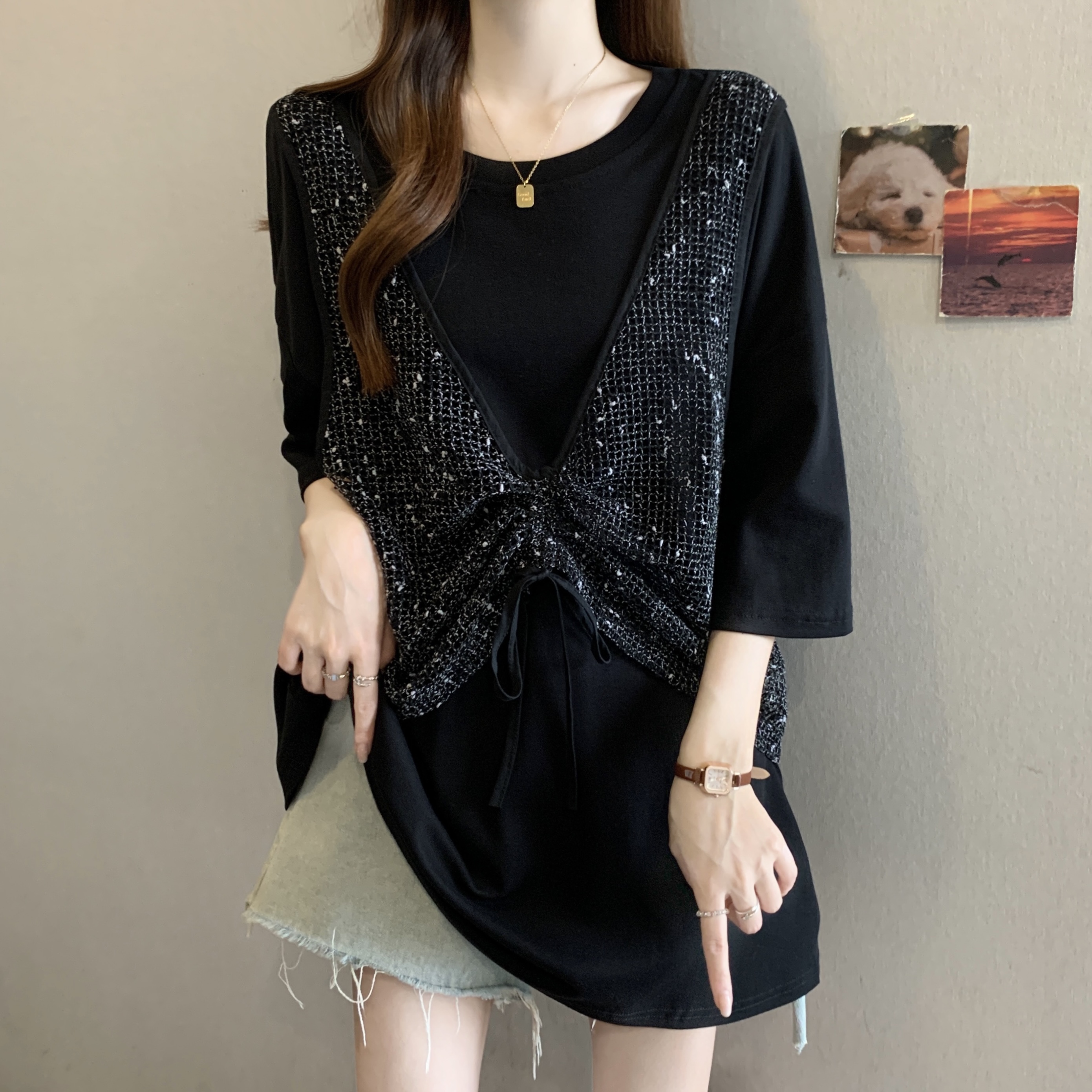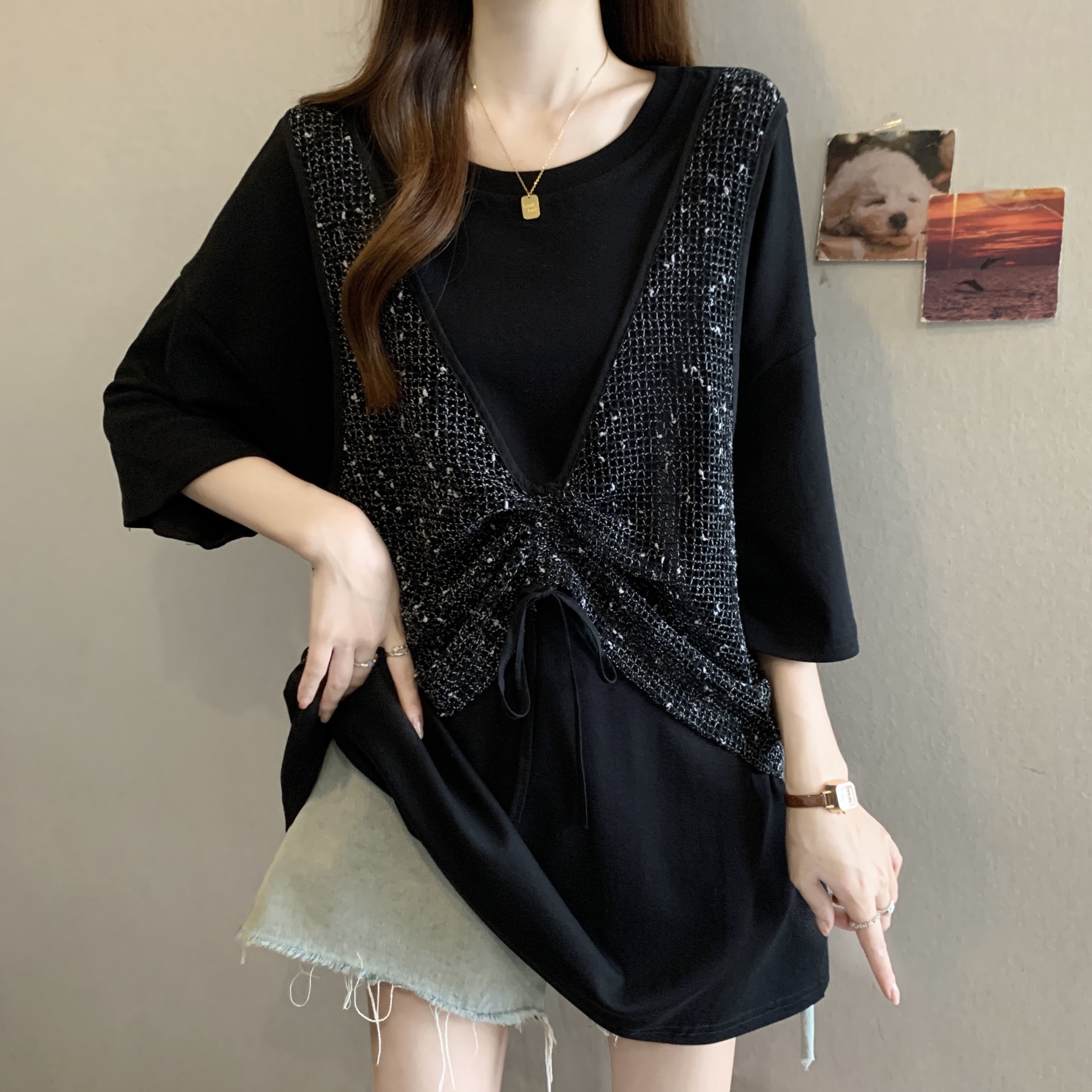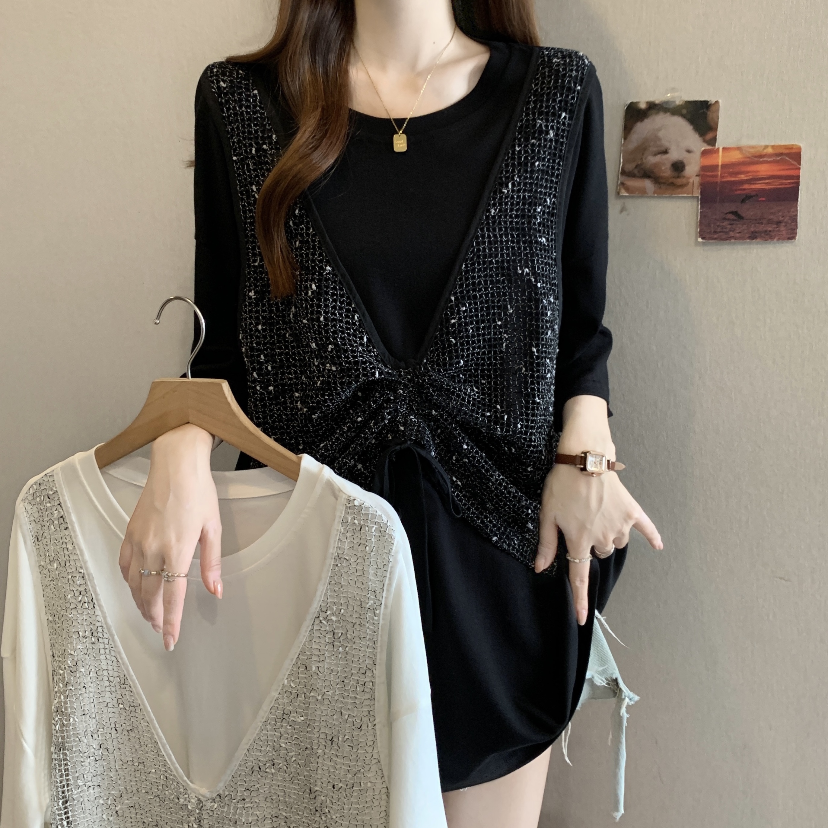 실사 빅 사이즈 새로운 디자인 센스 지방 mm 캐주얼 루즈핏 레이스 패치워크 페이크 레이어드 다용도 슬림해 보이는 맨위 여성