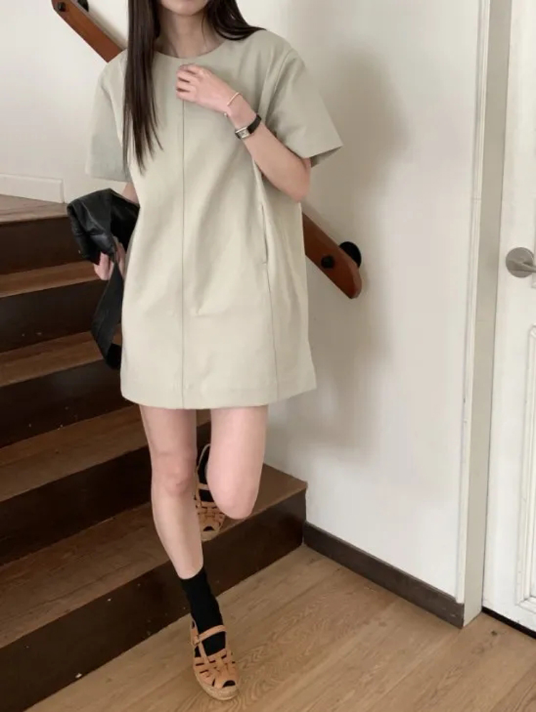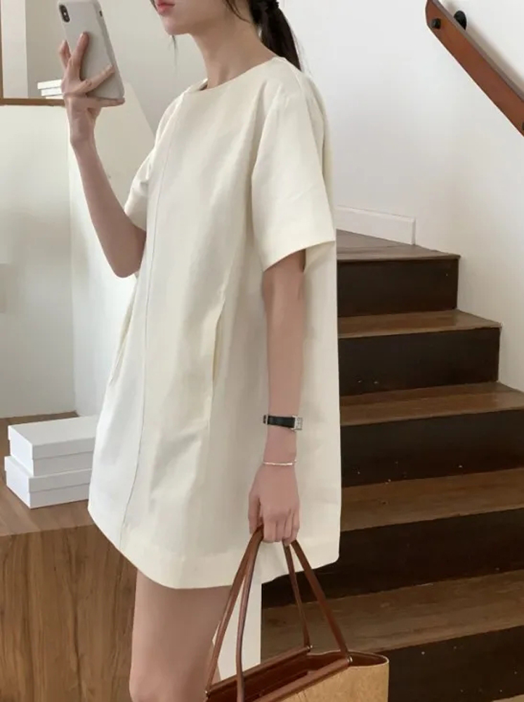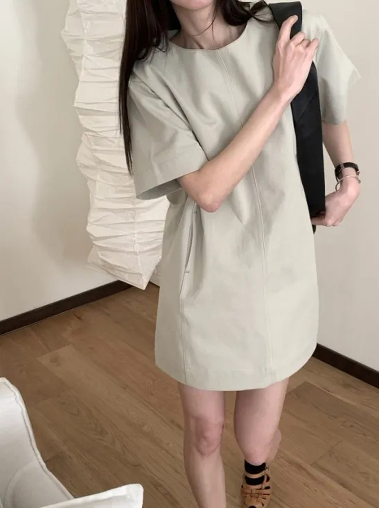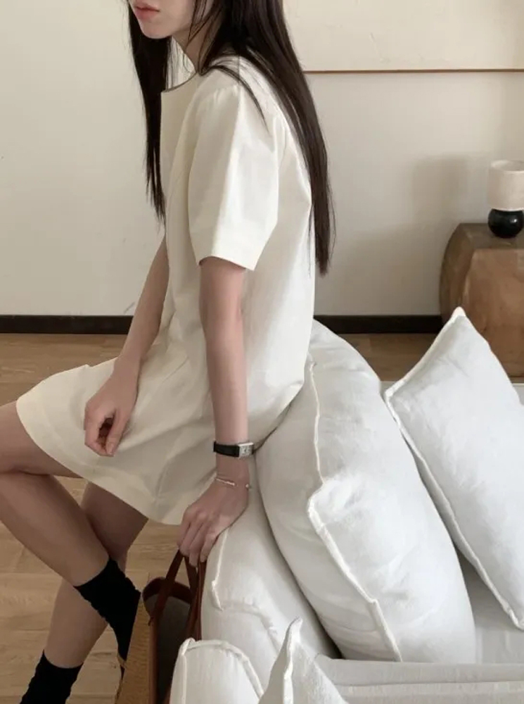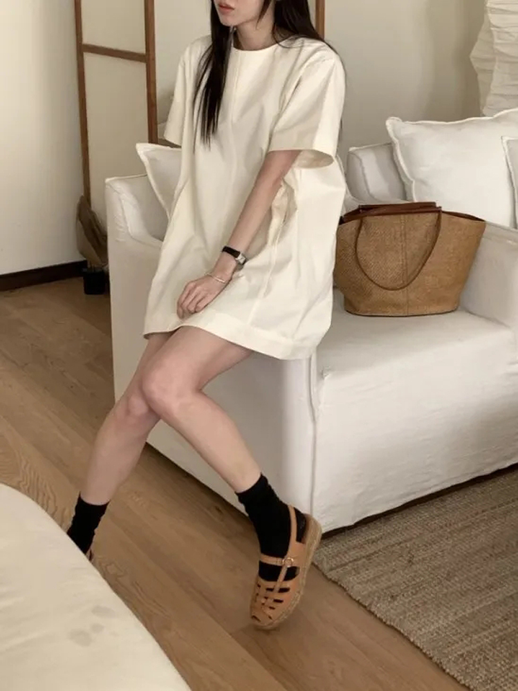 한 부서 익스트림 제인 라운드 넥 반팔 여성 드레스 여름 루즈핏 스트레이트 중간 스커트 캐주얼 다용도 게으른 치마