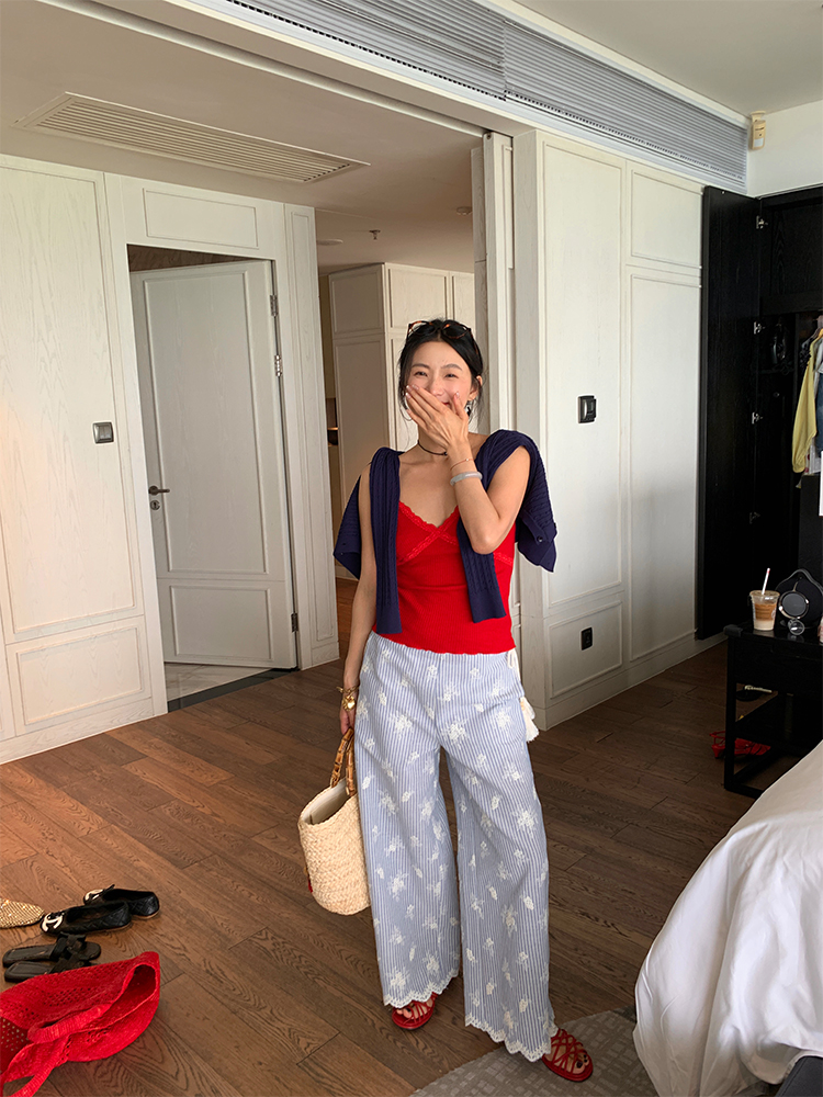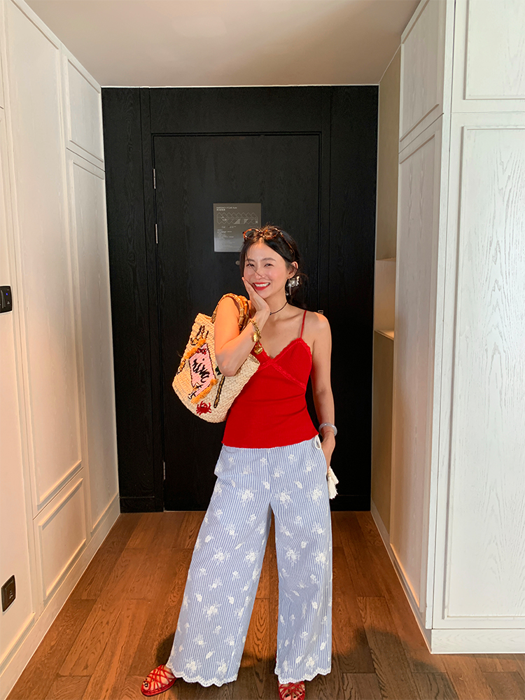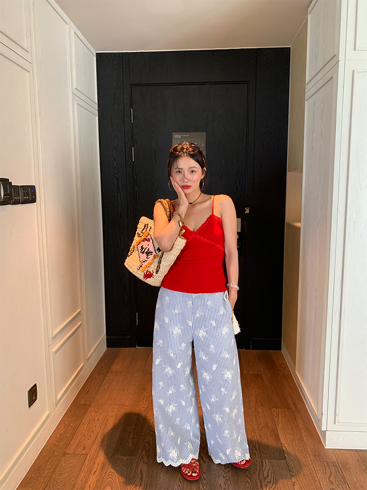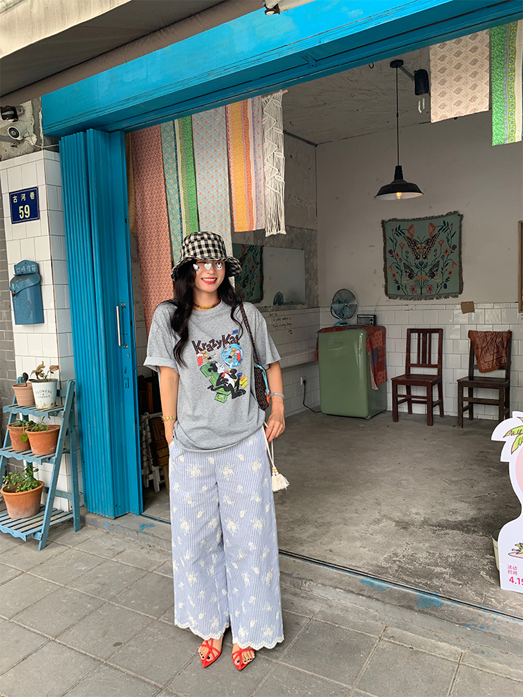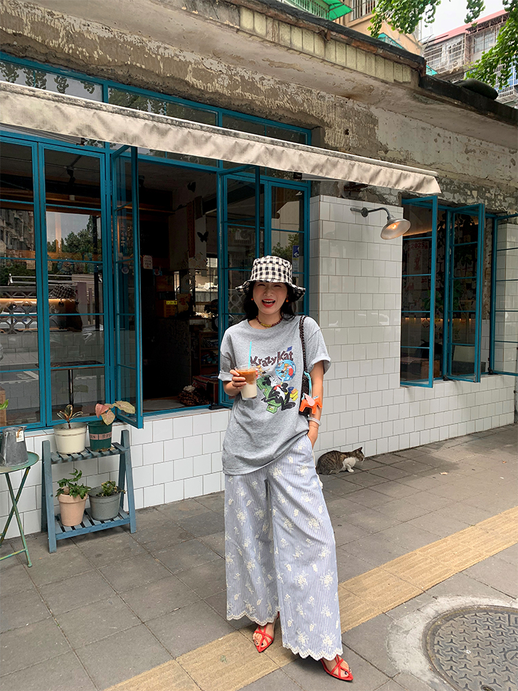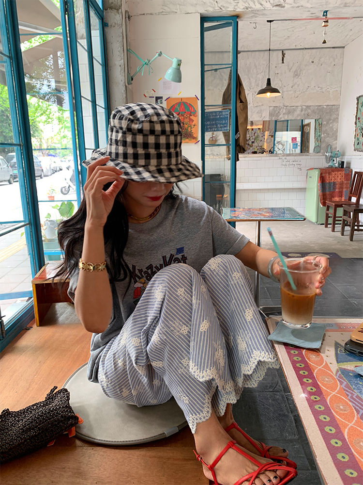 한국 ins 봄 여름 레트로 레이스 패치워크 작은 체크무늬 루즈핏 느긋한 바람 스트레이트 캐주얼 바지