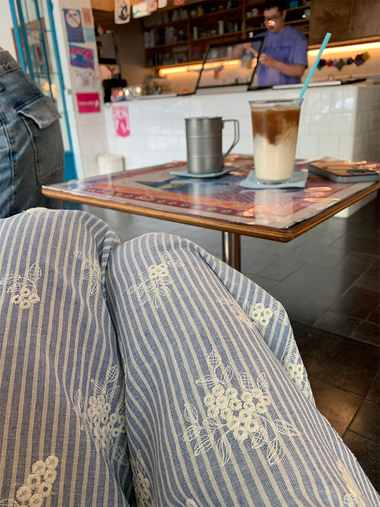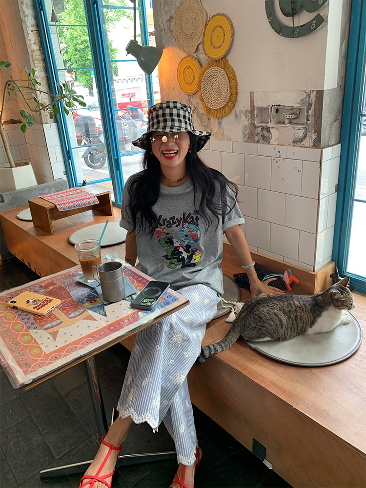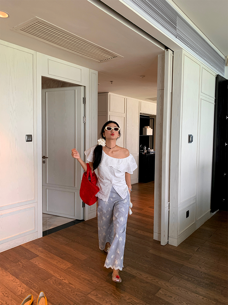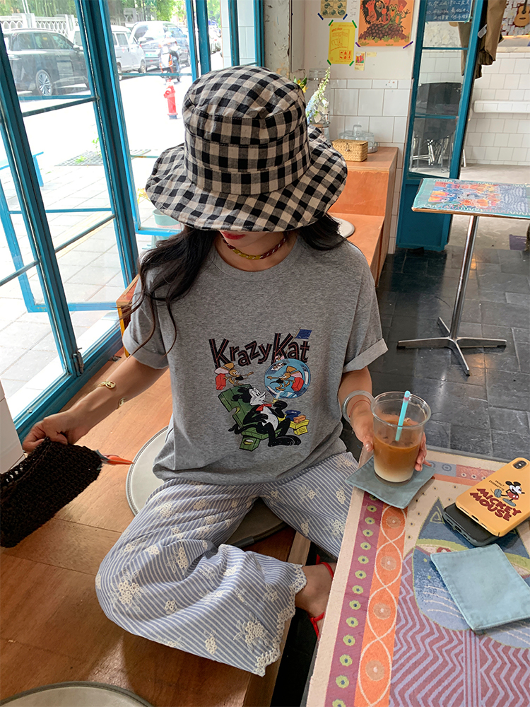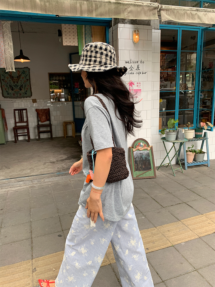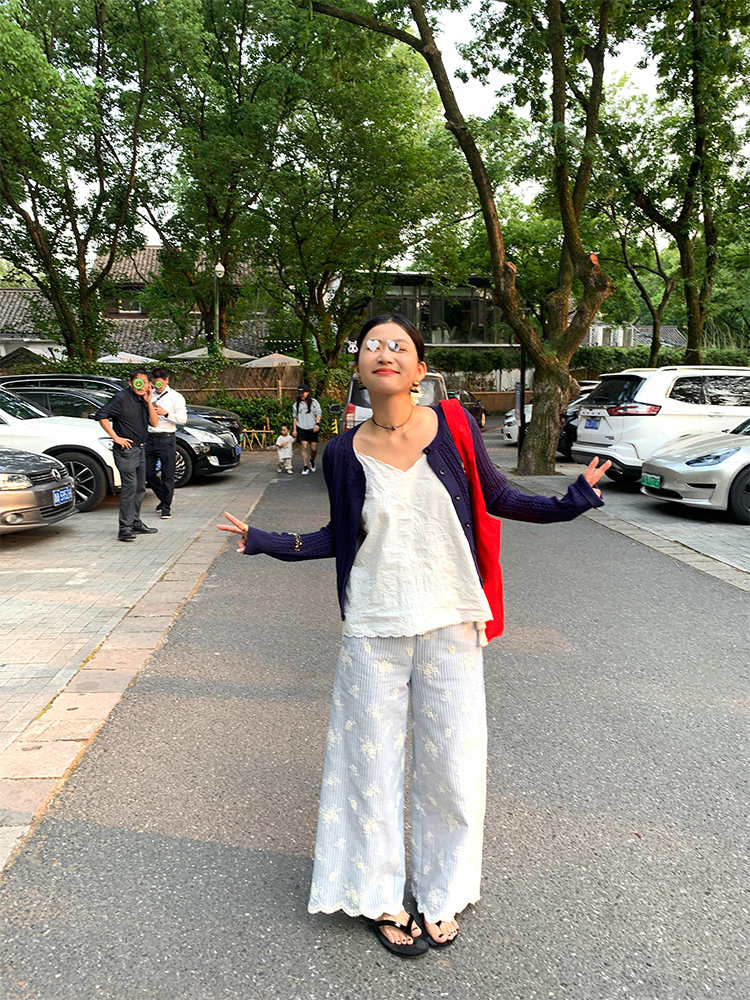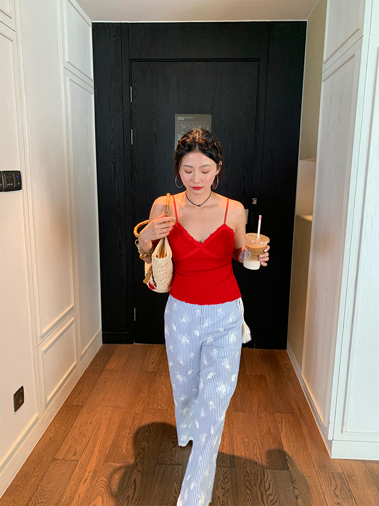 한국 ins 봄 여름 레트로 레이스 패치워크 작은 체크무늬 루즈핏 느긋한 바람 스트레이트 캐주얼 바지