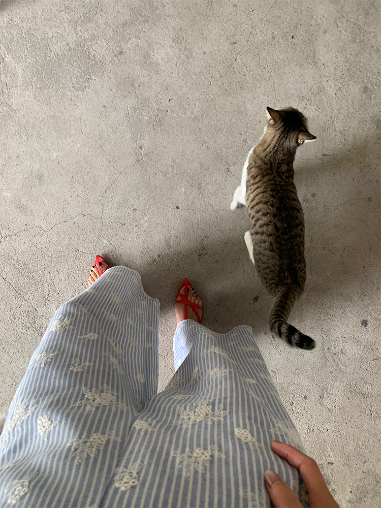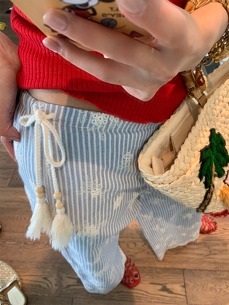 일본식 스트라이프 와이드 레깅스 바지 여름 섹션 하이웨이스트 루즈핏 느긋한 도루 센스 바닥 청소 다용도 캐주얼 바지 작은 키