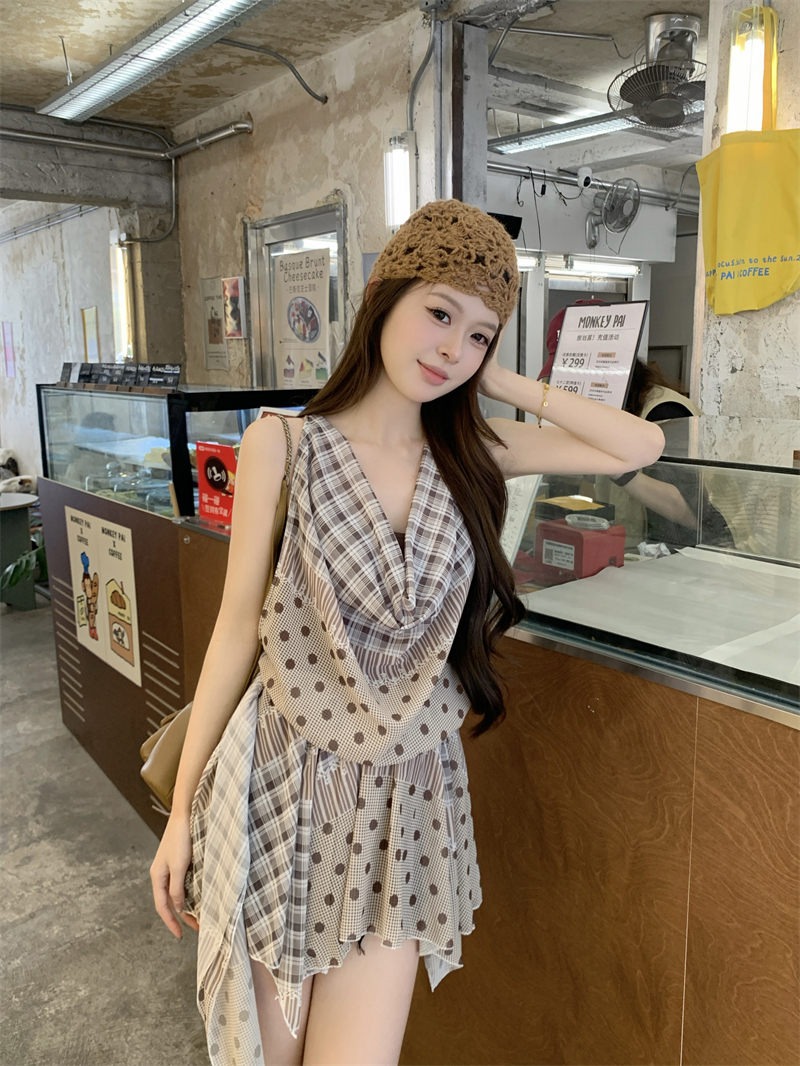 실사 정가 한 부서 무거운 작업 체크무늬 더블 목이버섯 레이스 패치워크 체크무늬 miu 부서 반신 중간 스커트