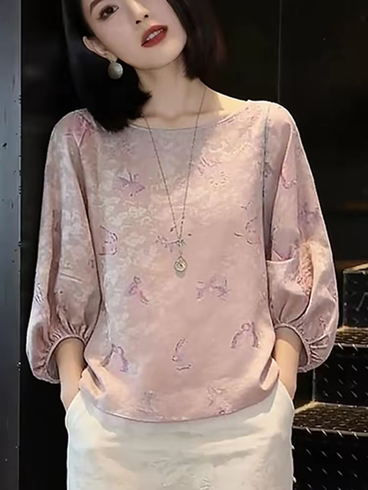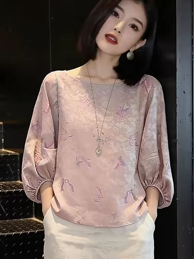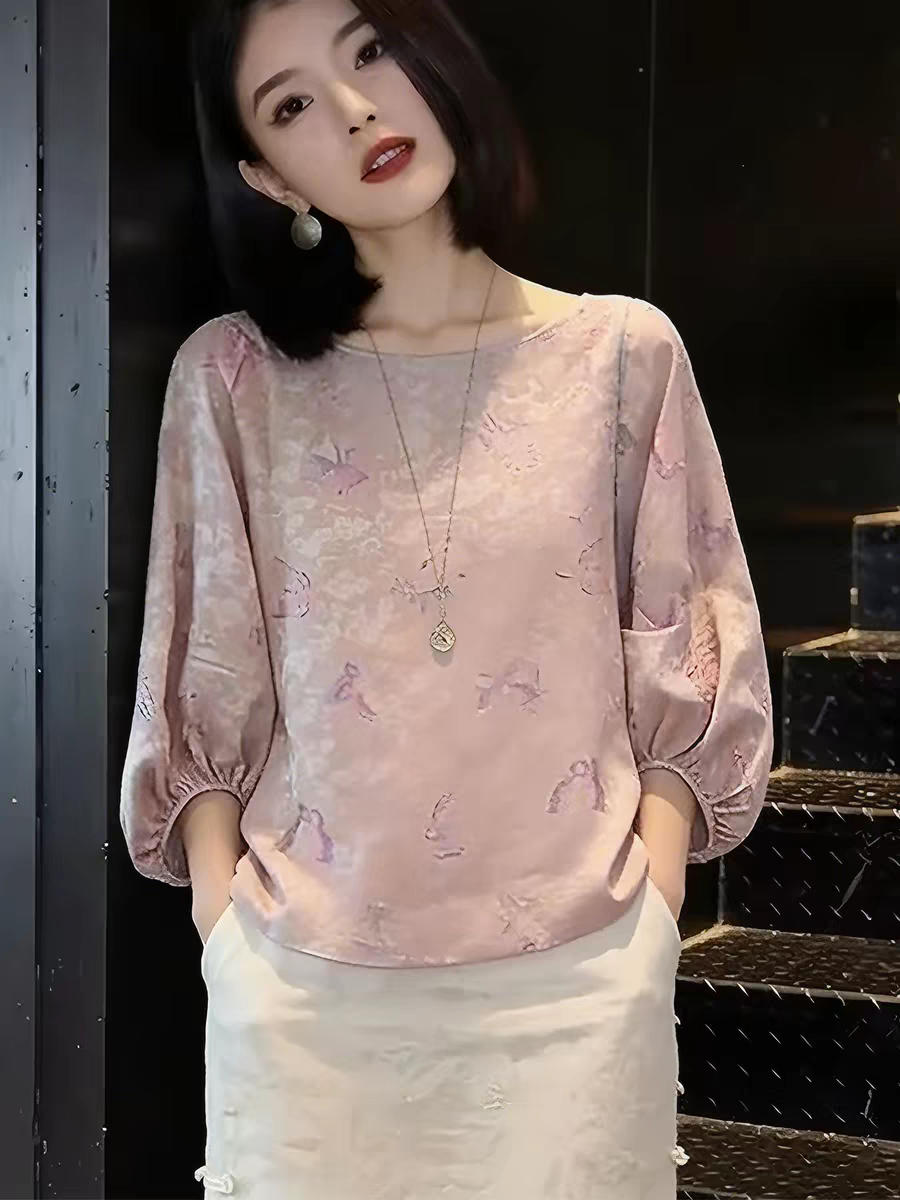 2026 봄 새로운 새로운 중식 바람 고유 한 Chic 자이언트 잘 생긴 분위기 센스 스탠드 칼라 7부 소매 핑크색 여성 셔츠
