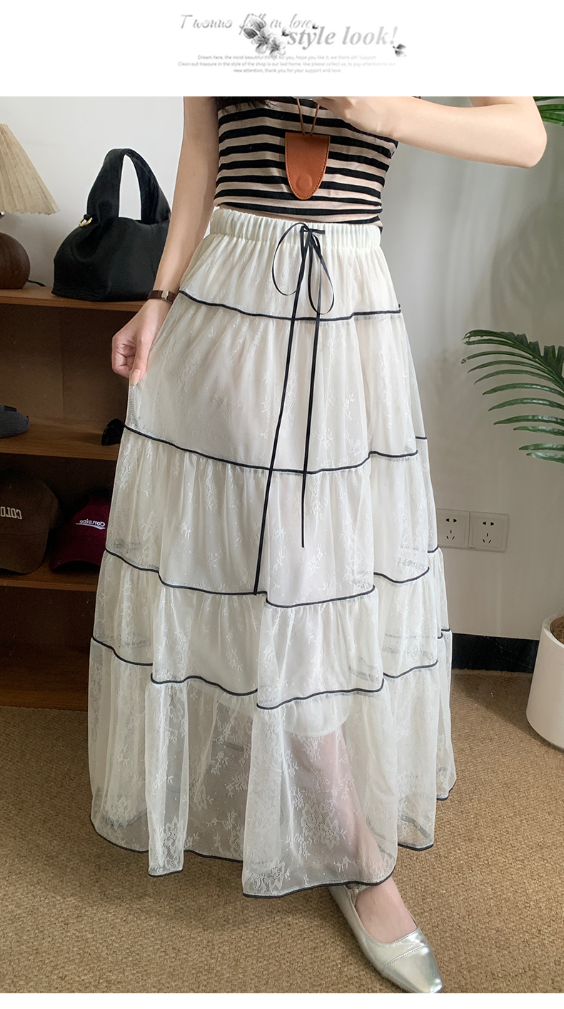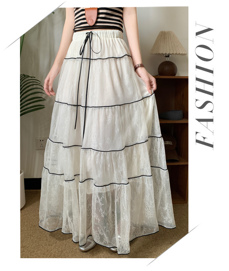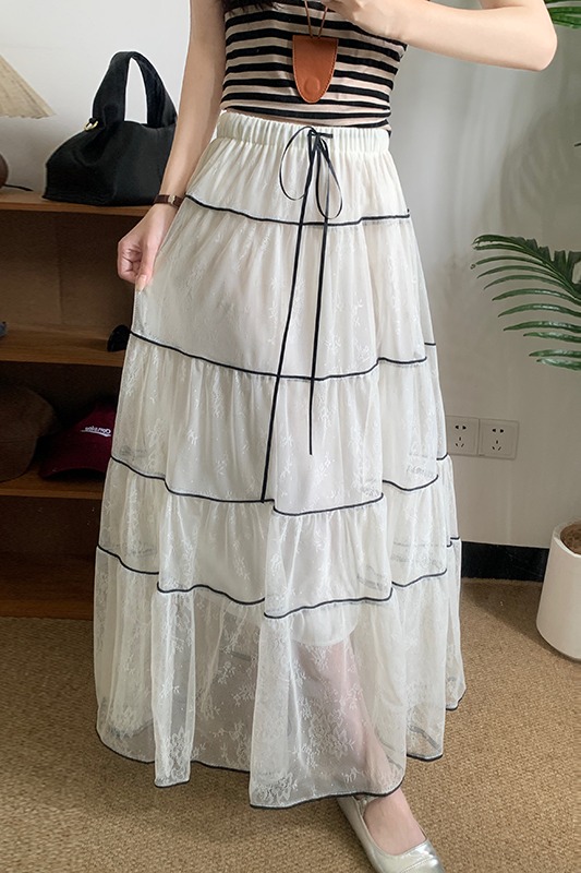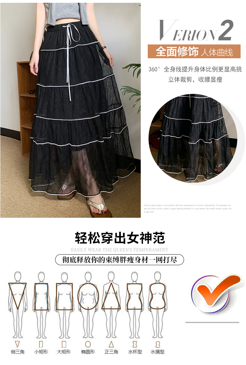 프랑스식 레이스 반신 스커트 빅 사이즈 여성 의류 하이웨이스트 슬림해 보이는 패치워크 거즈 스커트 품격 우아한 롱 스커트 플리츠 빅 플레어 스커트