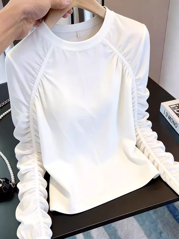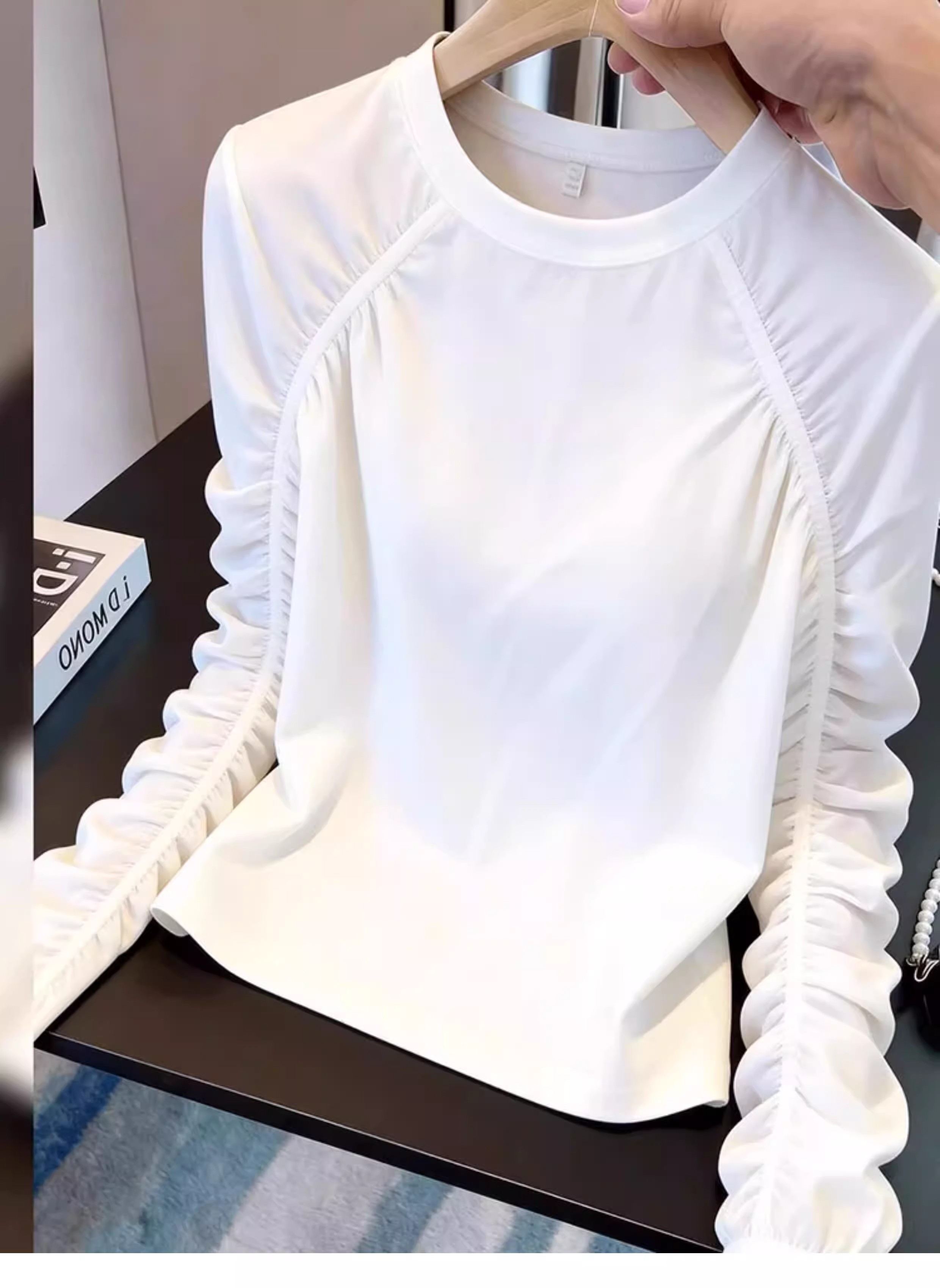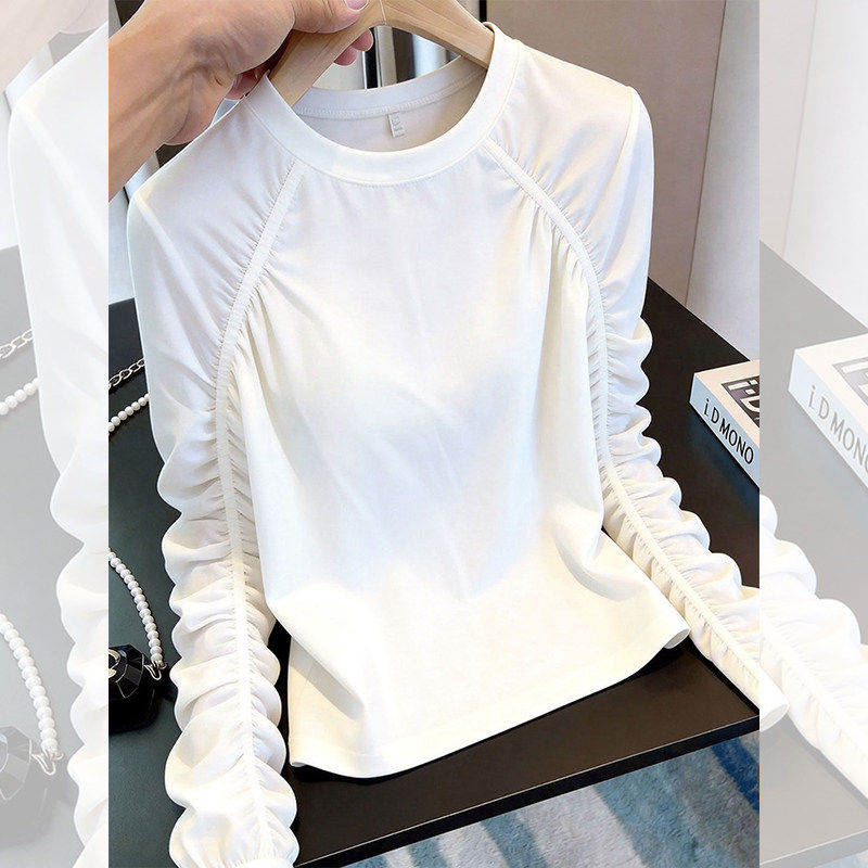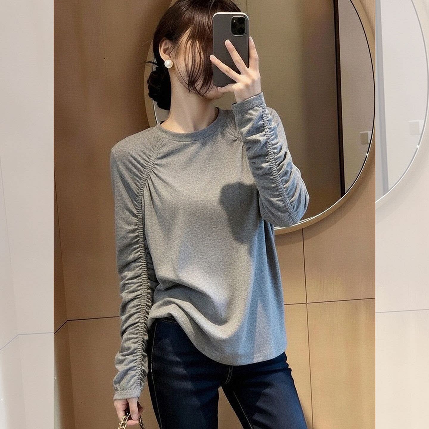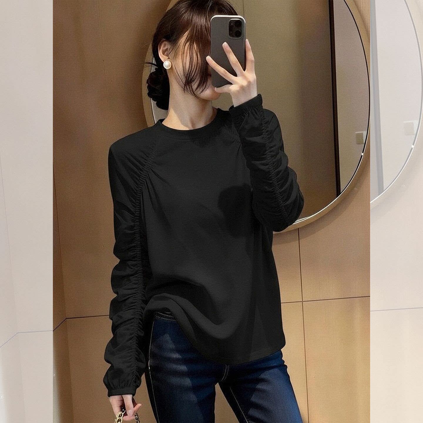 새로운 조수 브랜드 이리저리 떠다니다 번쩍였다 조각 작은 옷 여성 의류 조기 봄 파란색 쇼트 스타일 펌프 Pleat 인사이드 가져 가라. 긴팔 티셔츠 맨위