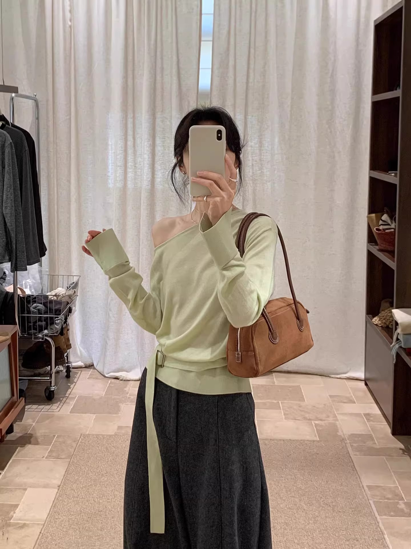 brivin 한 부서 밝은 녹색 비스듬한 어깨 니트 스웨터 여성 2026 봄 새로운 조심해. 기계 허리 수축 슬림해 보이는 외국 가스 맨위