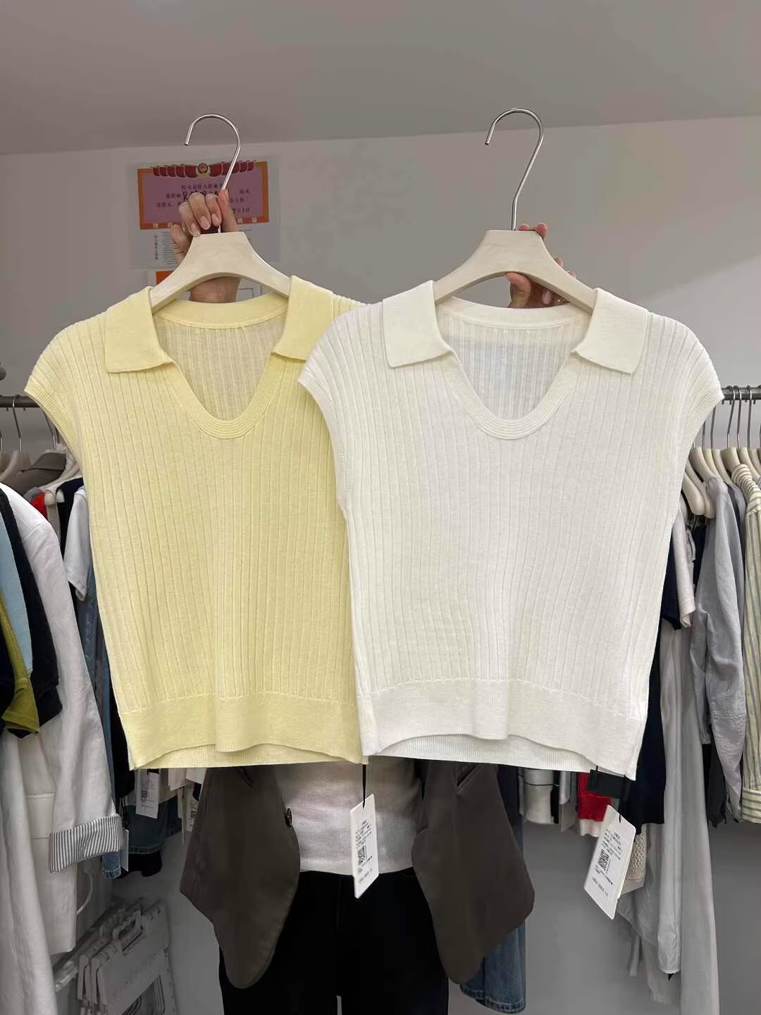 2026 봄 여름 한 부서 POLO 칼라 양모 반팔 니트 스웨터 여성 u 칼라 얇은 스타일 슬림해 보이는 다용도 티셔츠 맨위