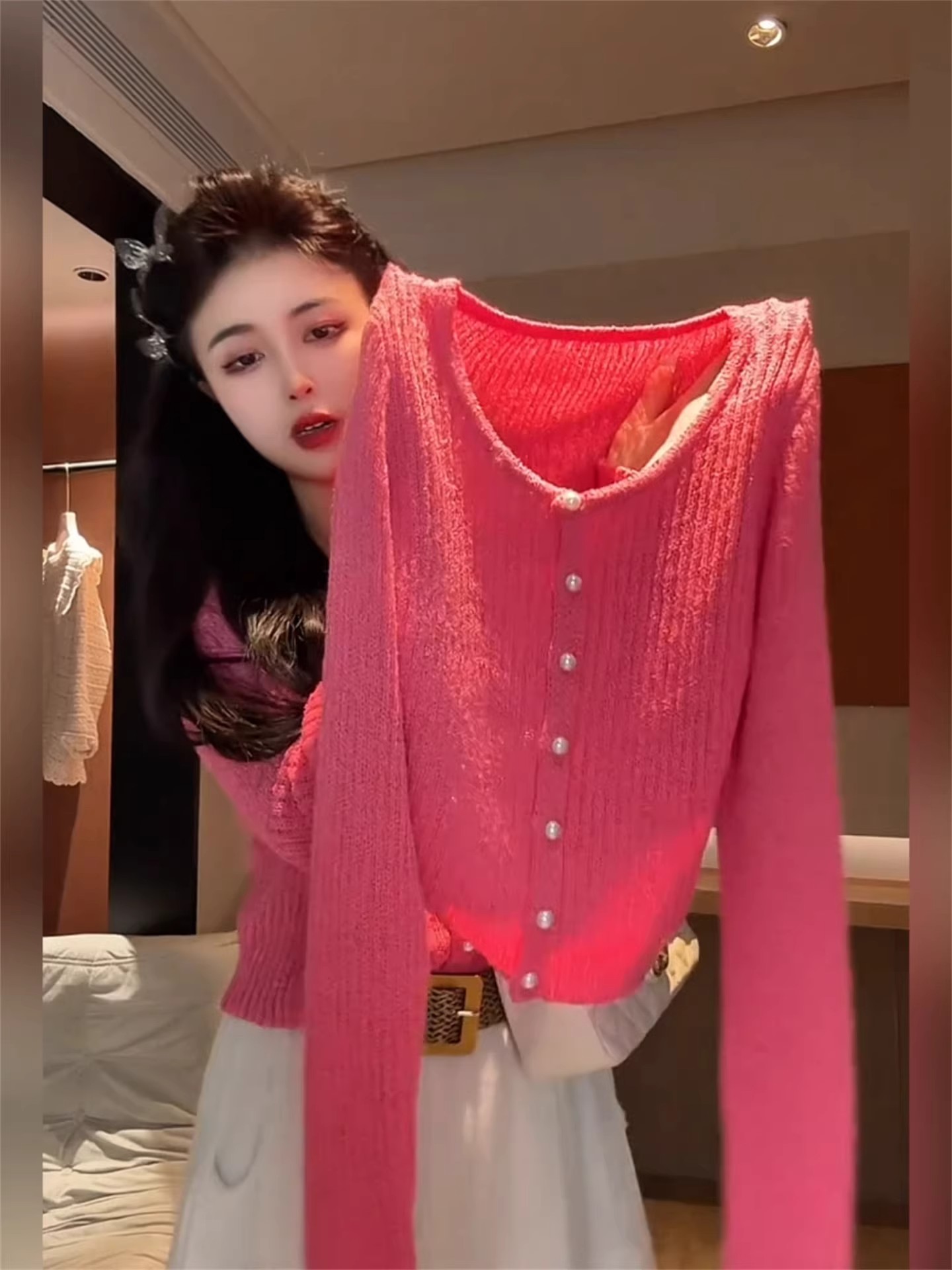 한 부서 고유 한 아름다운 핑크색 진주 버클 니트 오픈 가디건 여성 코트 이른 봄 부드러운 다용도 쇼트 스타일 긴팔 맨위