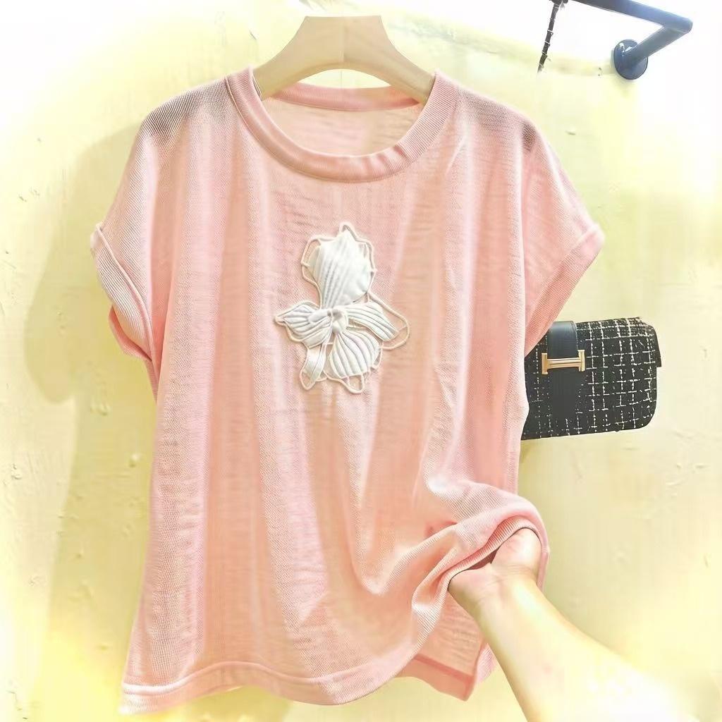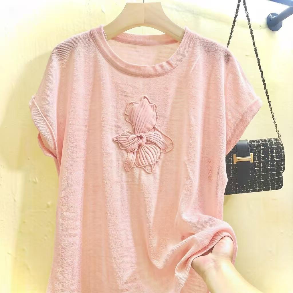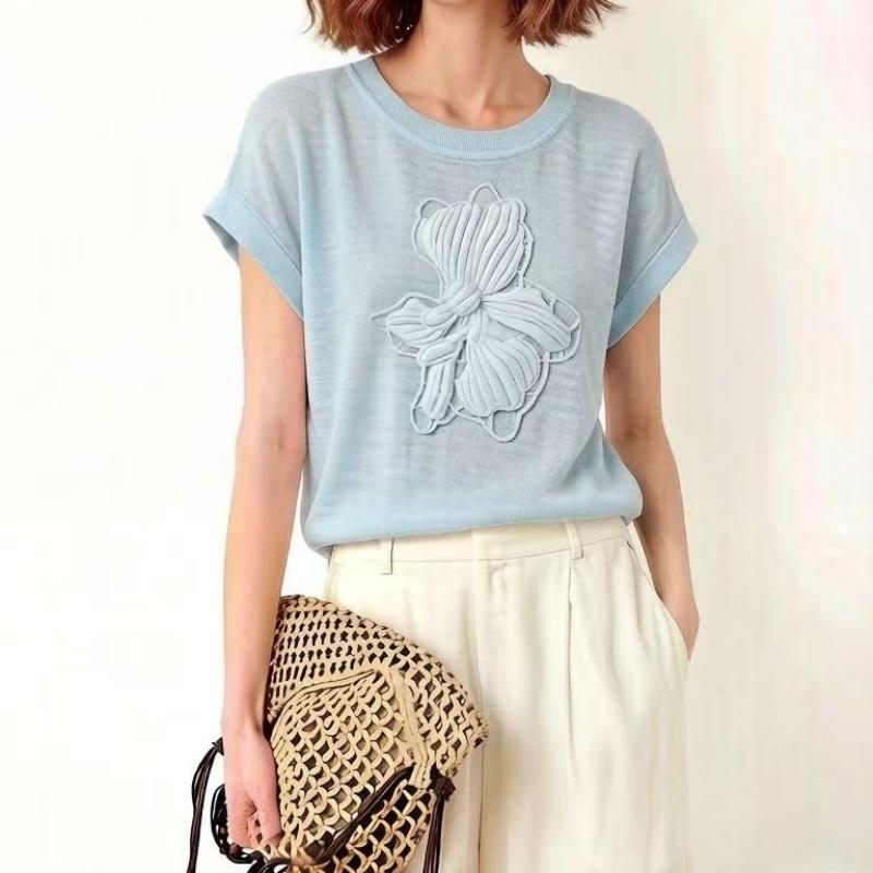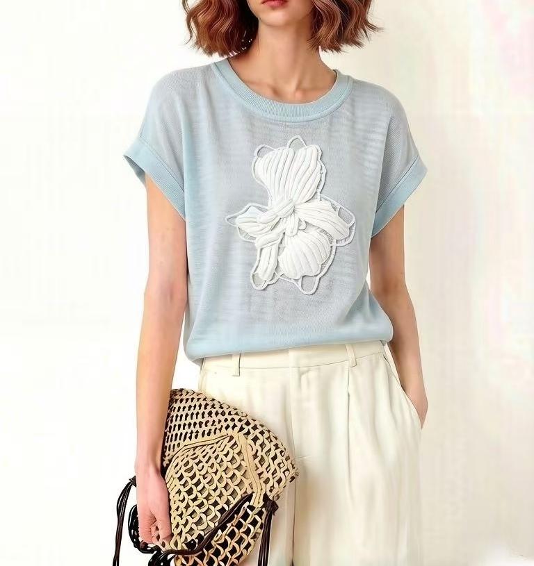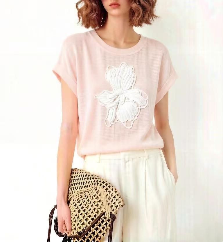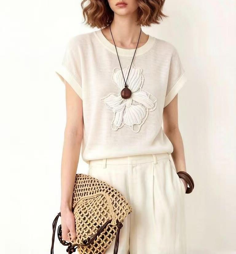 mz 작은 키 레이스 꽃 장식 항공기 소매 26 여름 신제품 아마 라운드 넥 여성 티셔츠 니트 스웨터