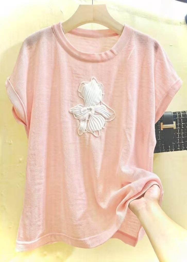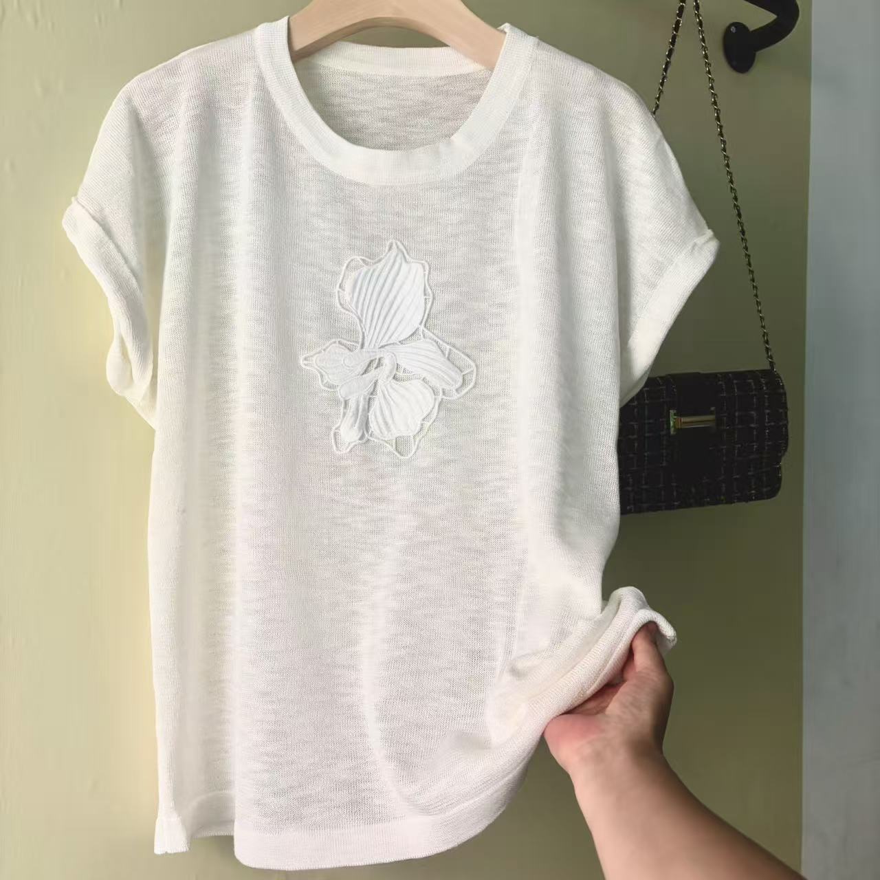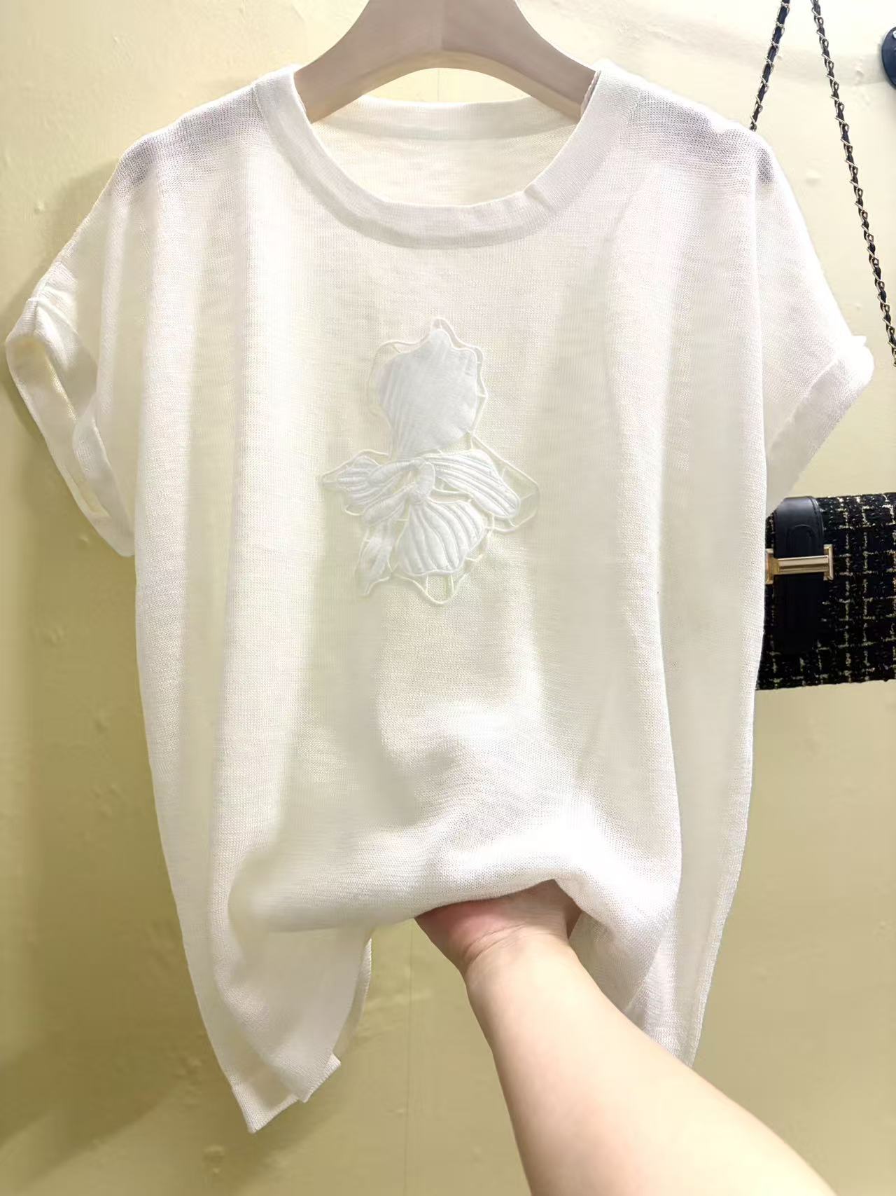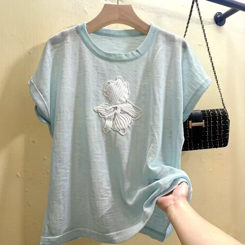 mz 작은 키 레이스 꽃 장식 항공기 소매 26 여름 신제품 아마 라운드 넥 여성 티셔츠 니트 스웨터