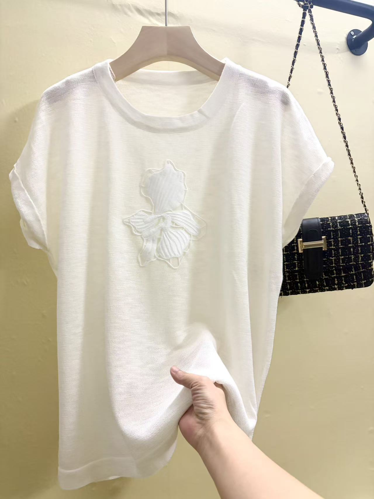 라운드 넥 2026 여름 신제품 반팔 자수 장식 티셔츠 니트 통기성 풀오버