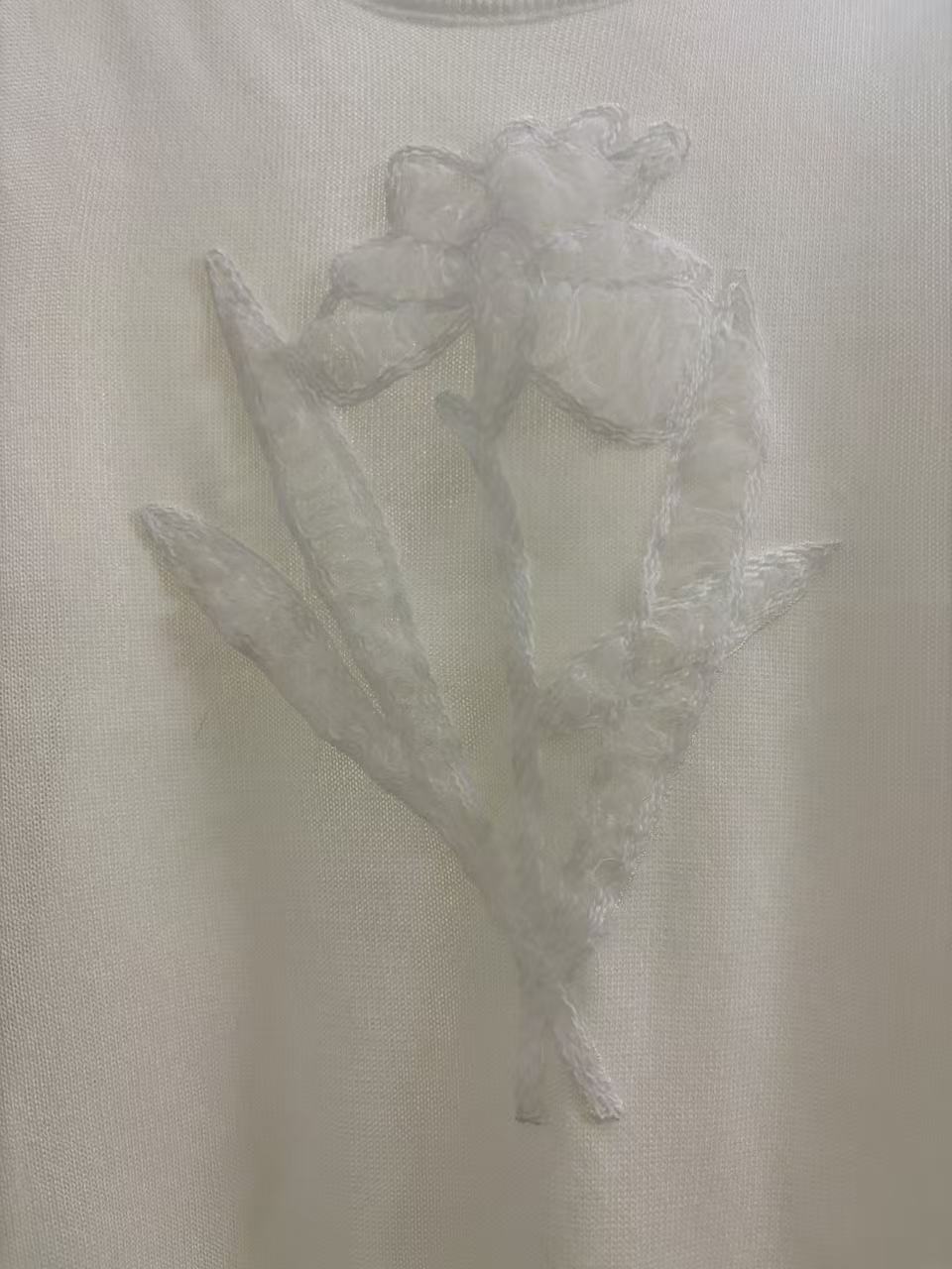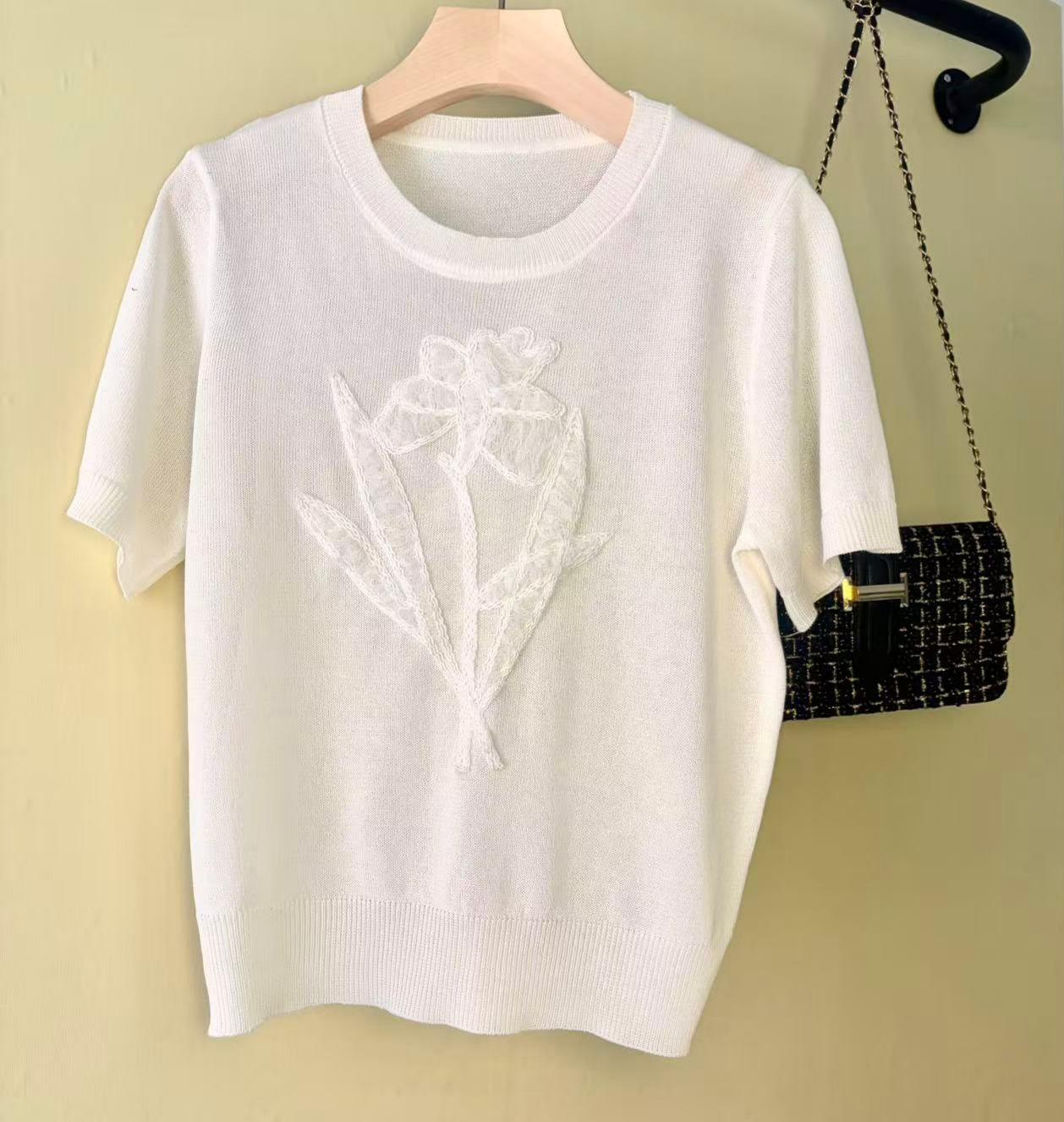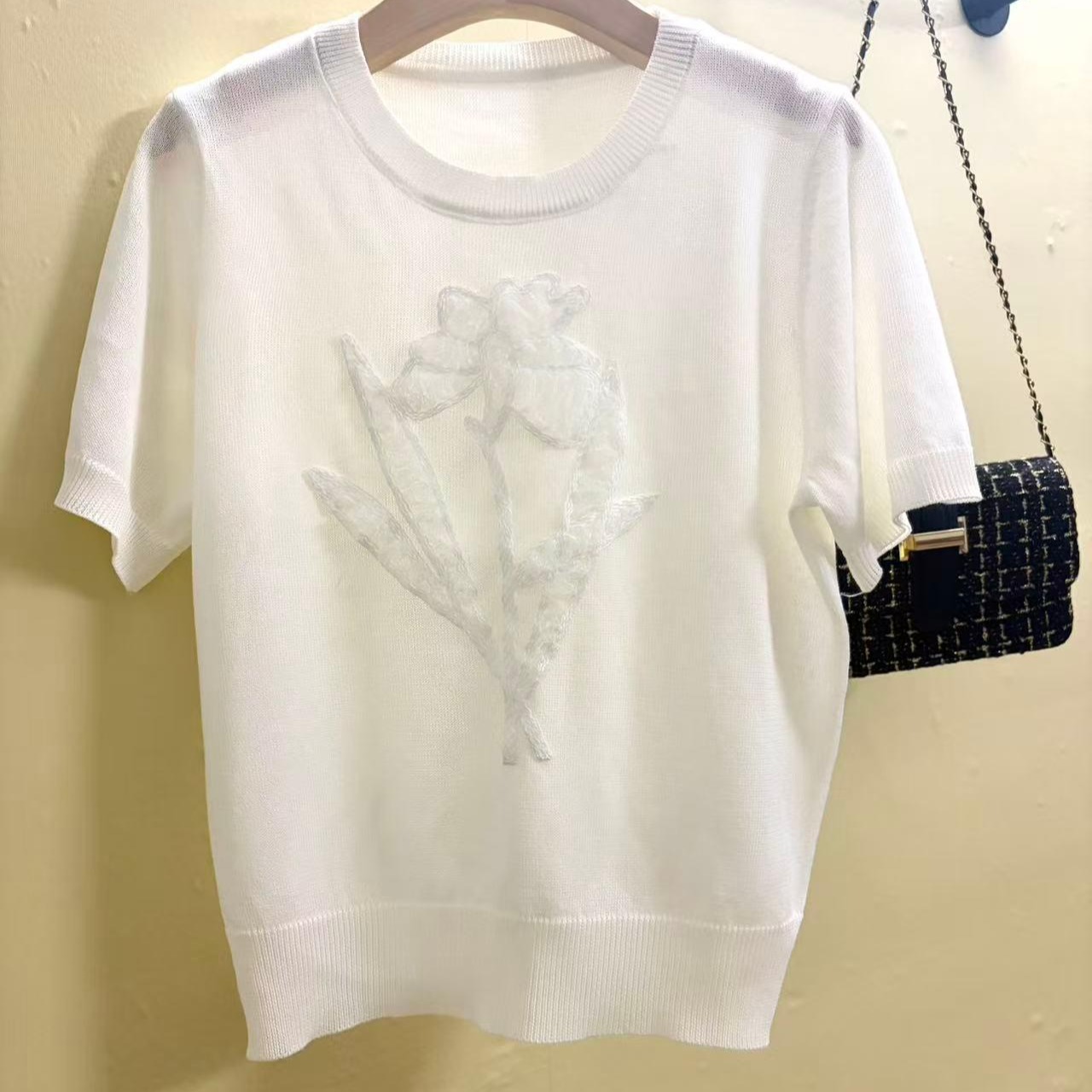 mz 작은 키 레이스 꽃 장식 항공기 소매 26 여름 신제품 아마 라운드 넥 여성 티셔츠 니트 스웨터