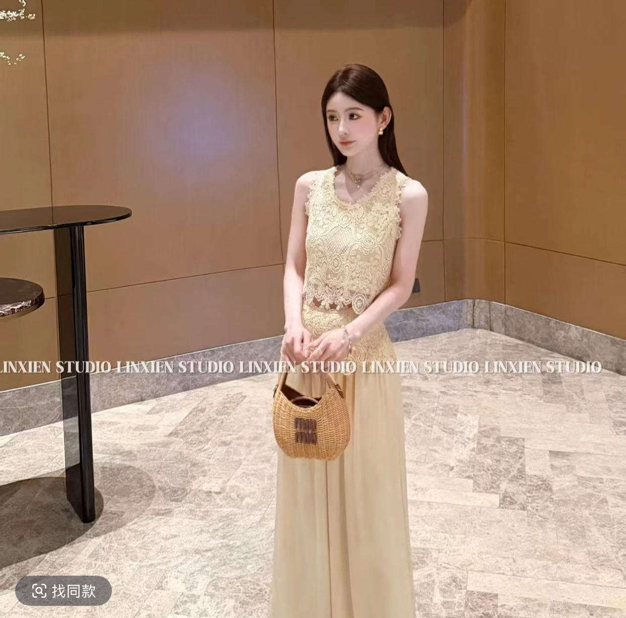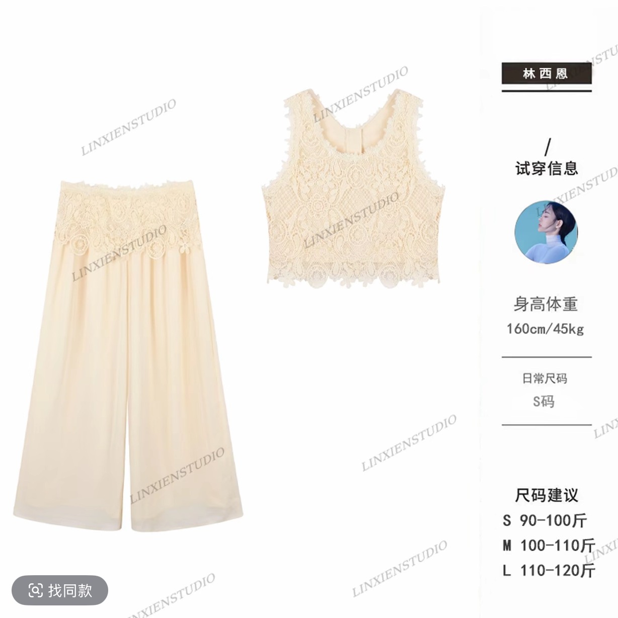 2026 여름 새로운 여성 한 부서 착용 가져 가라. 디자인 센스 V넥 반팔 맨위 다용도 하이웨이스트 슬림해 보이는 넓은 다리 길이 바지