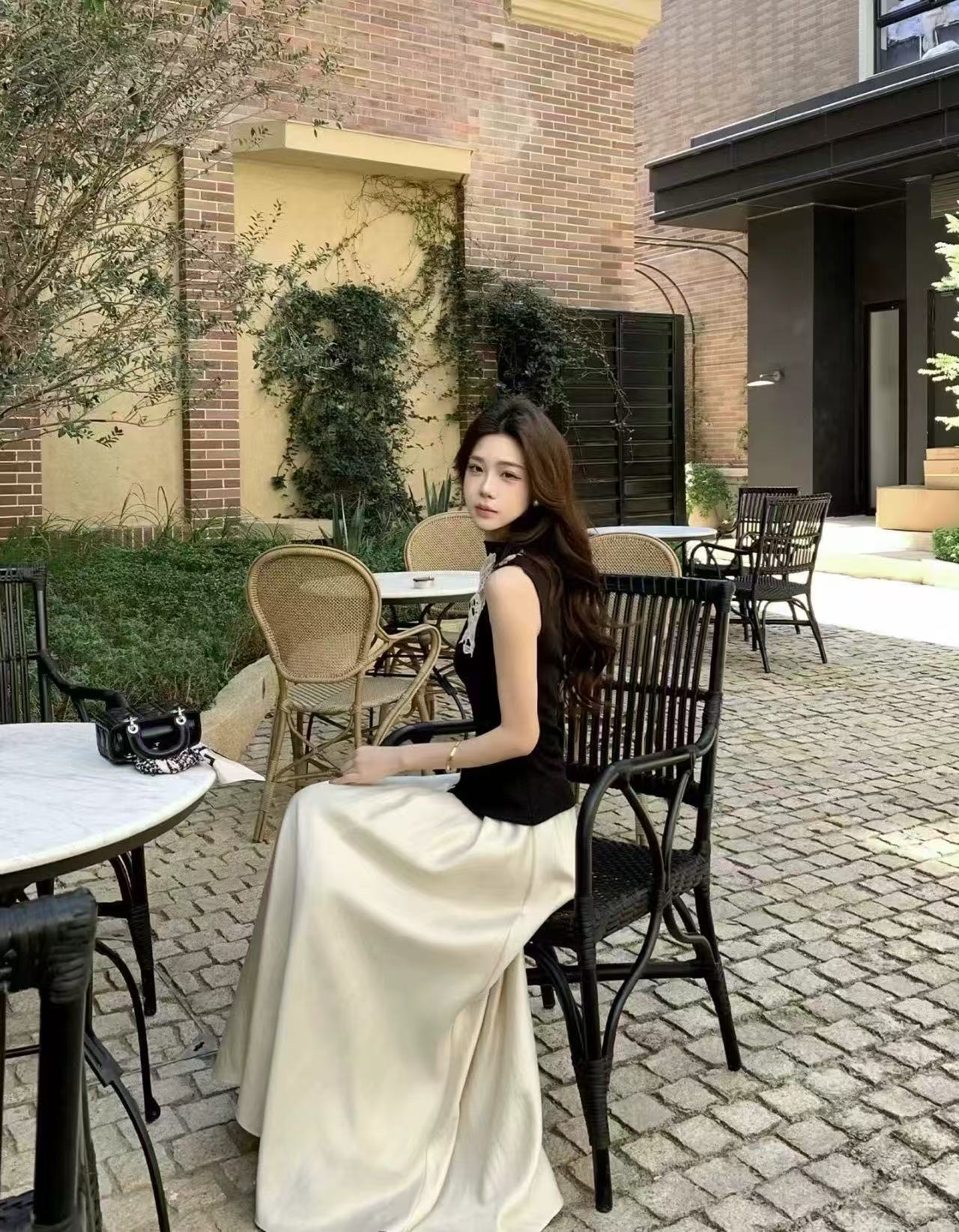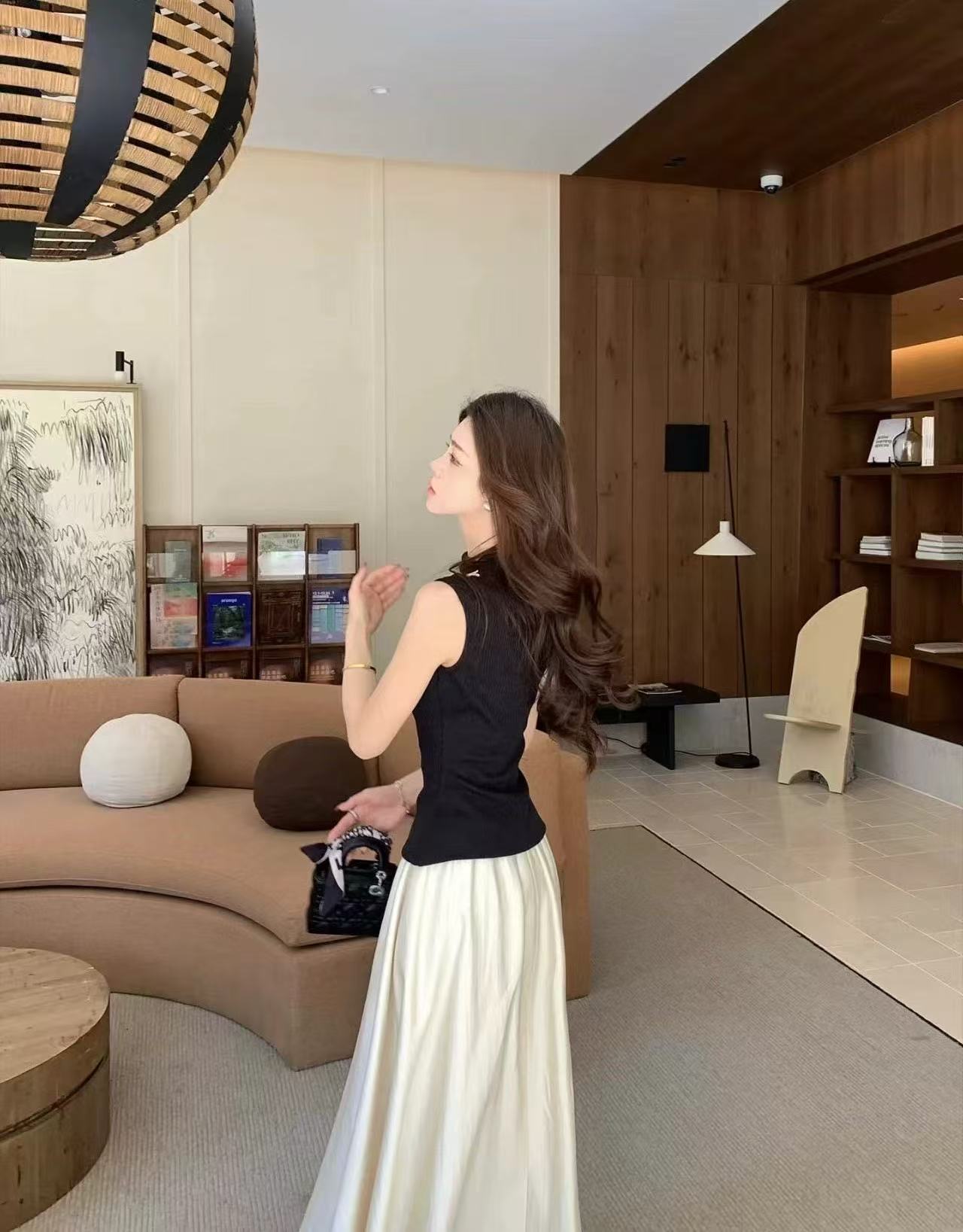 새로운 한국 스타일 패션 캐주얼 스트랩 반팔 맨위 허리밴드 슬림해 보이는 반신 롱 스커트 투피스 세트