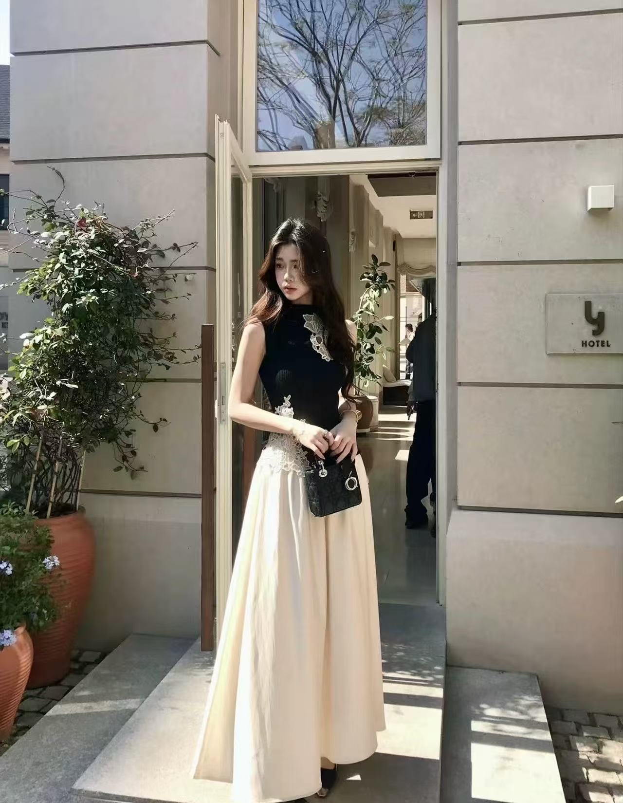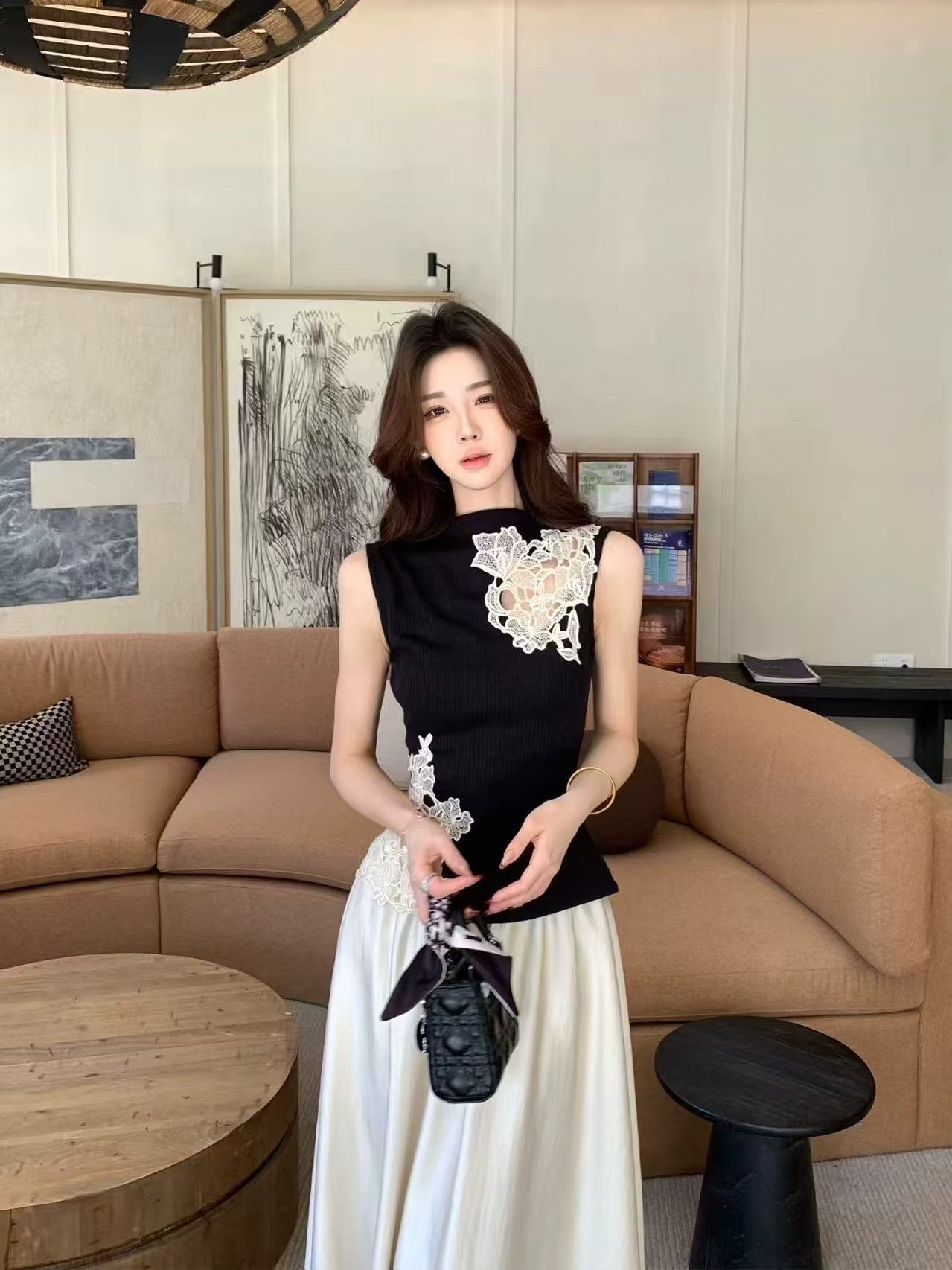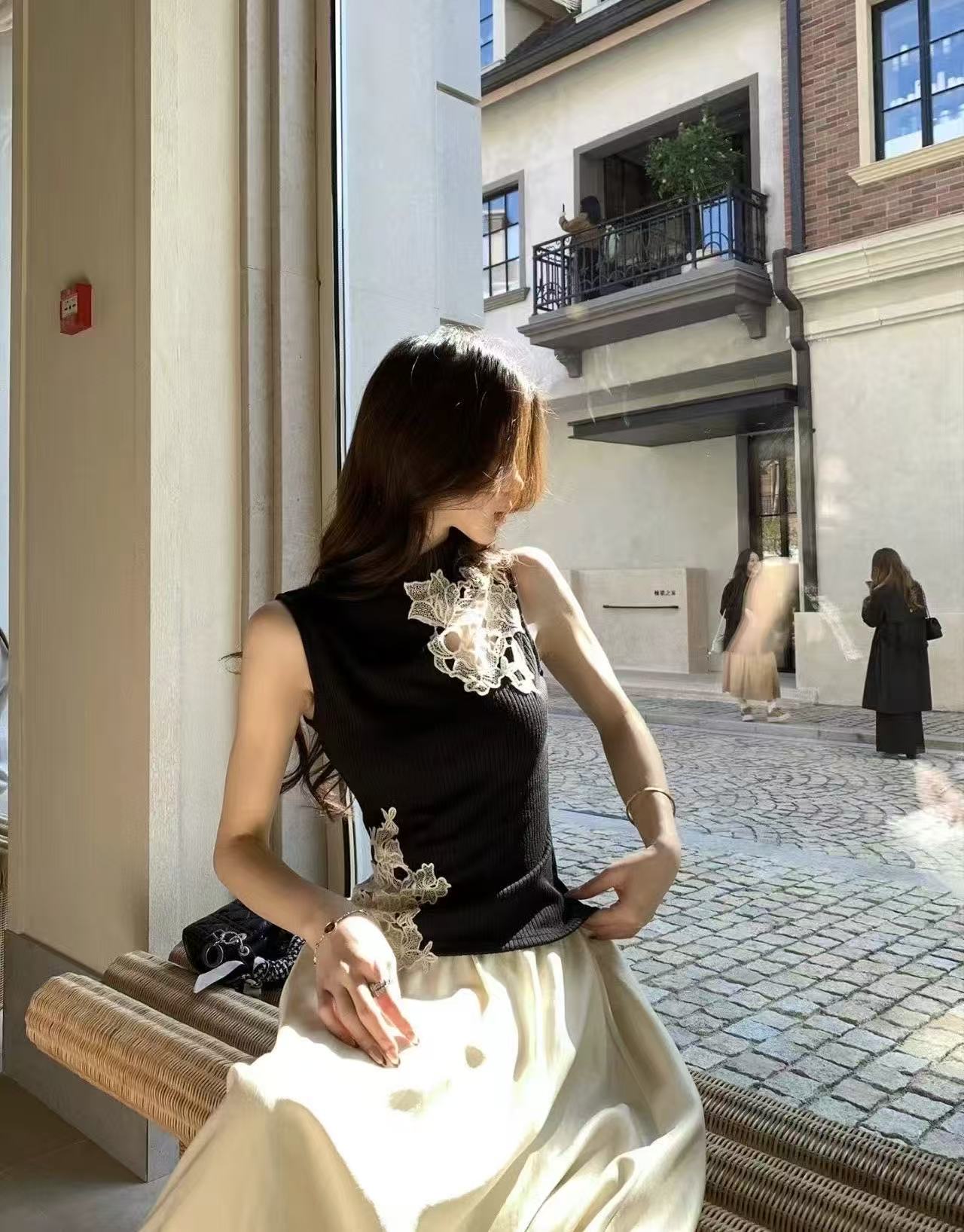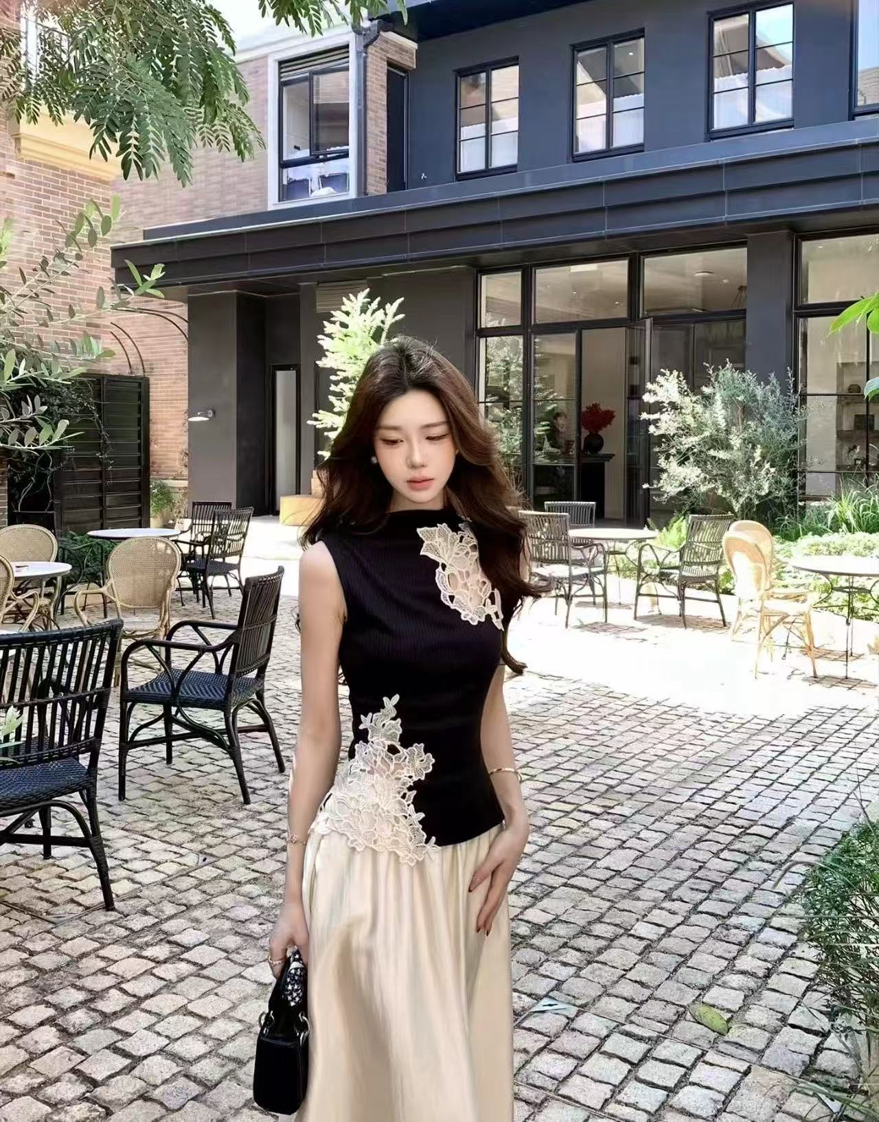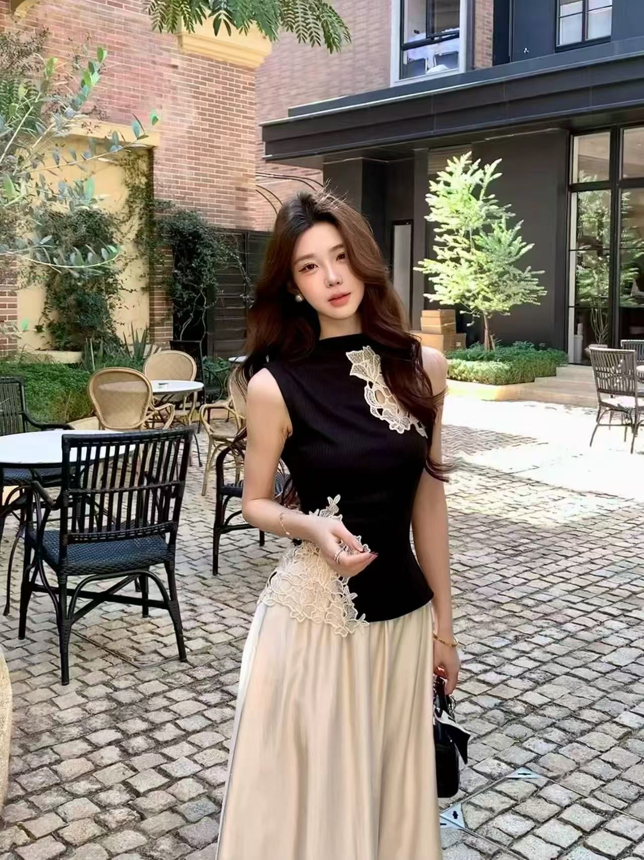 새로운 디자인 센스 몸매 가꾸기 중식 레이스 자수 홀로우 아웃 민소매 조끼 허리밴드 반신 치마 세트