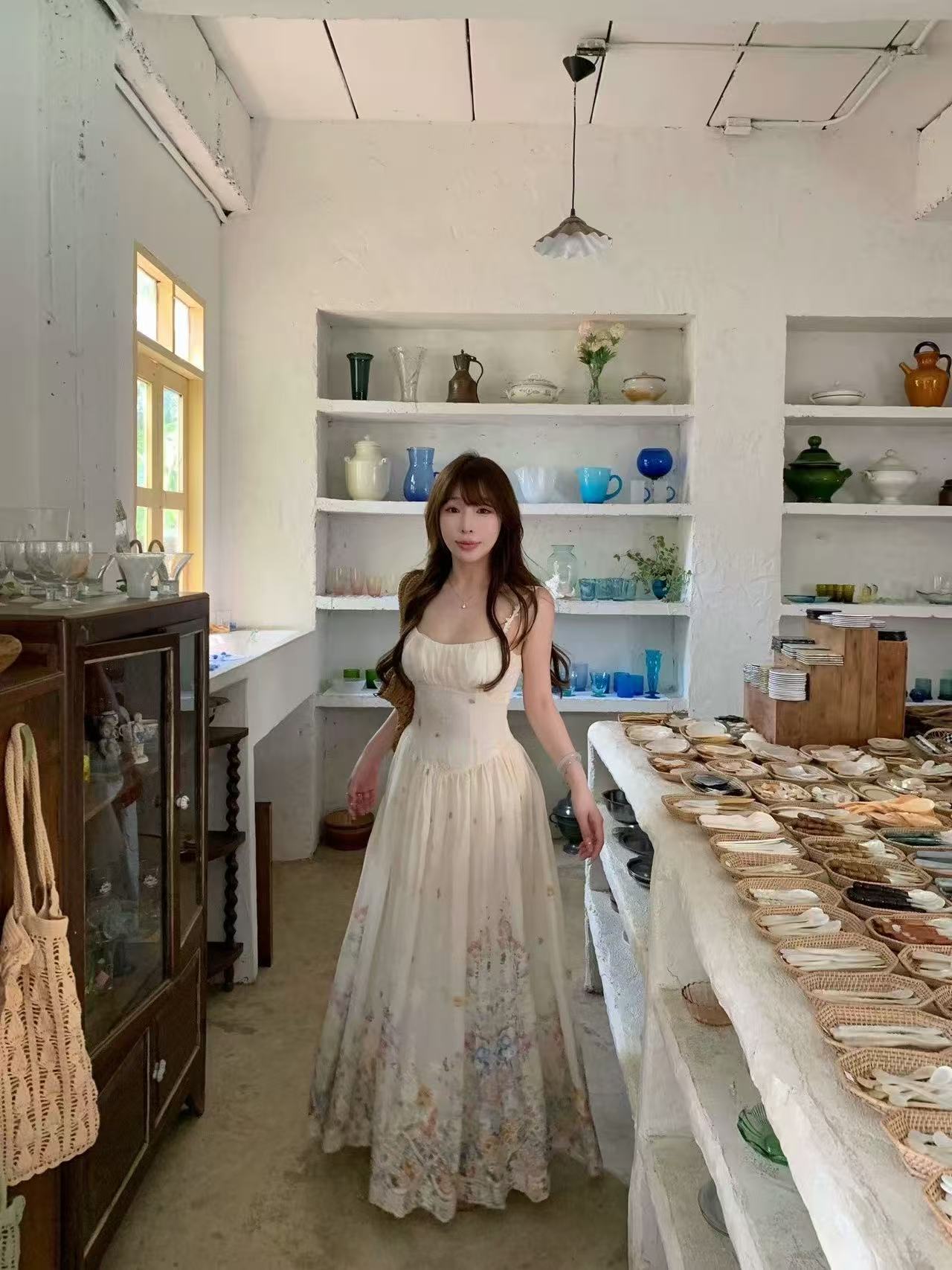새로운 한국 스타일 패션 품격 행침 목 민소매 V넥 하이웨이스트 레이스업 허리 수축 단추 점프 슈트 롱 스커트
